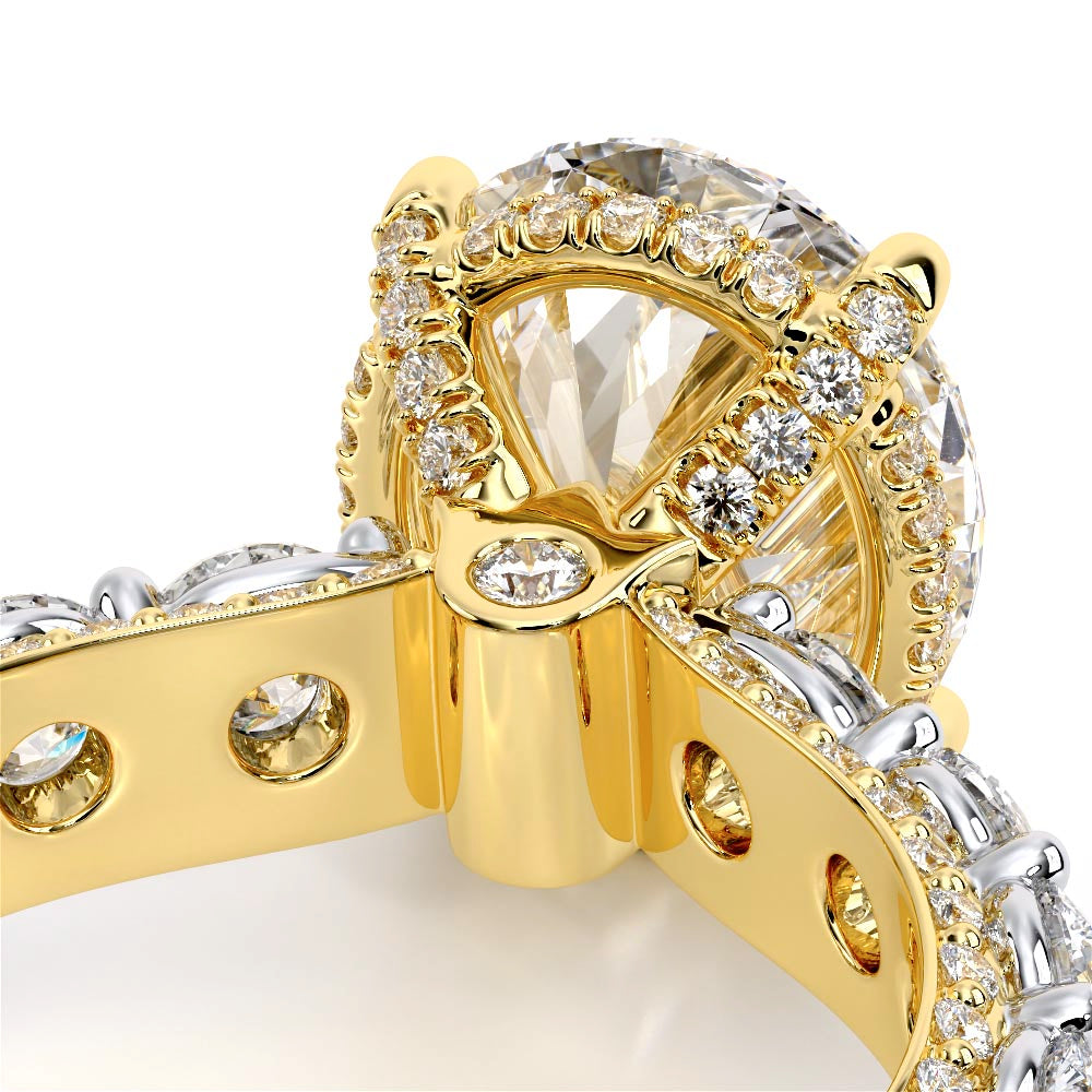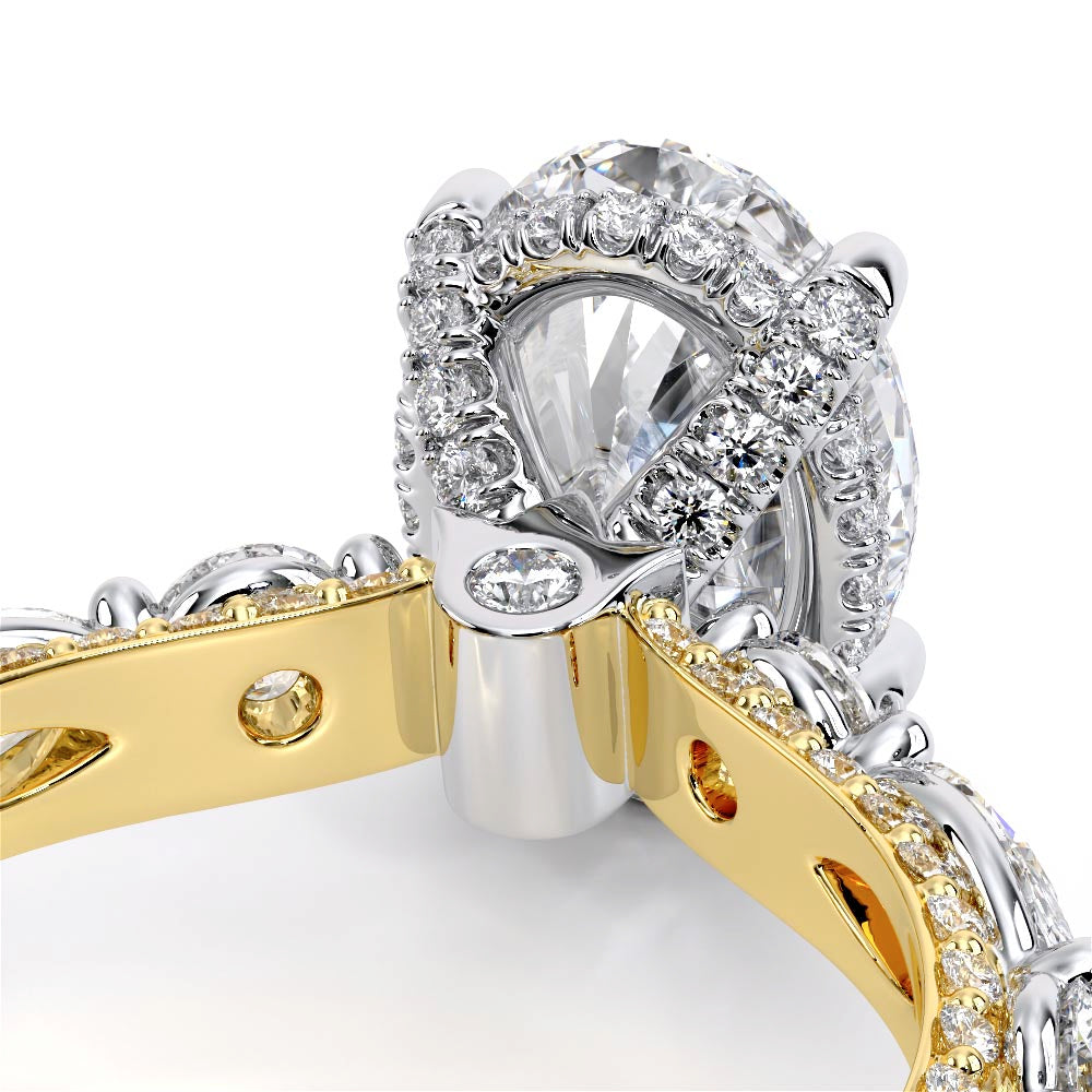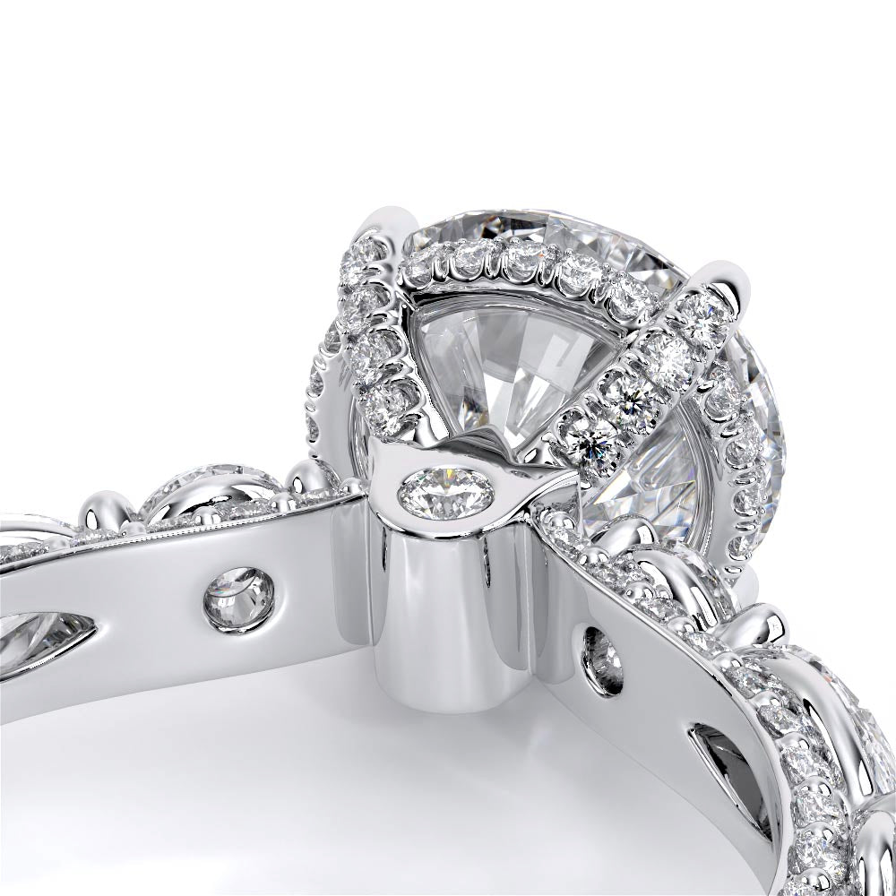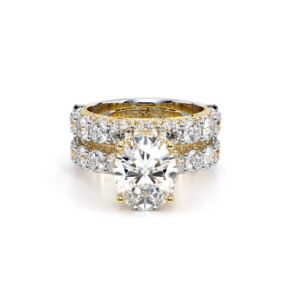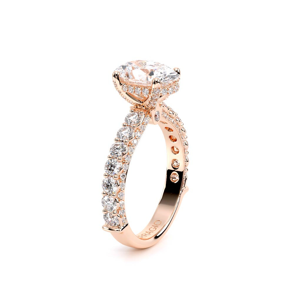 Couture-0489OV-2.5 is an elevated four-prong engagement ring featuring a diamond-bridge head designed to highlight your center stone. Meticulously-set round diamonds in a shared-prong setting wrap the elegant shank, enhanced with a pave-set three-quarter diamond riviera. The Verragio signature crest completes the statement look.
