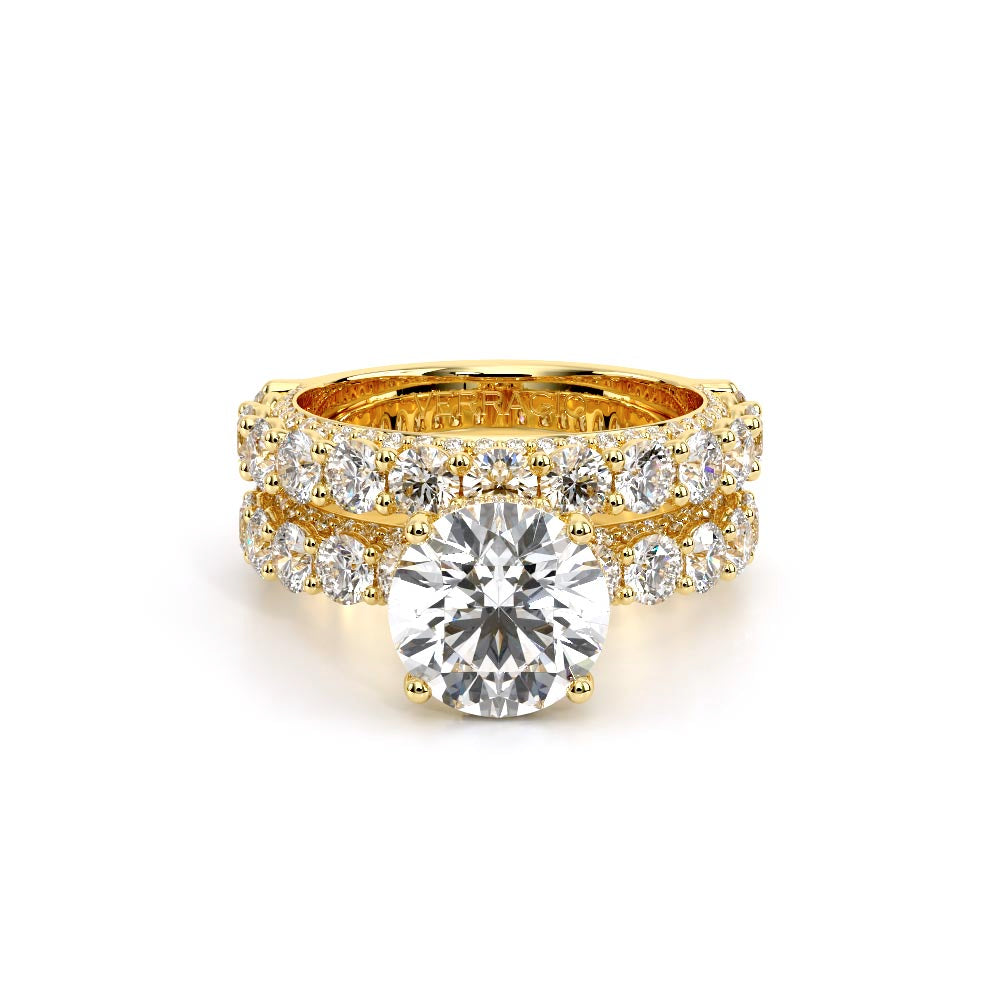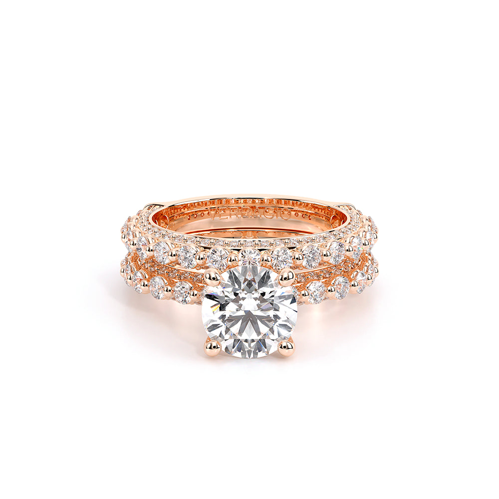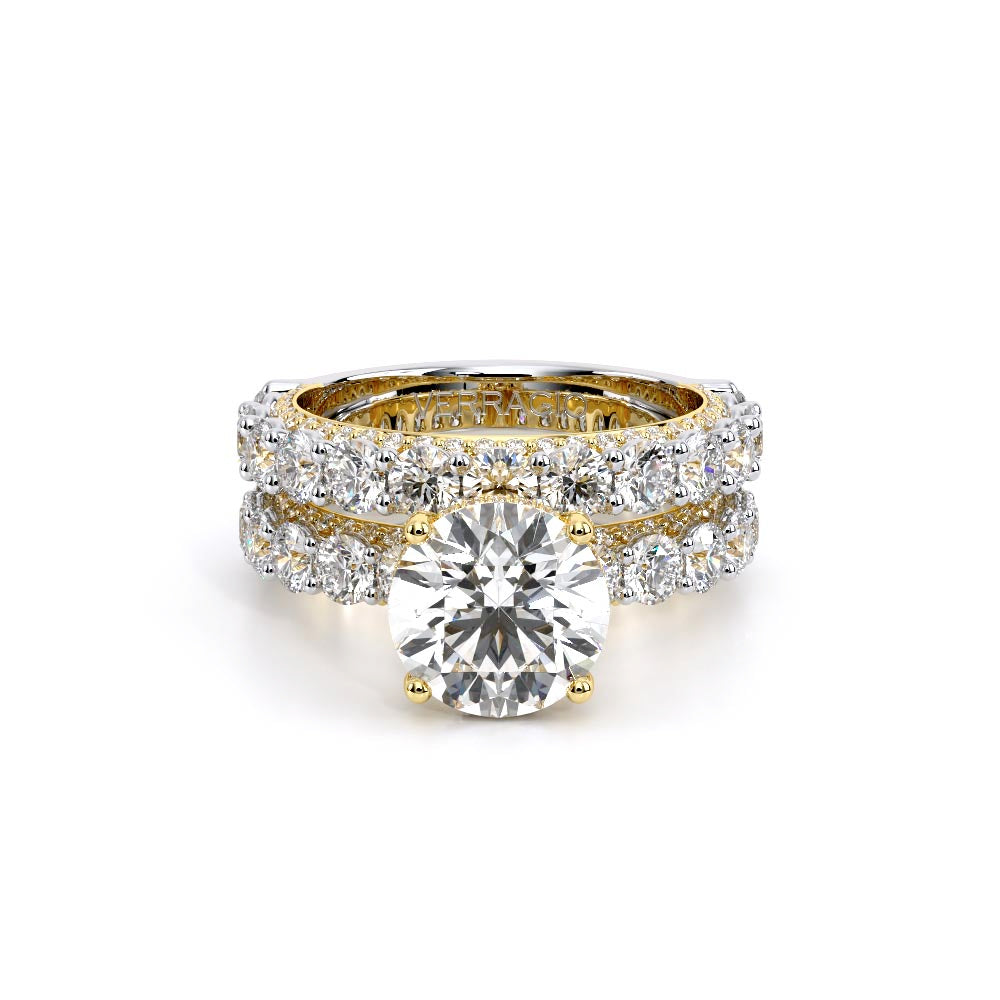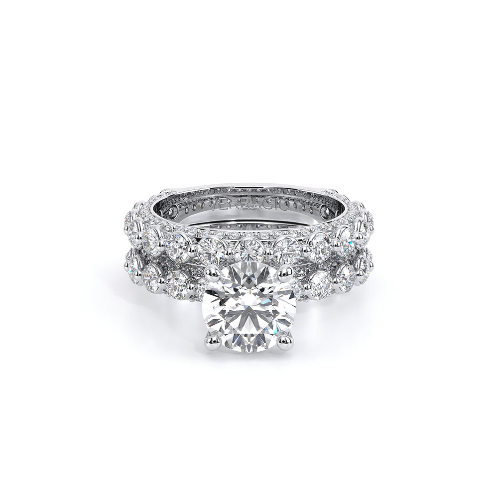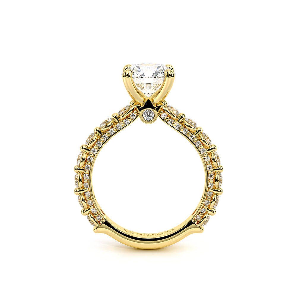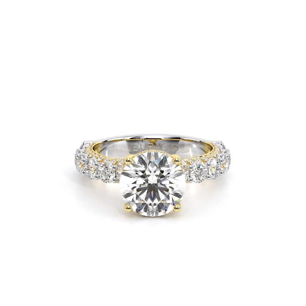 Couture-0489R-3.4 is an elevated four-prong engagement ring featuring a diamond-bridge head designed to highlight your center stone. Meticulously-set round diamonds in a shared-prong setting wrap the elegant shank, enhanced with a pave-set three-quarter diamond riviera. The Verragio signature crest completes the statement look.