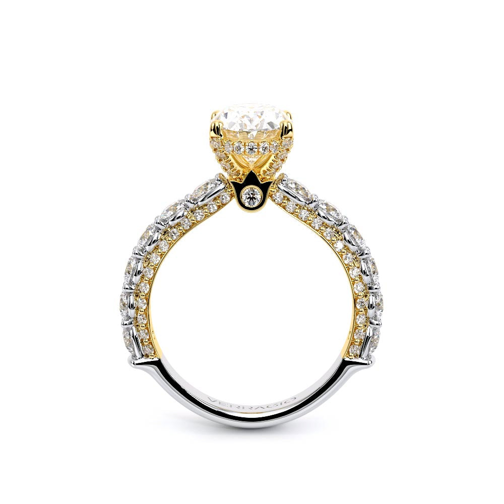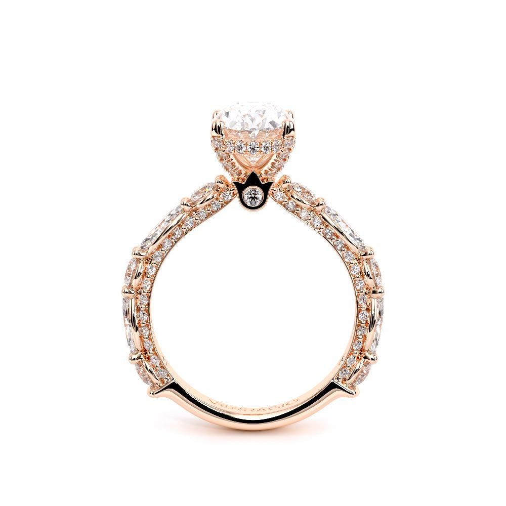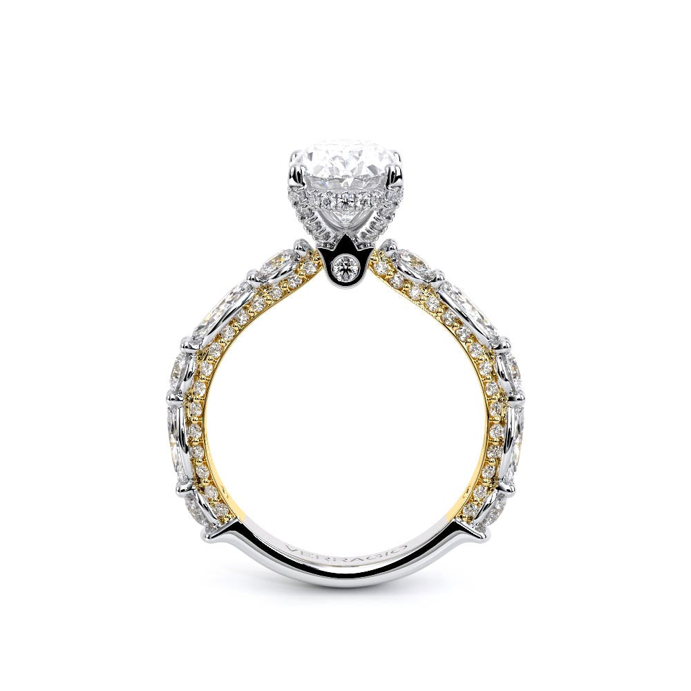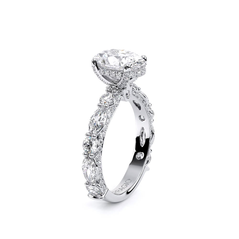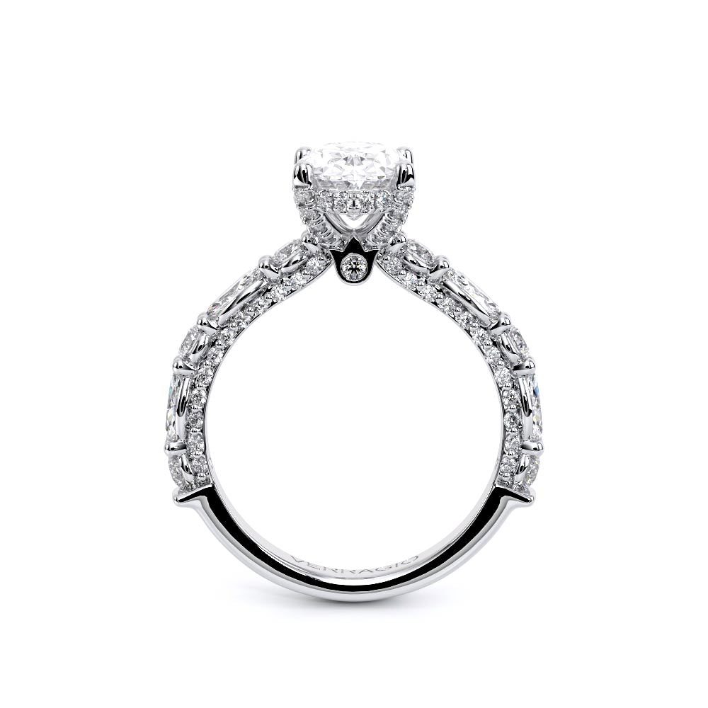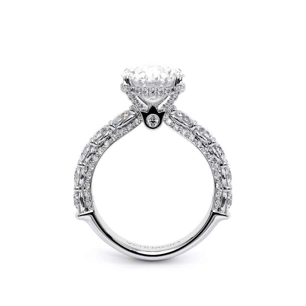Couture-0490OV-3.0 is an elevated four-prong engagement ring featuring a diamond-bridge head designed to highlight your center stone. Meticulously-set alternating round and marquise diamonds in a shared-prong setting wrap the elegant shank, enhanced with a pave-set three-quarter diamond riviera. The Verragio signature crest completes the statement look.