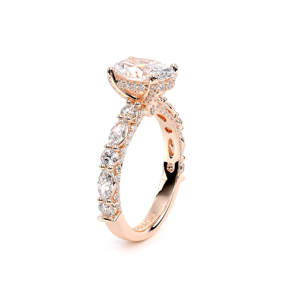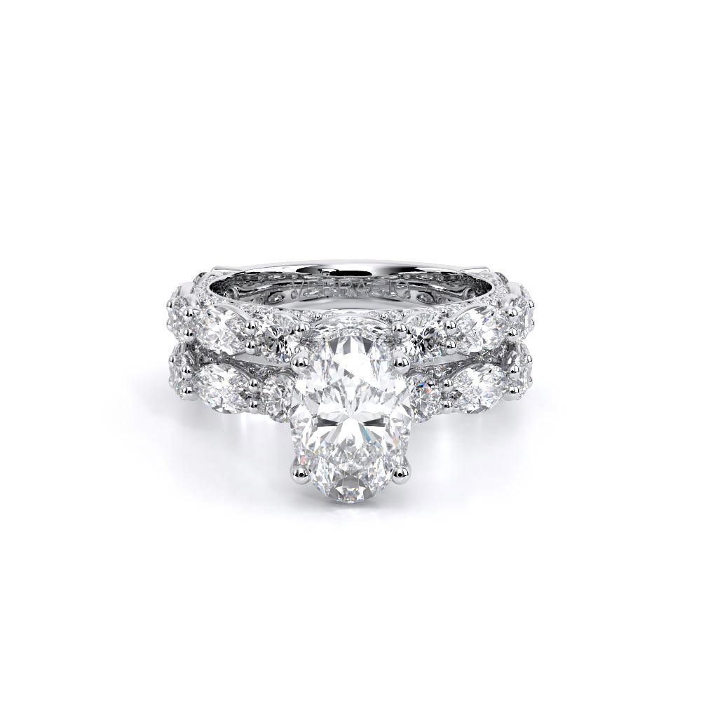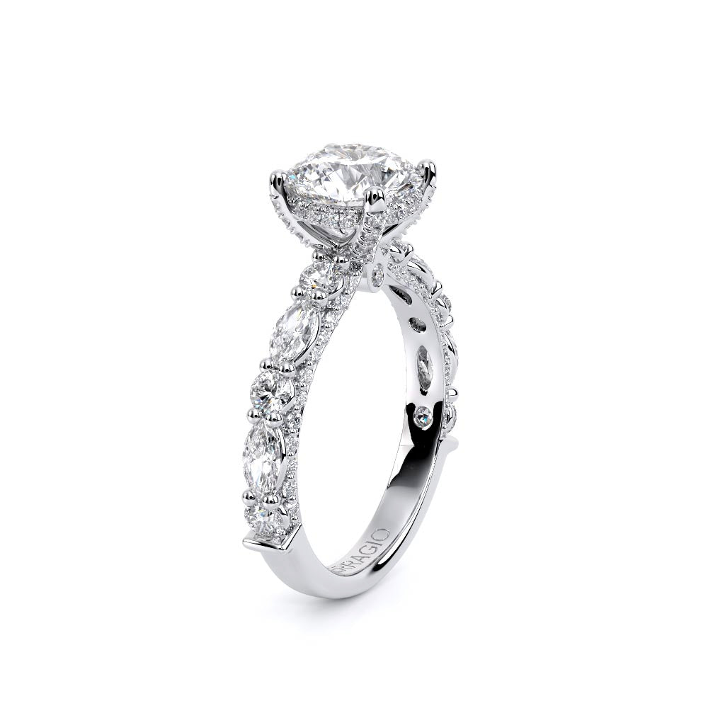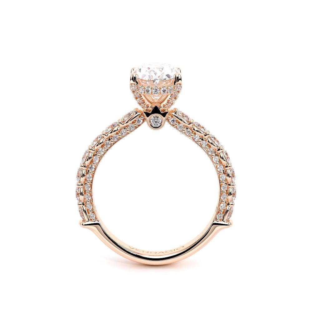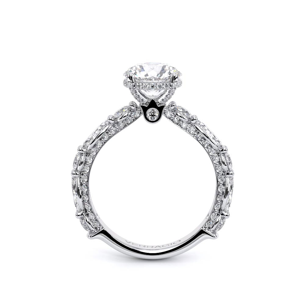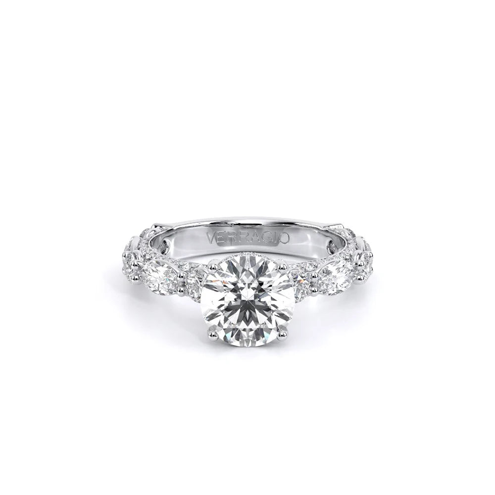 Couture-0490OV-3.0 is an elevated four-prong engagement ring featuring a diamond-bridge head designed to highlight your center stone. Meticulously-set alternating round and marquise diamonds in a shared-prong setting wrap the elegant shank, enhanced with a pave-set three-quarter diamond riviera. The Verragio signature crest completes the statement look.