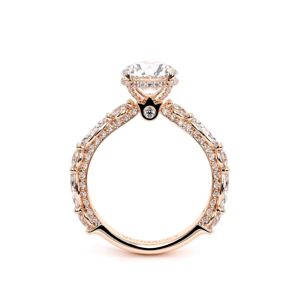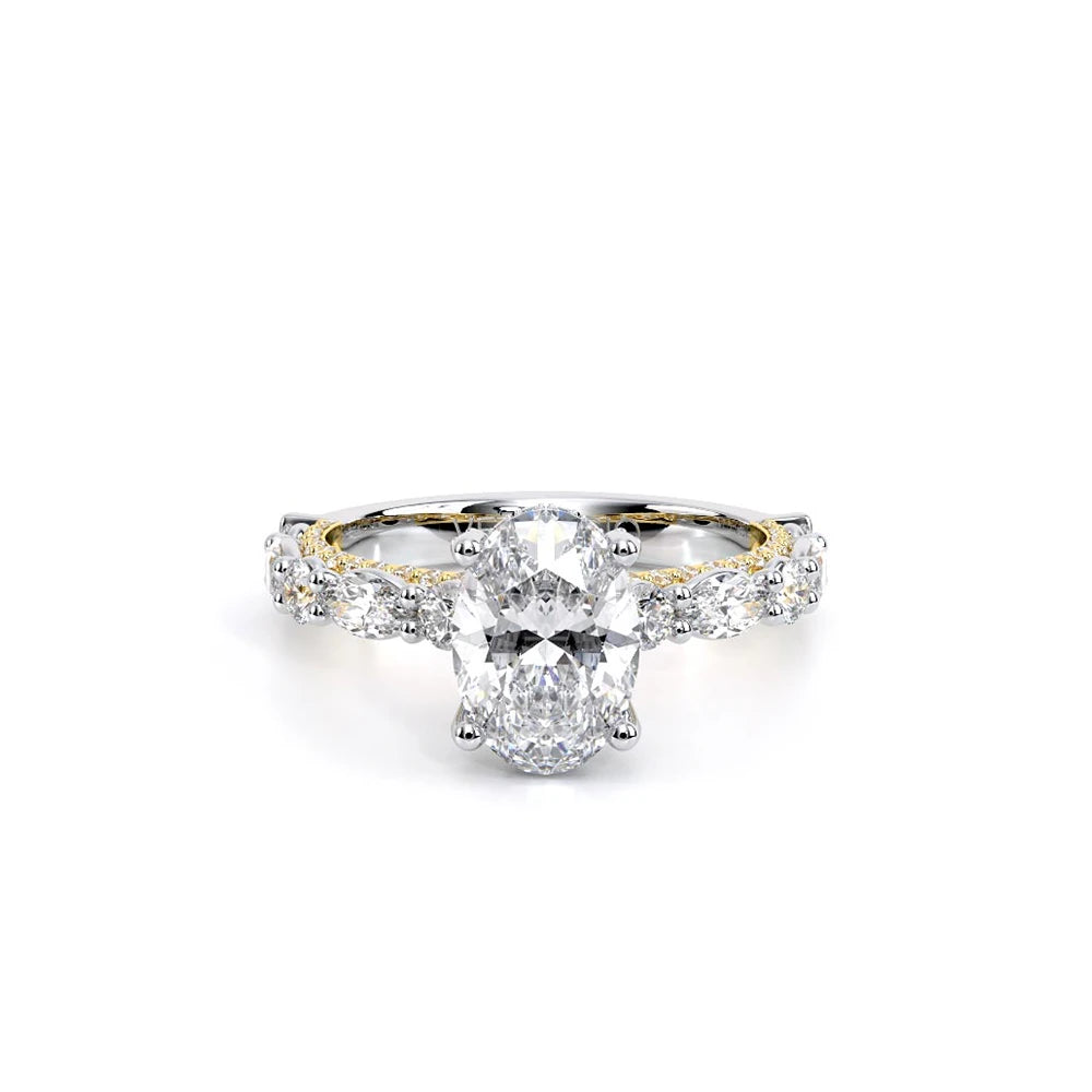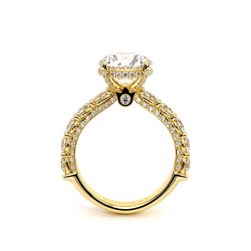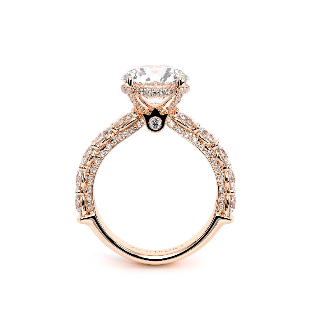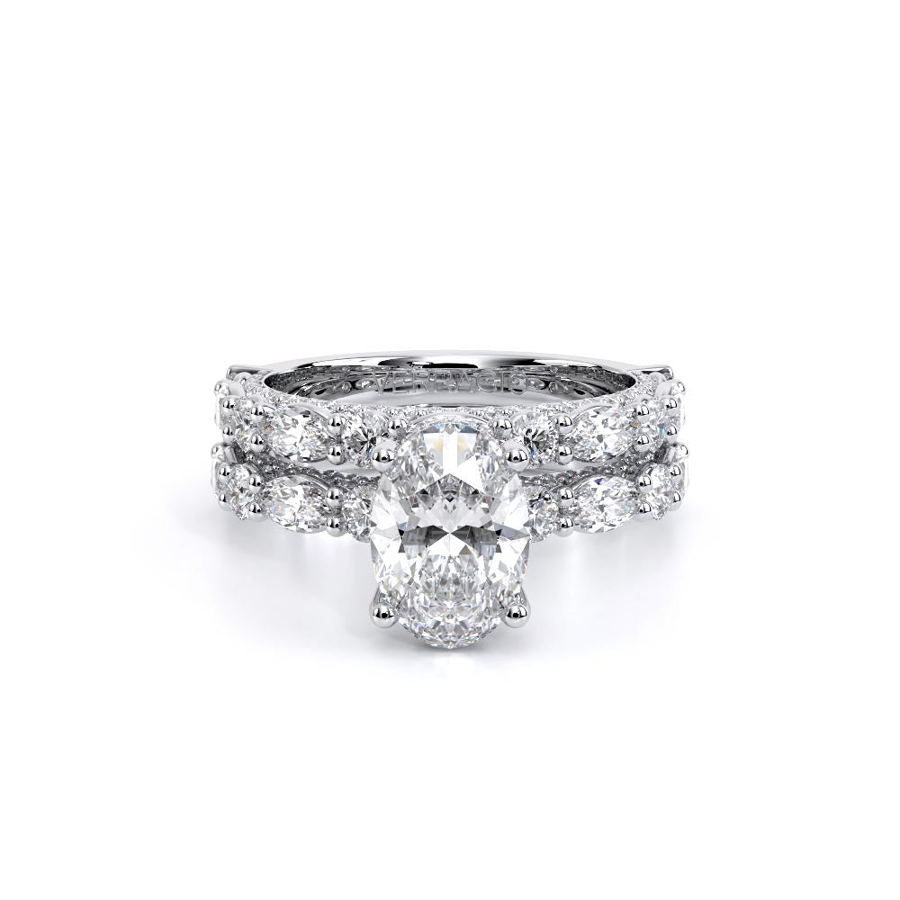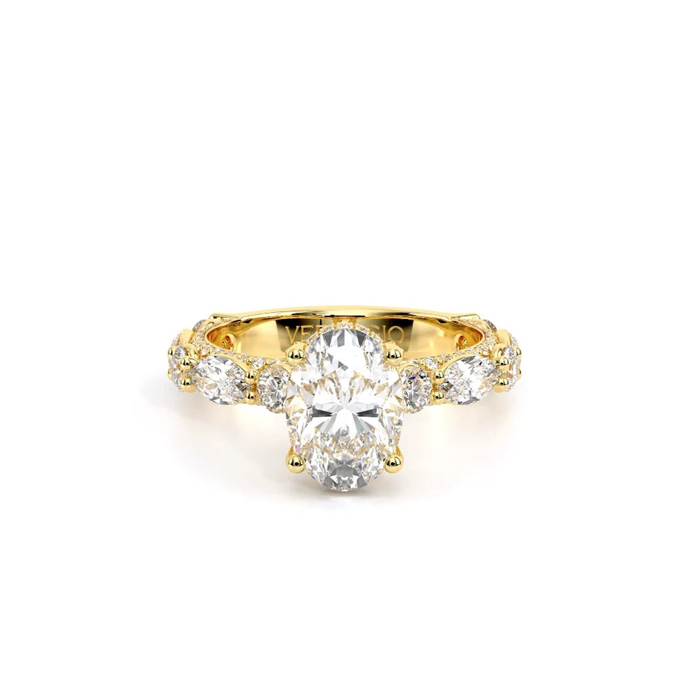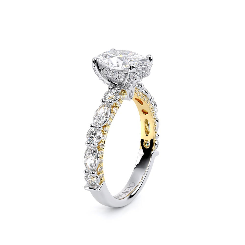 Couture-0490OV-3.0 is an elevated four-prong engagement ring featuring a diamond-bridge head designed to highlight your center stone. Meticulously-set alternating round and marquise diamonds in a shared-prong setting wrap the elegant shank, enhanced with a pave-set three-quarter diamond riviera. The Verragio signature crest completes the statement look.