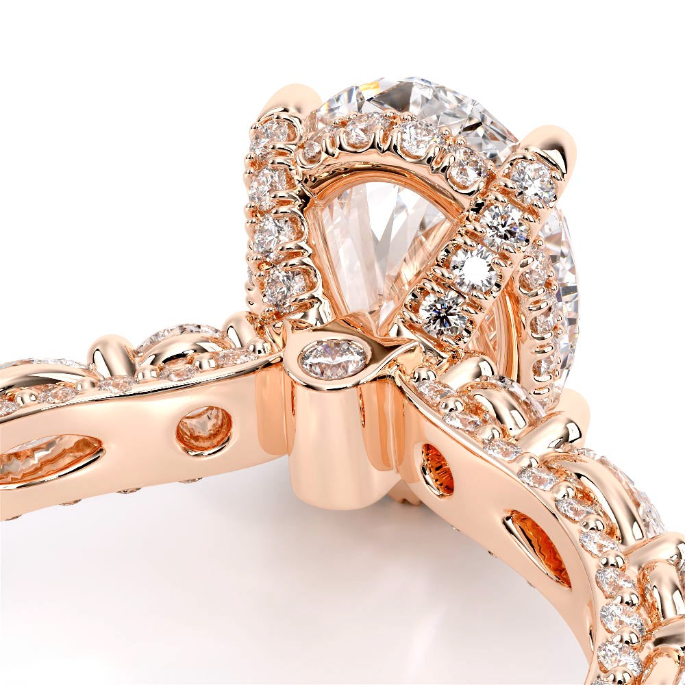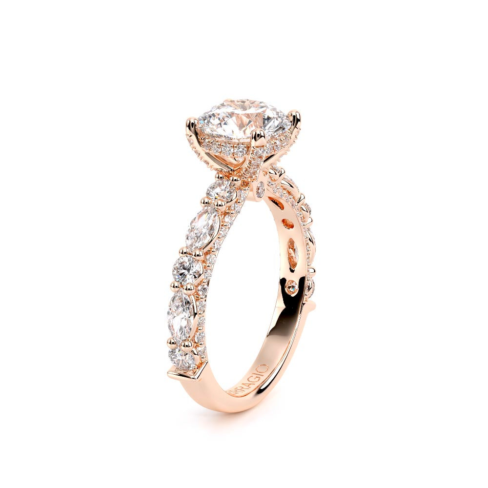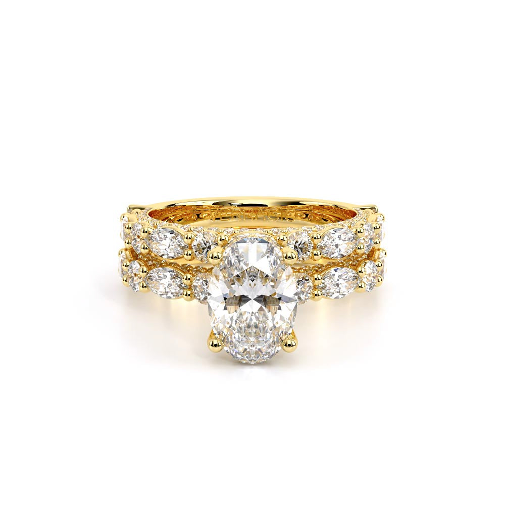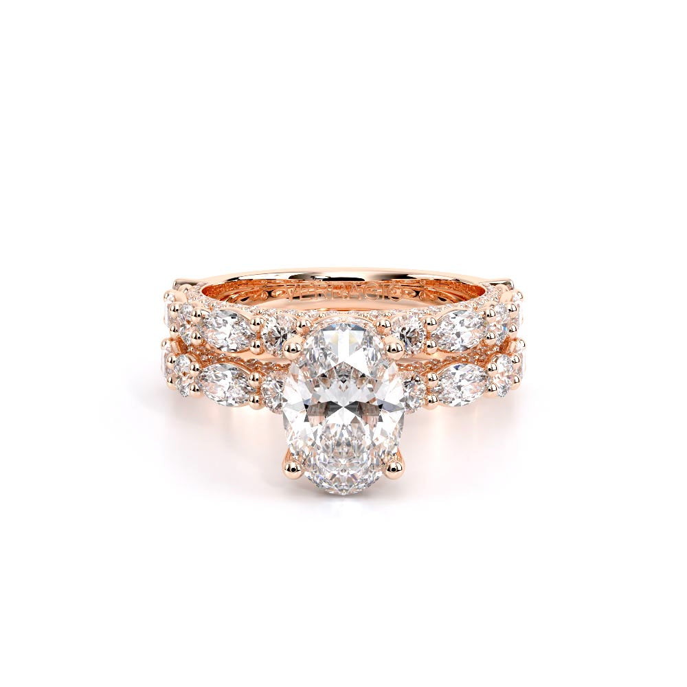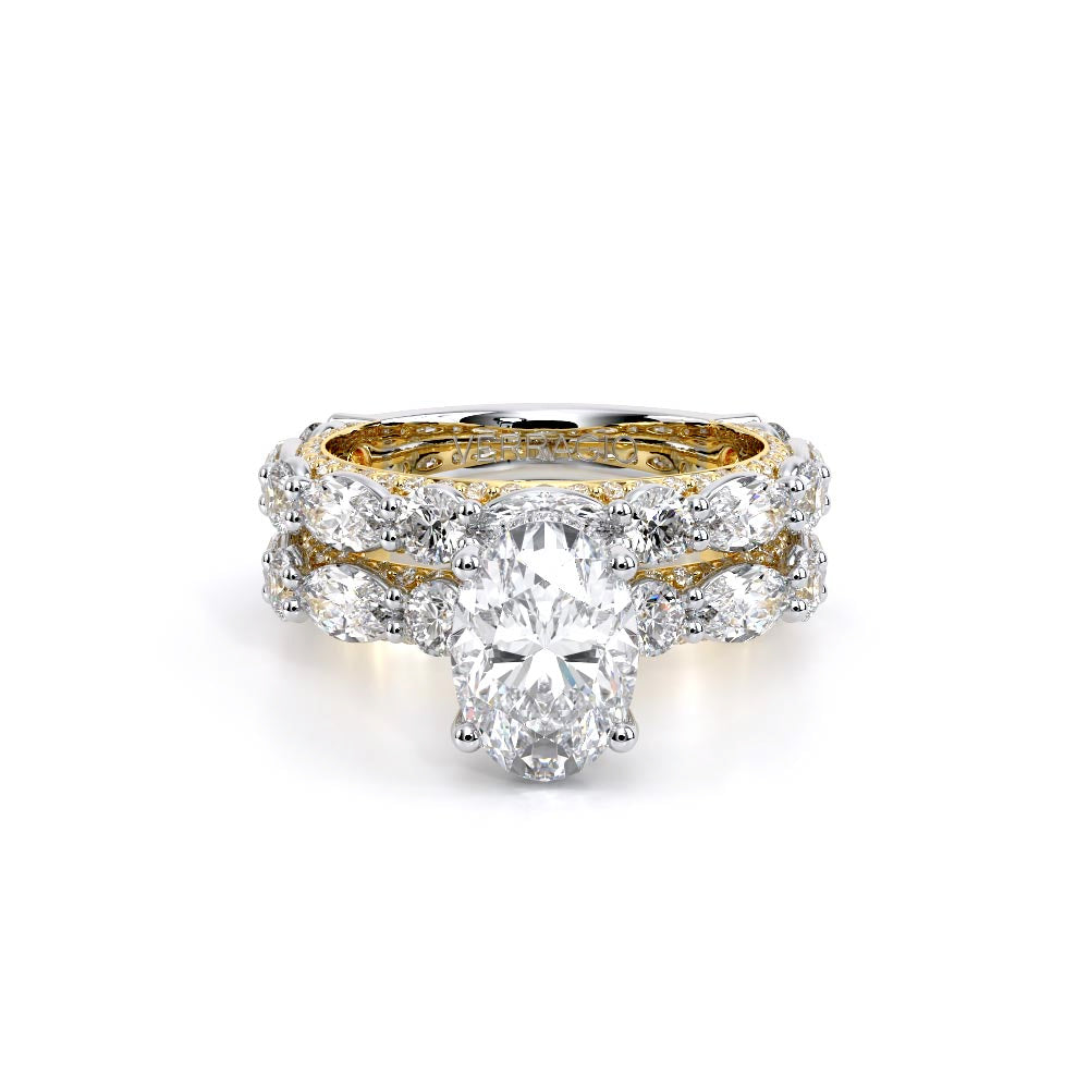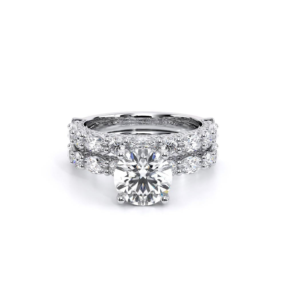 Couture-0490OV-3.0 is an elevated four-prong engagement ring featuring a diamond-bridge head designed to highlight your center stone. Meticulously-set alternating round and marquise diamonds in a shared-prong setting wrap the elegant shank, enhanced with a pave-set three-quarter diamond riviera. The Verragio signature crest completes the statement look.