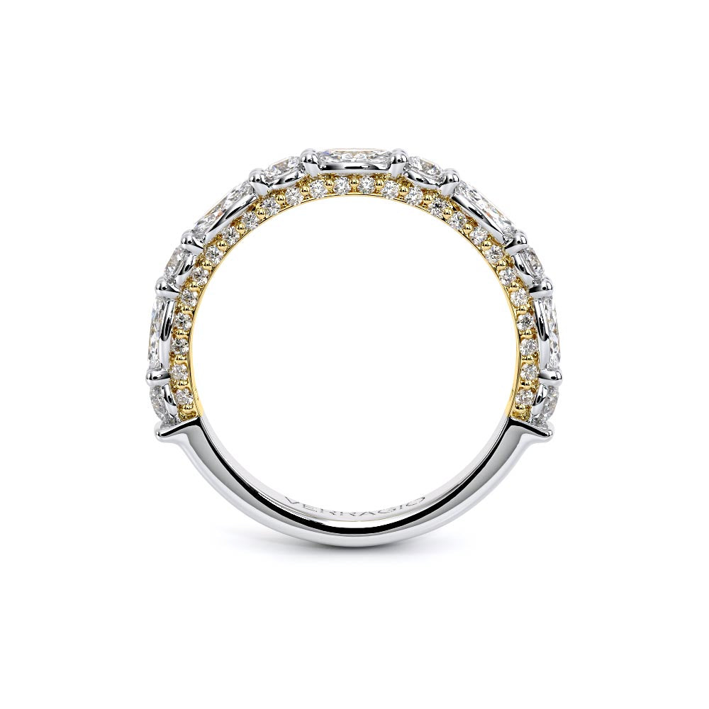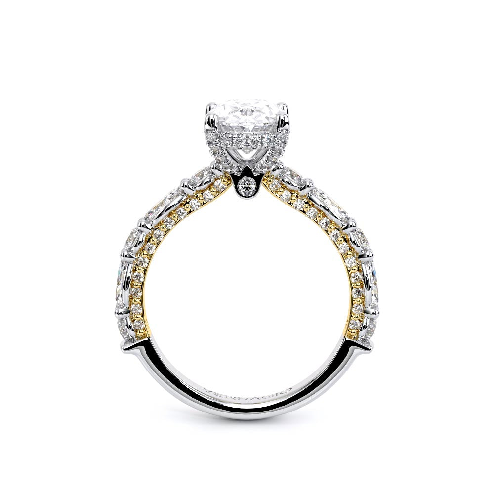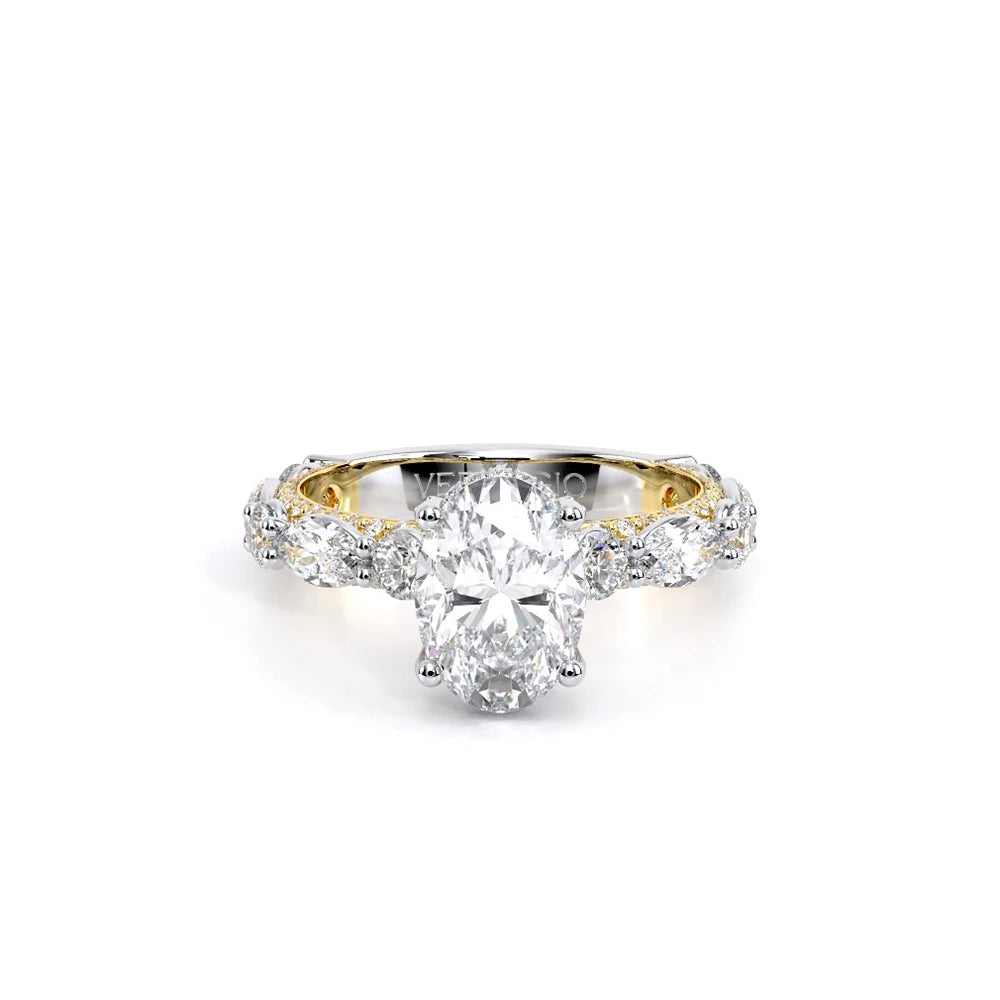 Couture-0490OV-2.5 is an elevated four-prong engagement ring featuring a diamond-bridge head designed to highlight your center stone. Meticulously-set alternating round and marquise diamonds in a shared-prong setting wrap the elegant shank, enhanced with a pave-set three-quarter diamond riviera. The Verragio signature crest completes the statement look.