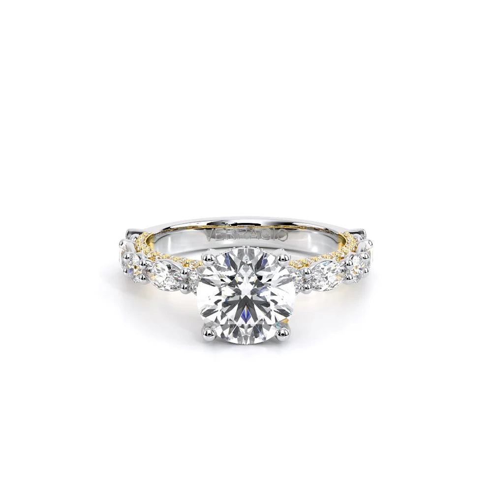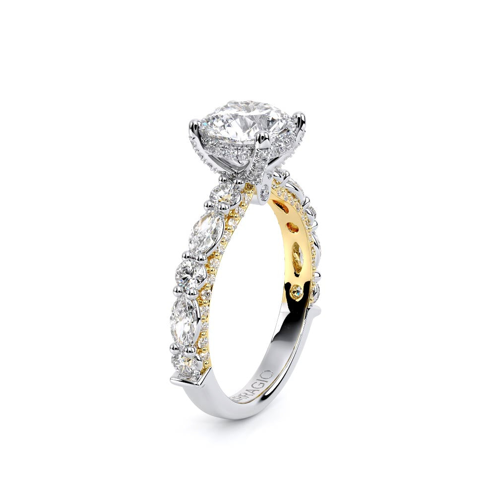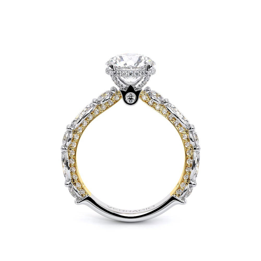 Couture-0490R-2.5 is an elevated four-prong engagement ring featuring a diamond-bridge head designed to highlight your center stone. Meticulously-set alternating round and marquise diamonds in a shared-prong setting wrap the elegant shank, enhanced with a pave-set three-quarter diamond riviera. The Verragio signature crest completes the statement look.