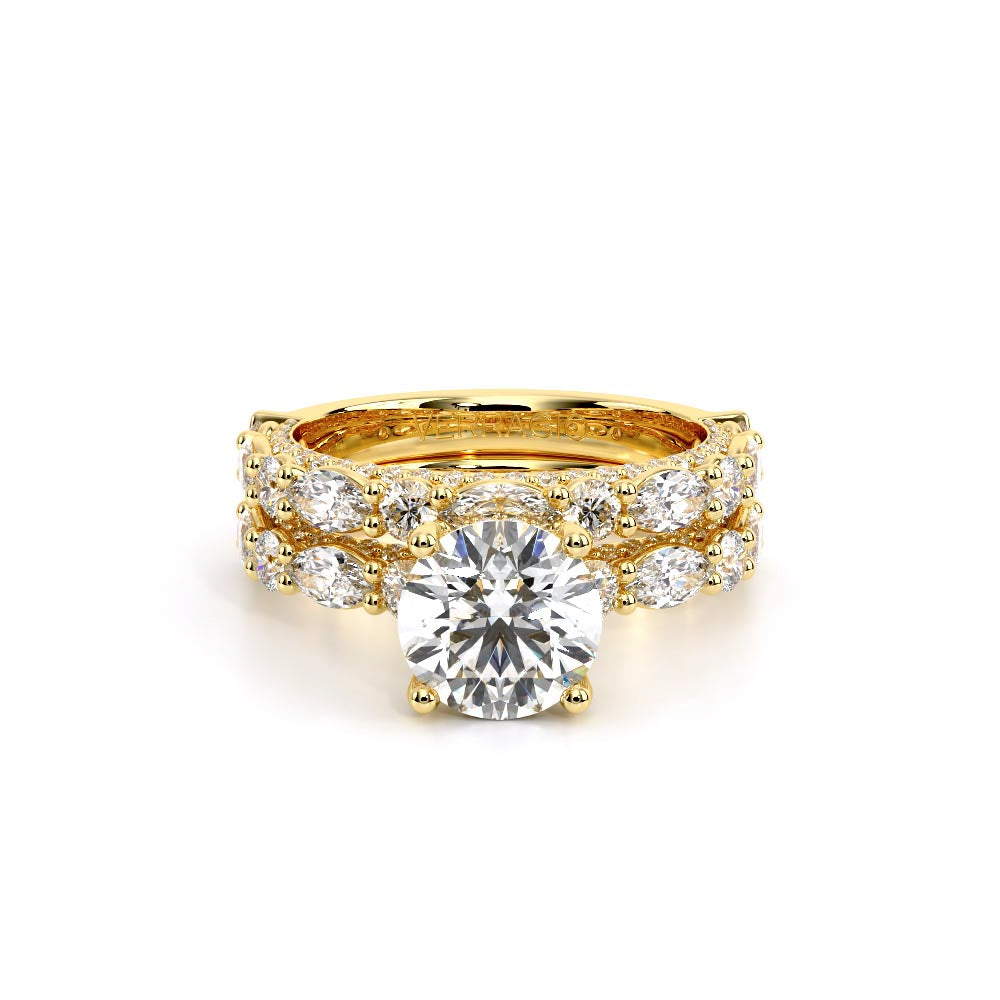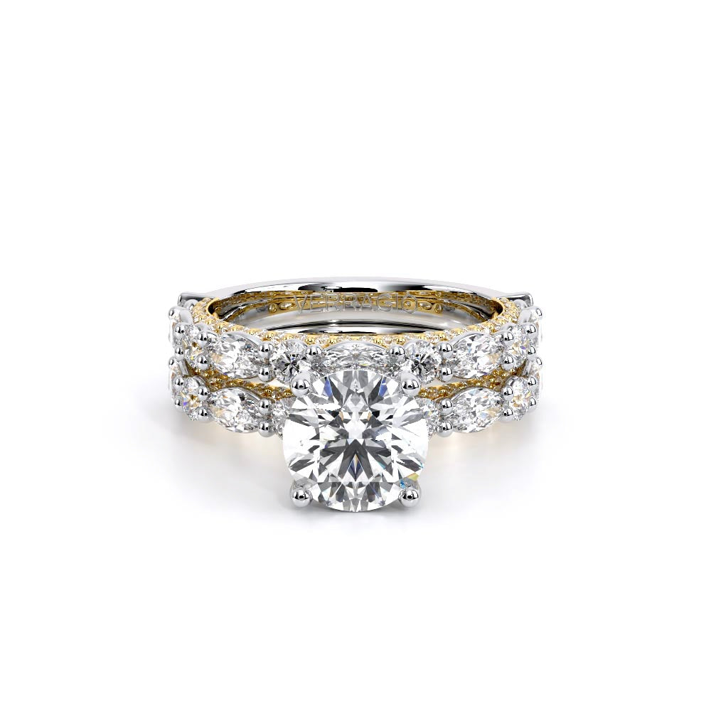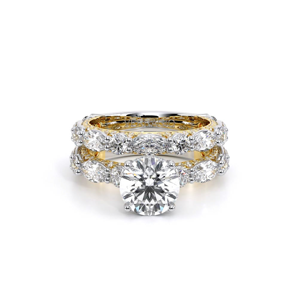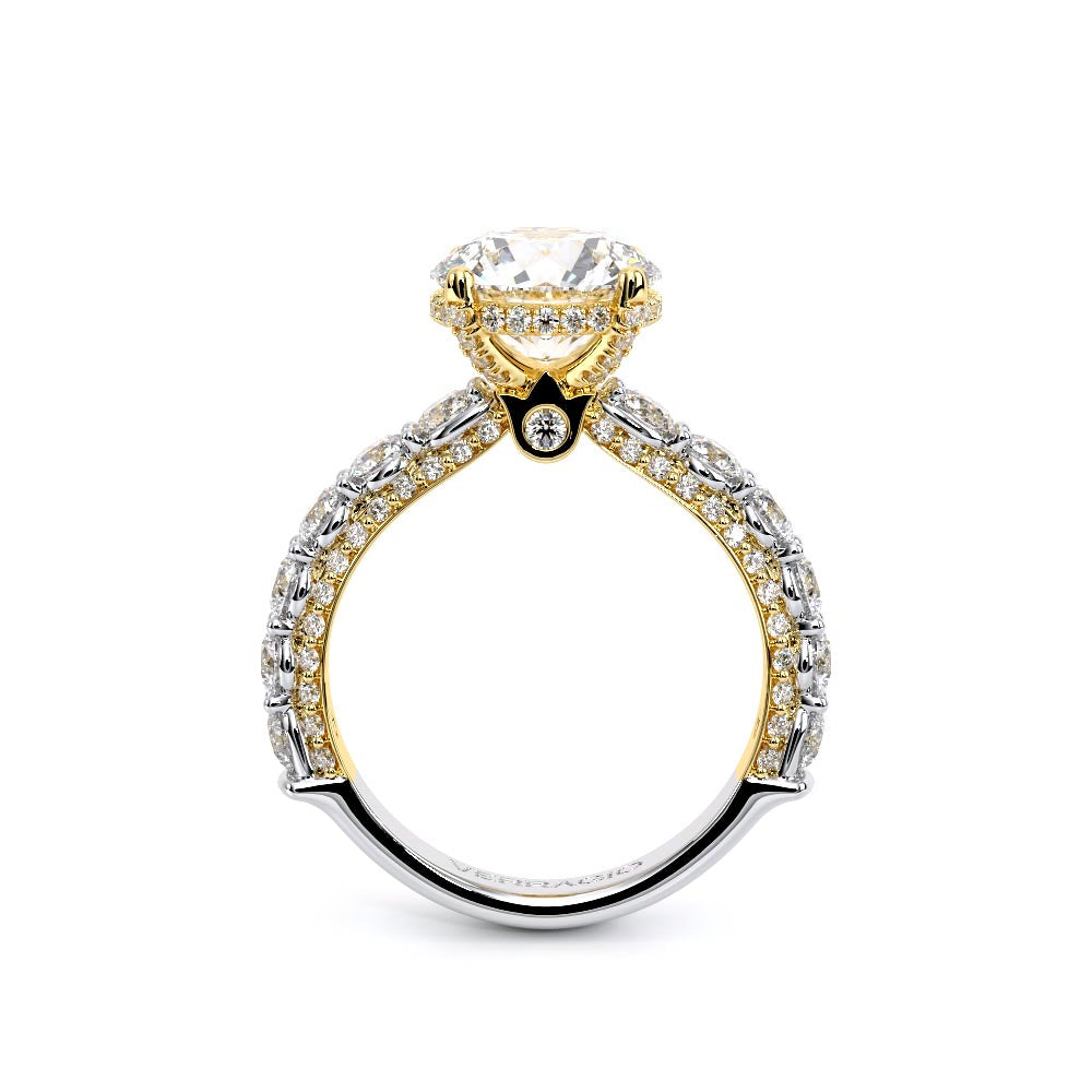 Couture-0490R-2.5 is an elevated four-prong engagement ring featuring a diamond-bridge head designed to highlight your center stone. Meticulously-set alternating round and marquise diamonds in a shared-prong setting wrap the elegant shank, enhanced with a pave-set three-quarter diamond riviera. The Verragio signature crest completes the statement look.