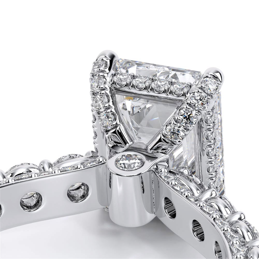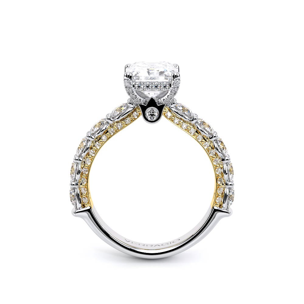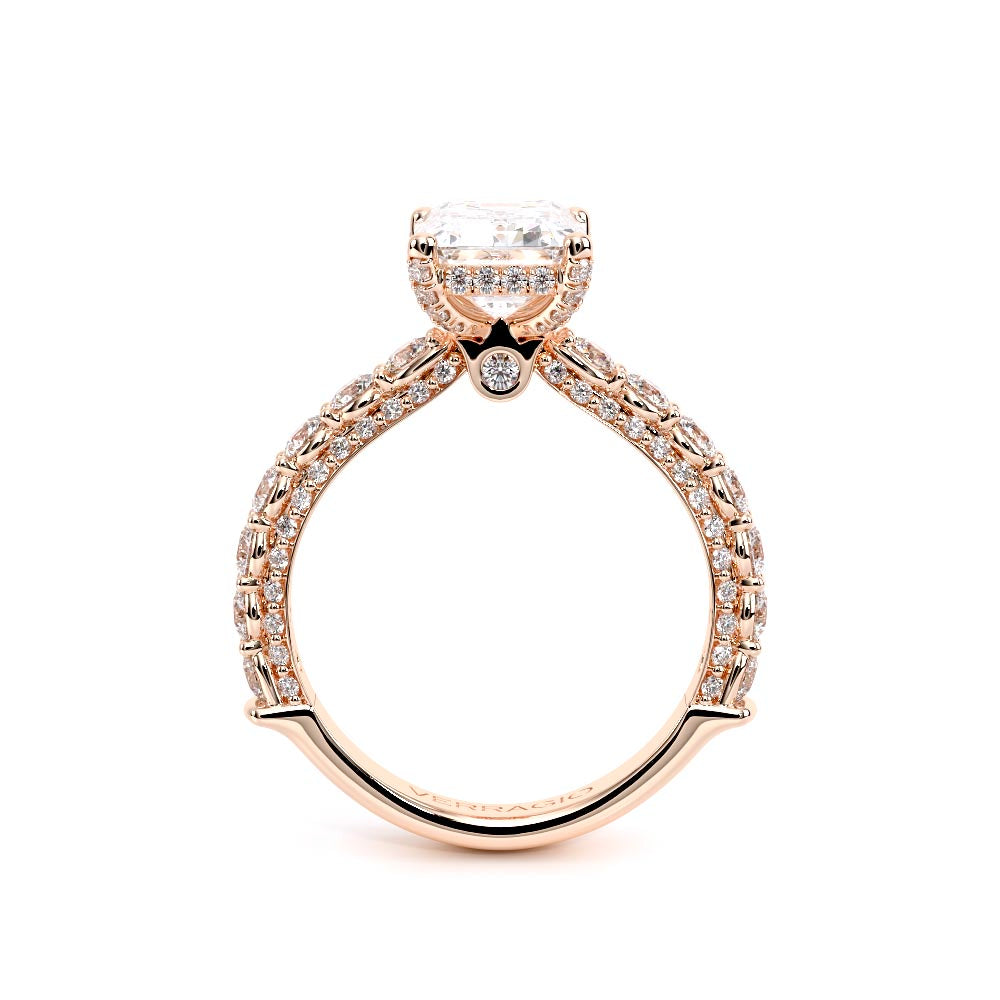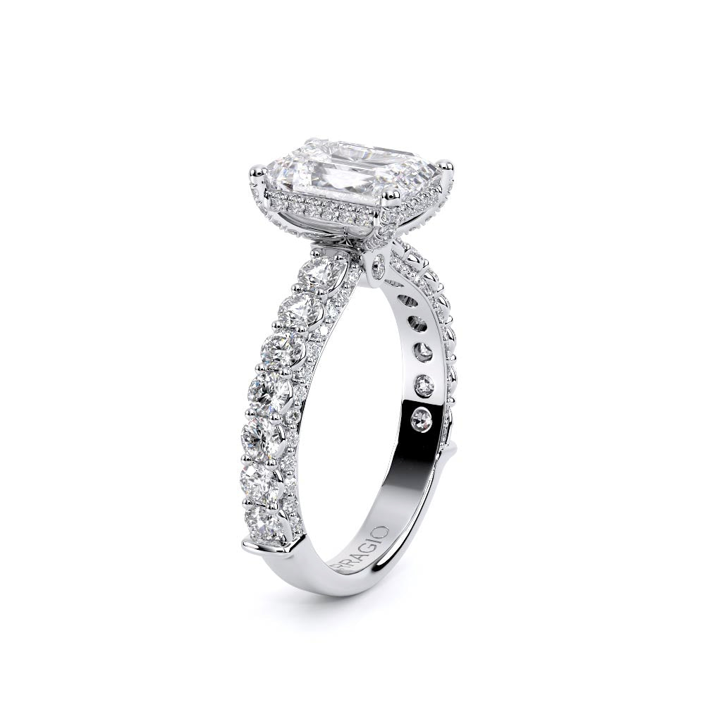 Couture-0489EM-3.0 is an elevated four-prong engagement ring featuring a diamond-bridge head designed to highlight your center stone. Meticulously-set round diamonds in a shared-prong setting wrap the elegant shank, enhanced with a pave-set three-quarter diamond riviera. The Verragio signature crest completes the statement look.