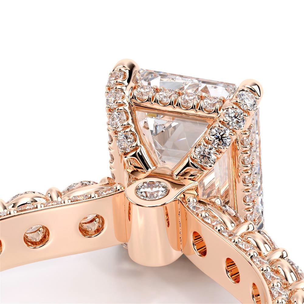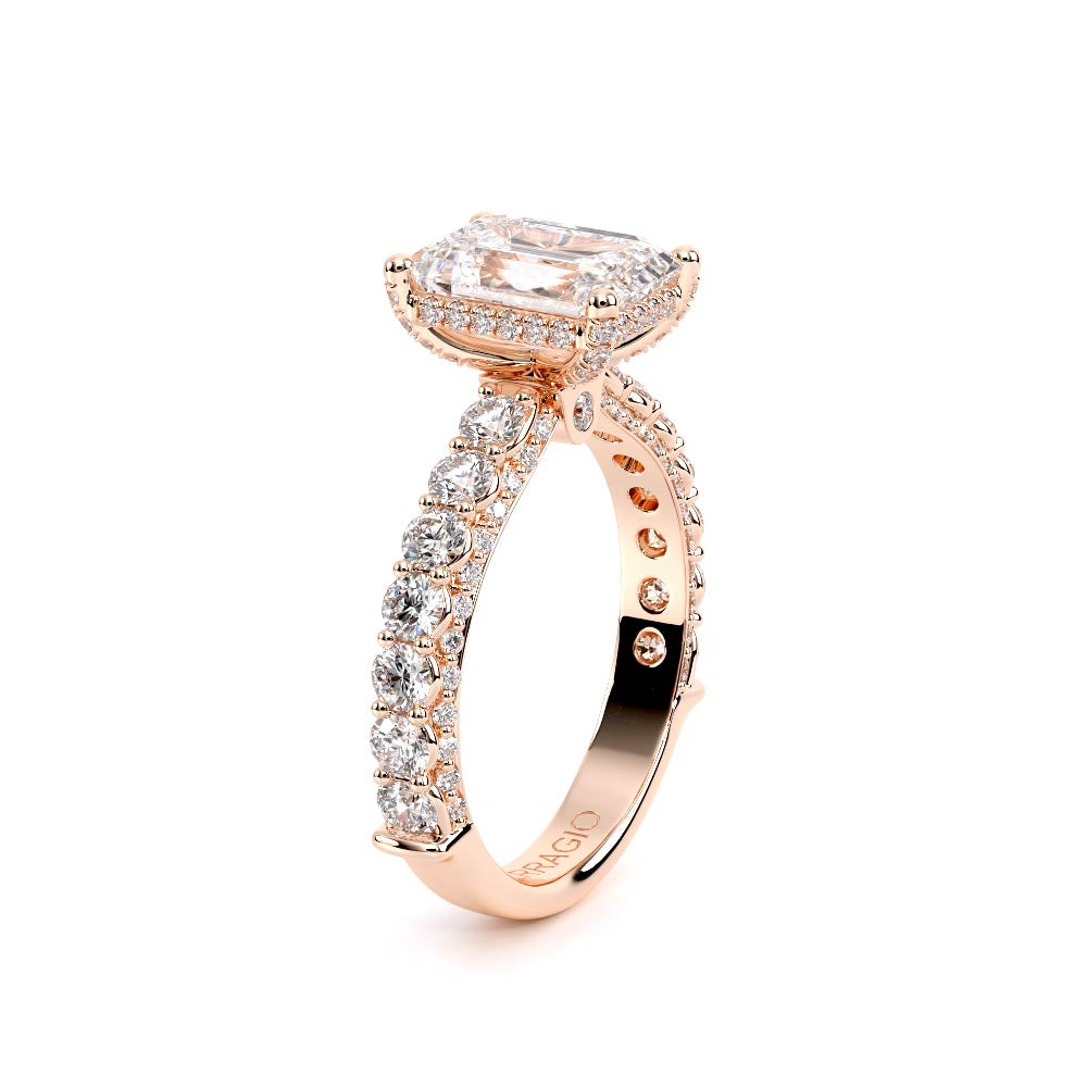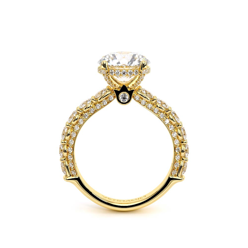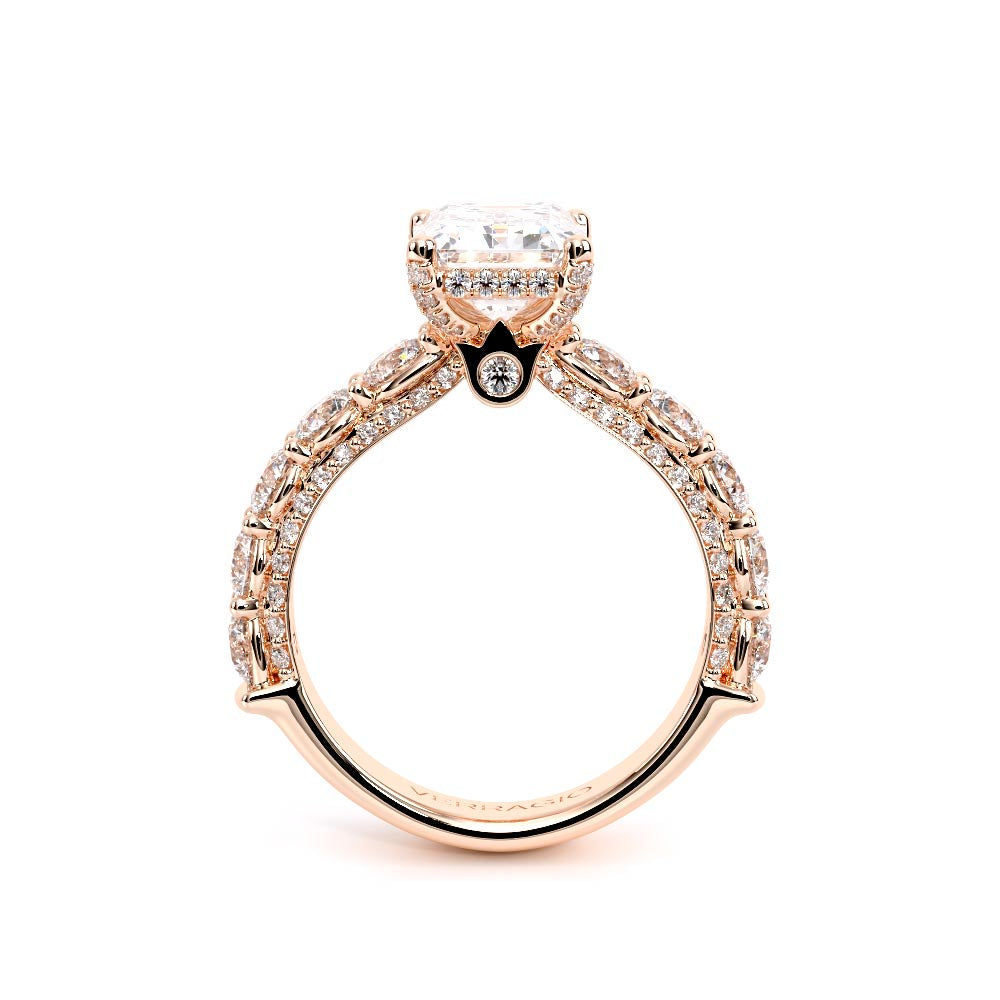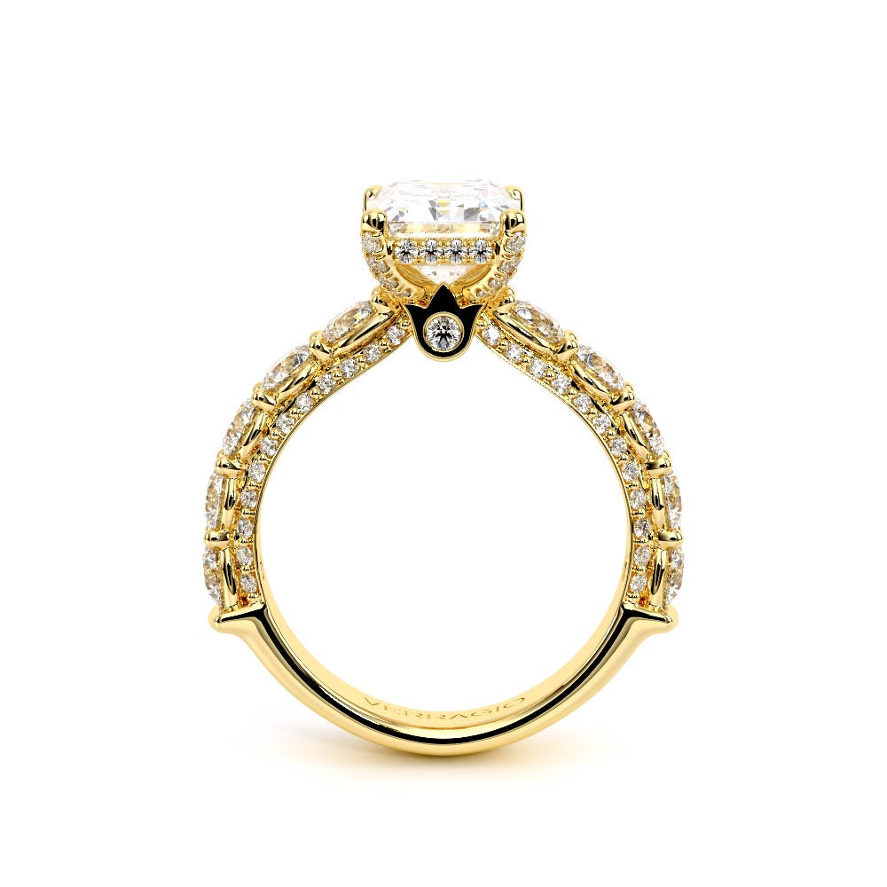 Couture-0489EM-3.0 is an elevated four-prong engagement ring featuring a diamond-bridge head designed to highlight your center stone. Meticulously-set round diamonds in a shared-prong setting wrap the elegant shank, enhanced with a pave-set three-quarter diamond riviera. The Verragio signature crest completes the statement look.