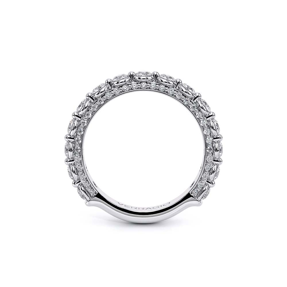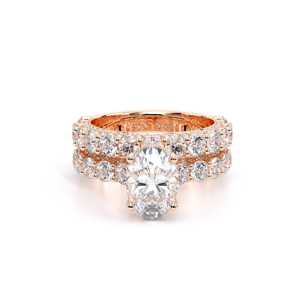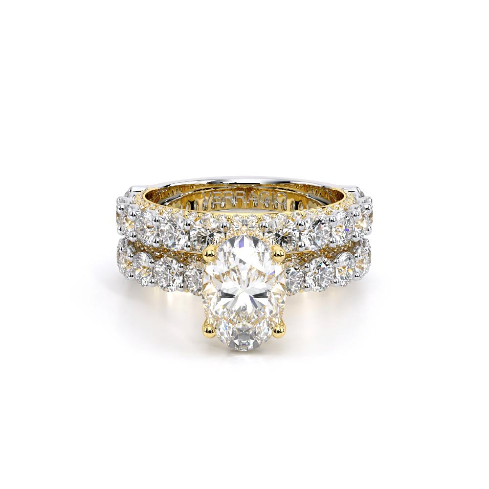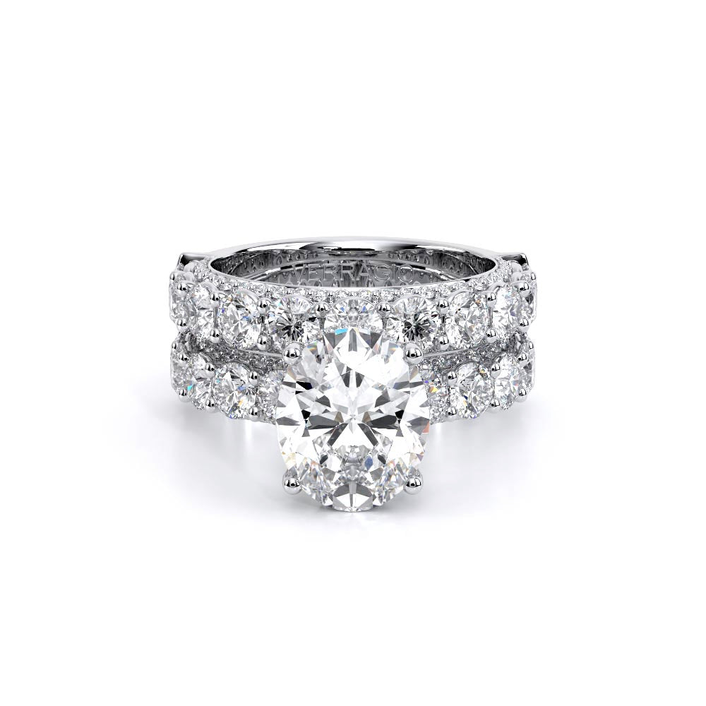 Couture-0489OV-3.4 is an elevated four-prong engagement ring featuring a diamond-bridge head designed to highlight your center stone. Meticulously-set round diamonds in a shared-prong setting wrap the elegant shank, enhanced with a pave-set three-quarter diamond riviera. The Verragio signature crest completes the statement look.