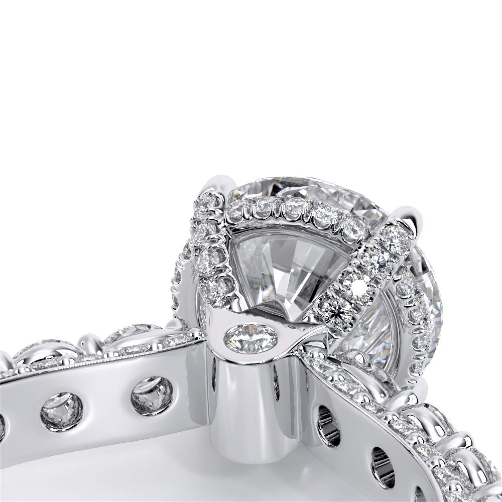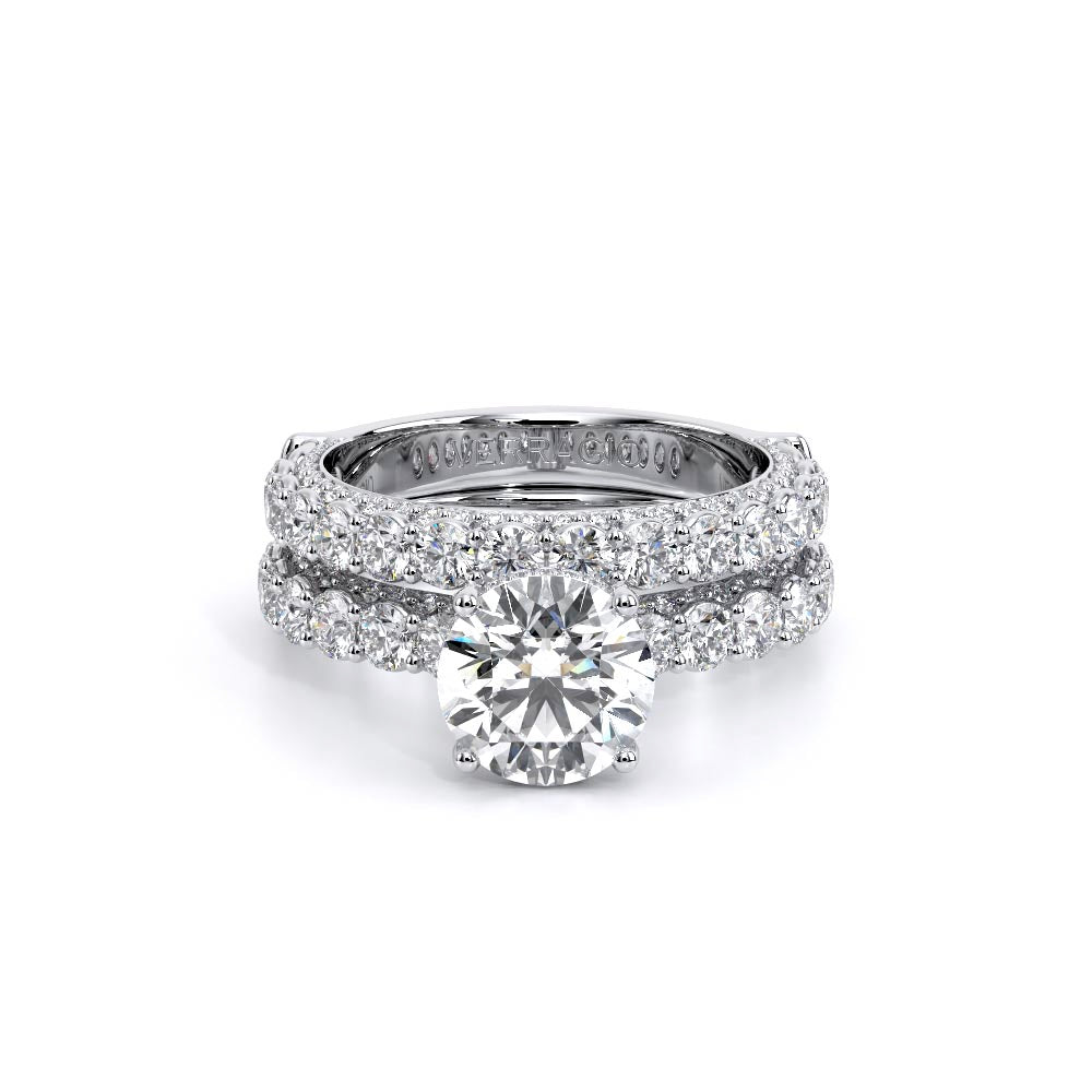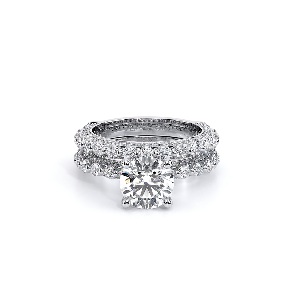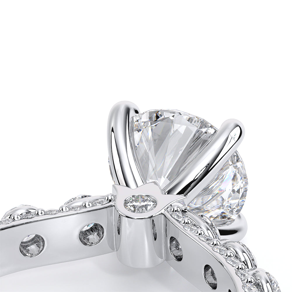 Couture-0489R-2.5 is an elevated four-prong engagement ring featuring a diamond-bridge head designed to highlight your center stone. Meticulously-set round diamonds in a shared-prong setting wrap the elegant shank, enhanced with a pave-set three-quarter diamond riviera. The Verragio signature crest completes the statement look.