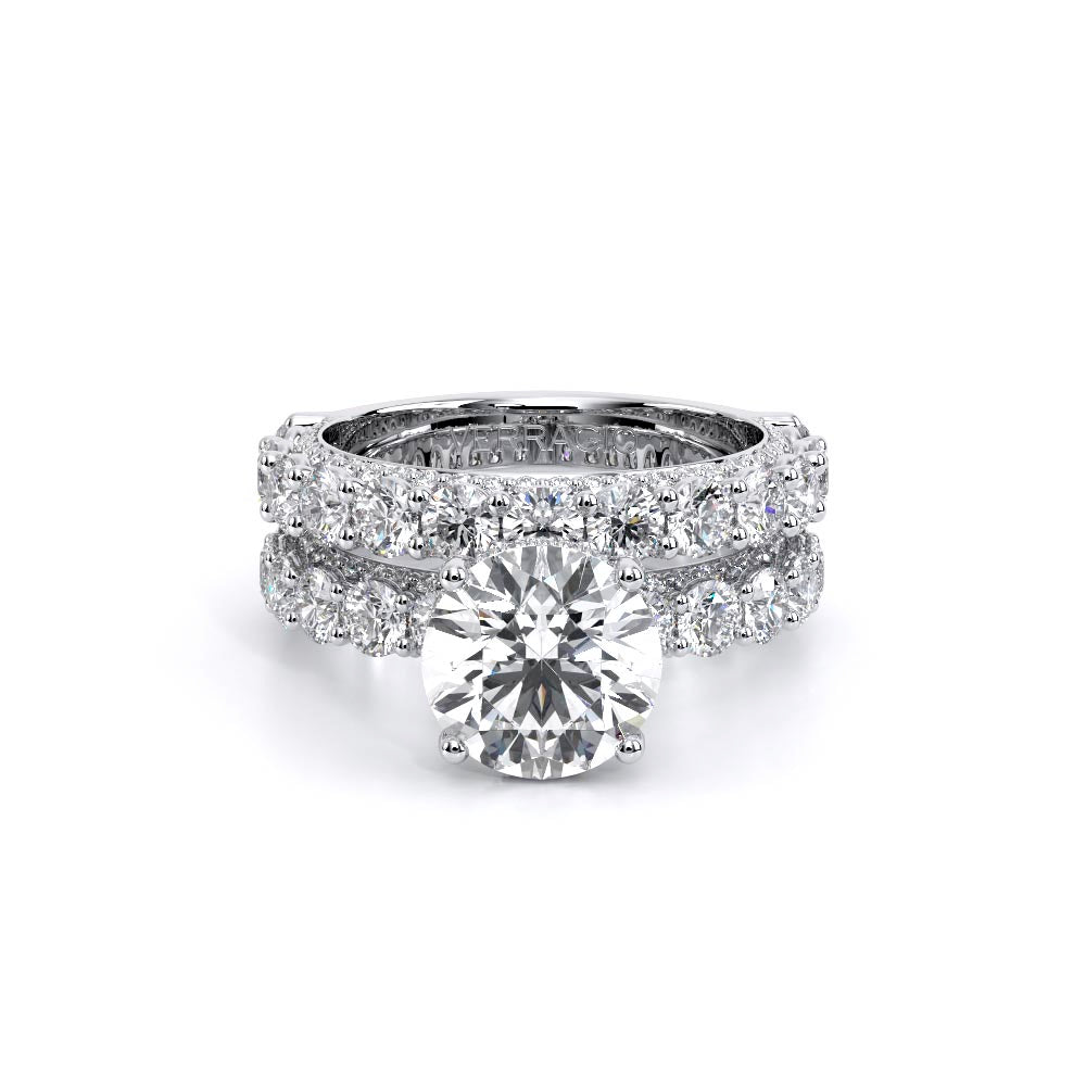 Couture-0488R20 is an elevated four-prong engagement setting designed to highlight your center stone. Meticulously-set round diamonds in a shared-prong setting wrap the elegant shank, enhanced with a pave-set three-quarter diamond riviera. The Verragio signature crest completes the statement look.