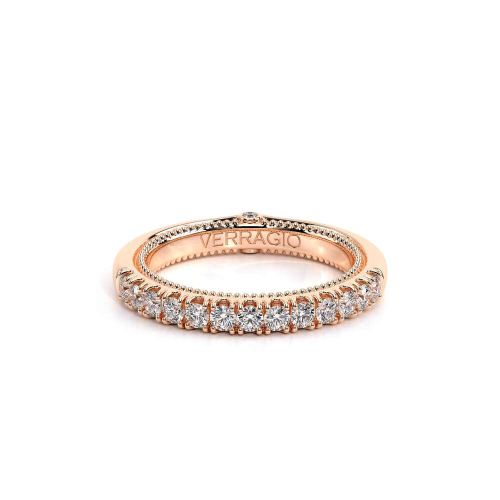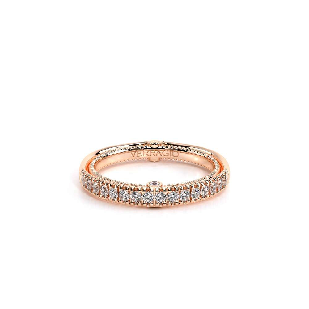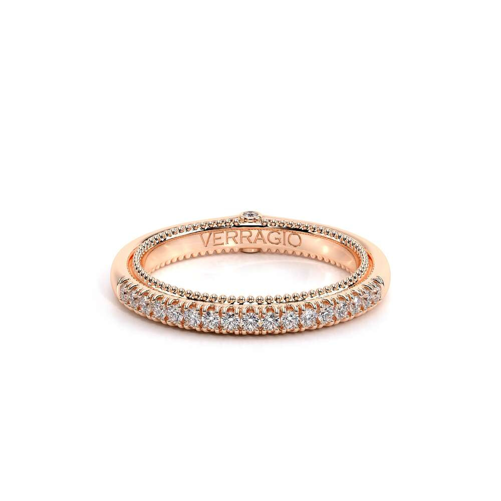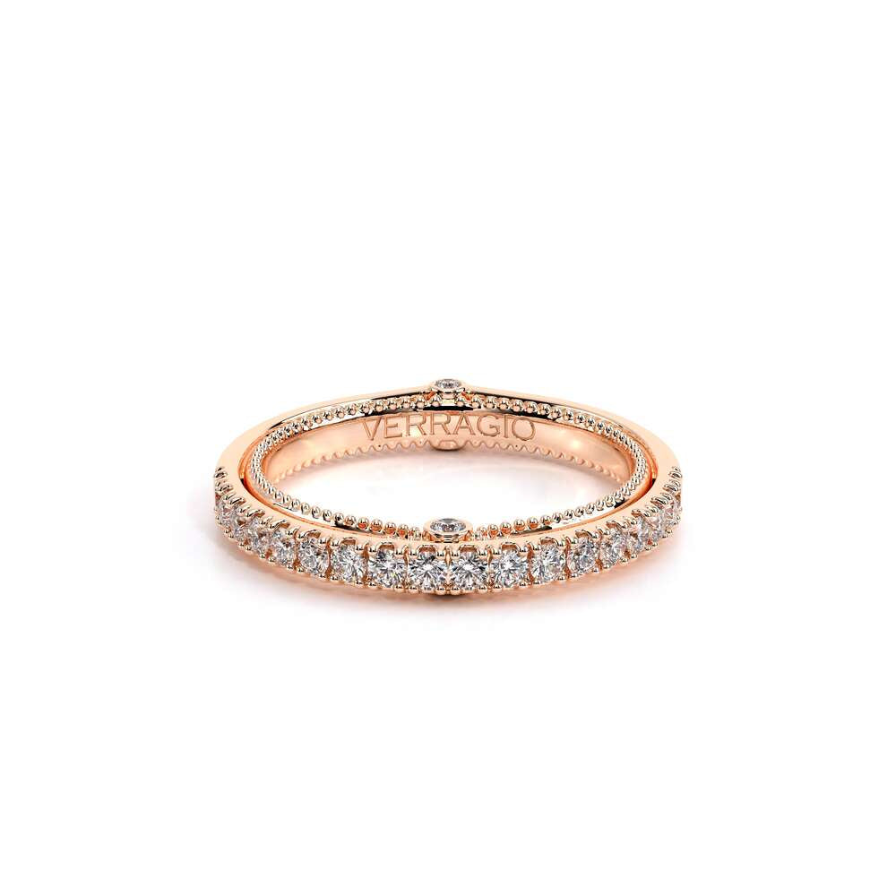 COUTURE-0418W Classic Wedding band, pave with round brilliant diamonds, featuring full Signature Beading profile, completed with the Couture pointed shank and Verragio Bezel immersed.