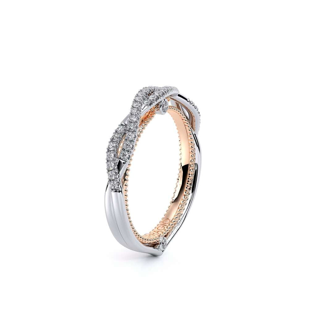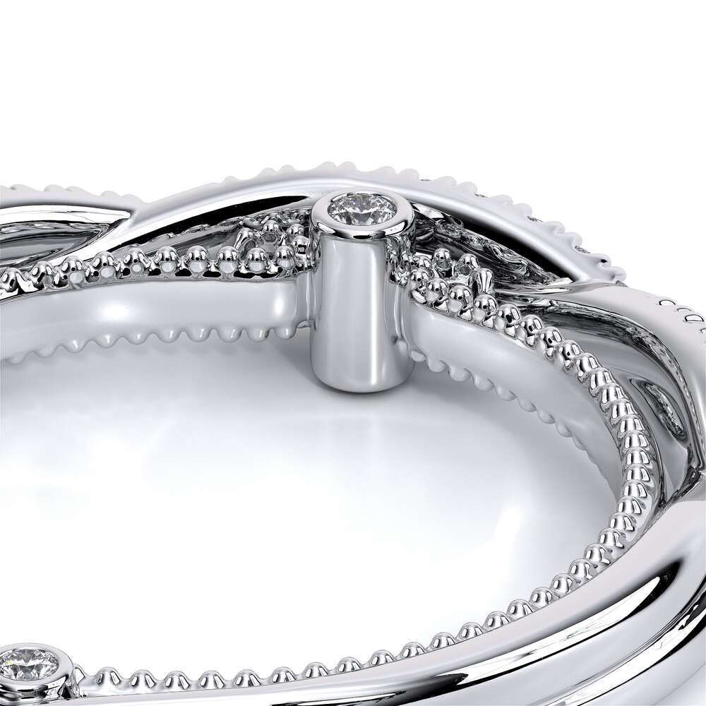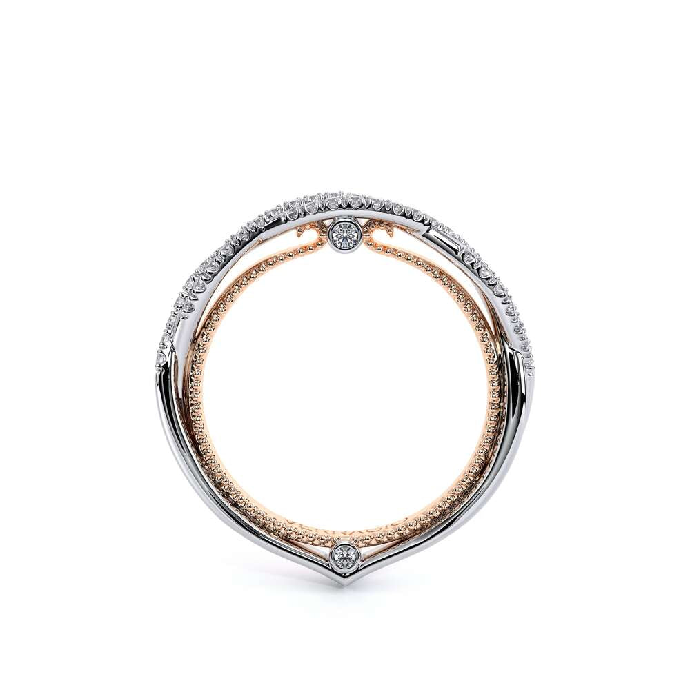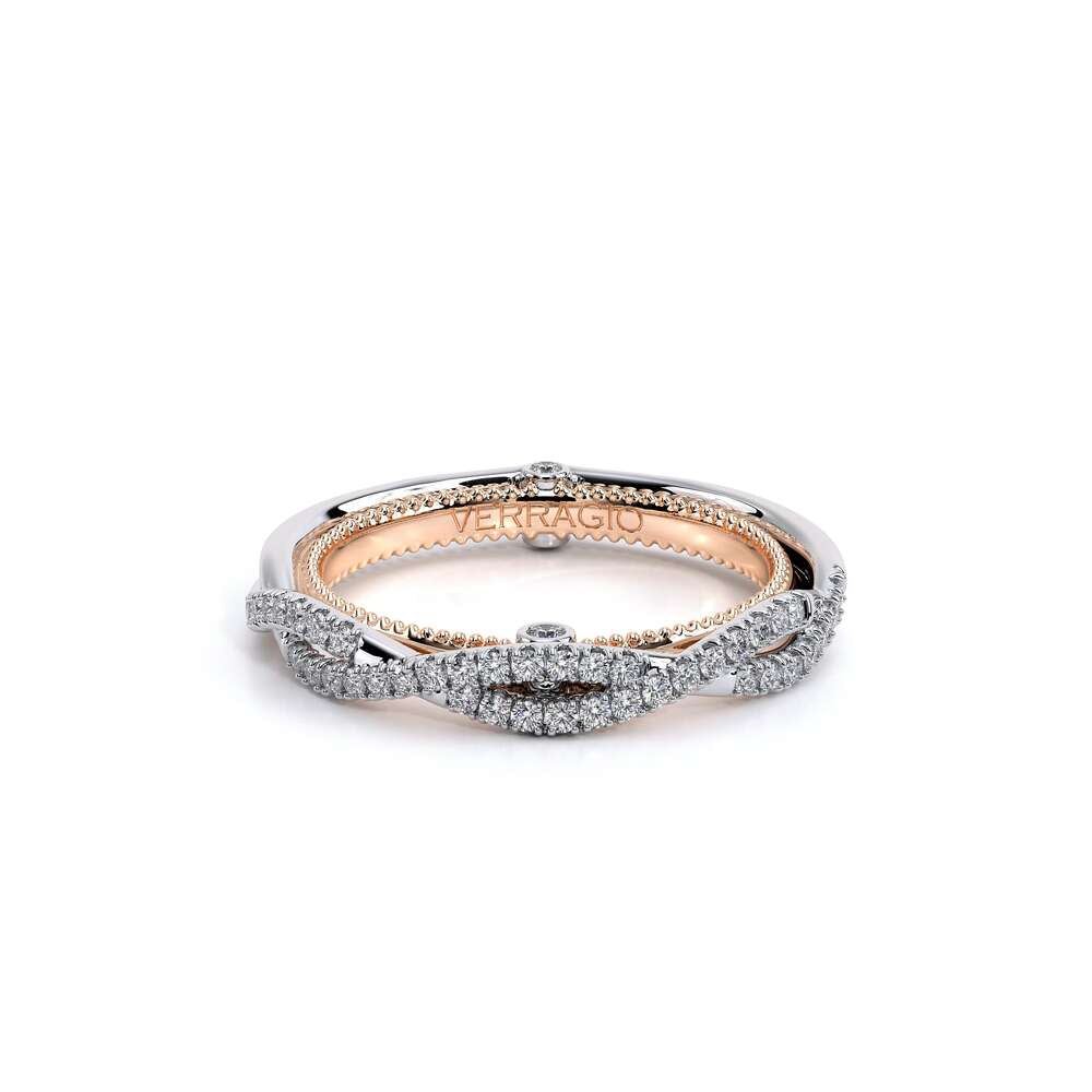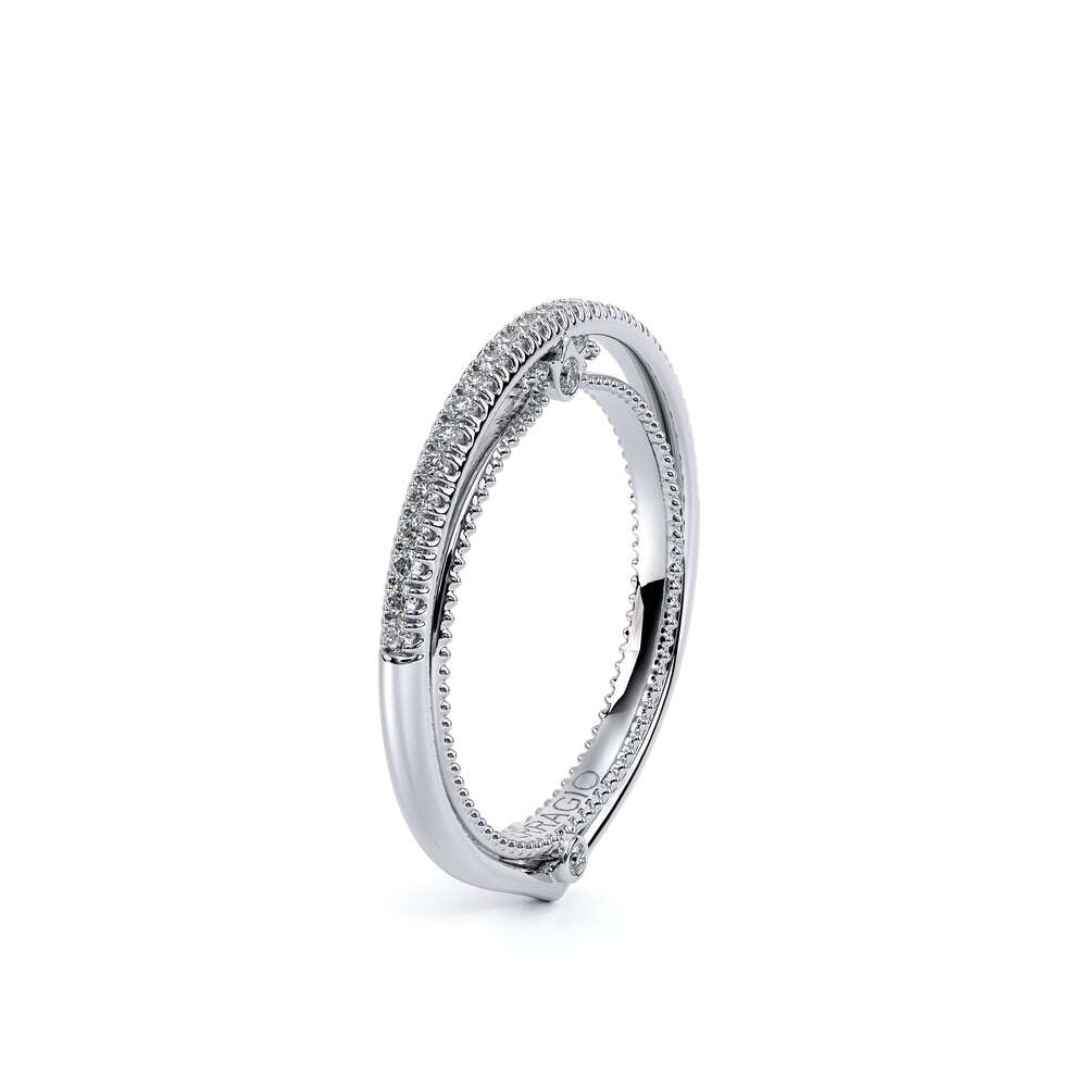 COUTURE-0421W-2T Elegant Twist Wedding band pave with round brilliant diamonds, featuring the Verragio Bezel set and upward Scrollwork Signature Beading profile, completed with the Couture pointed shank.