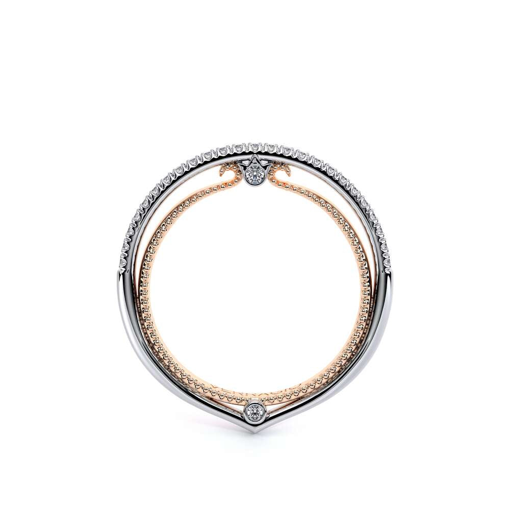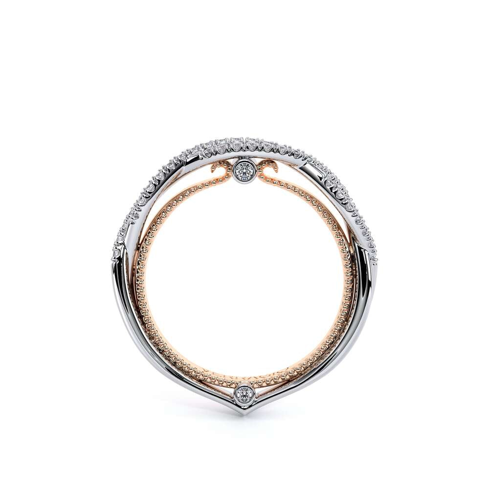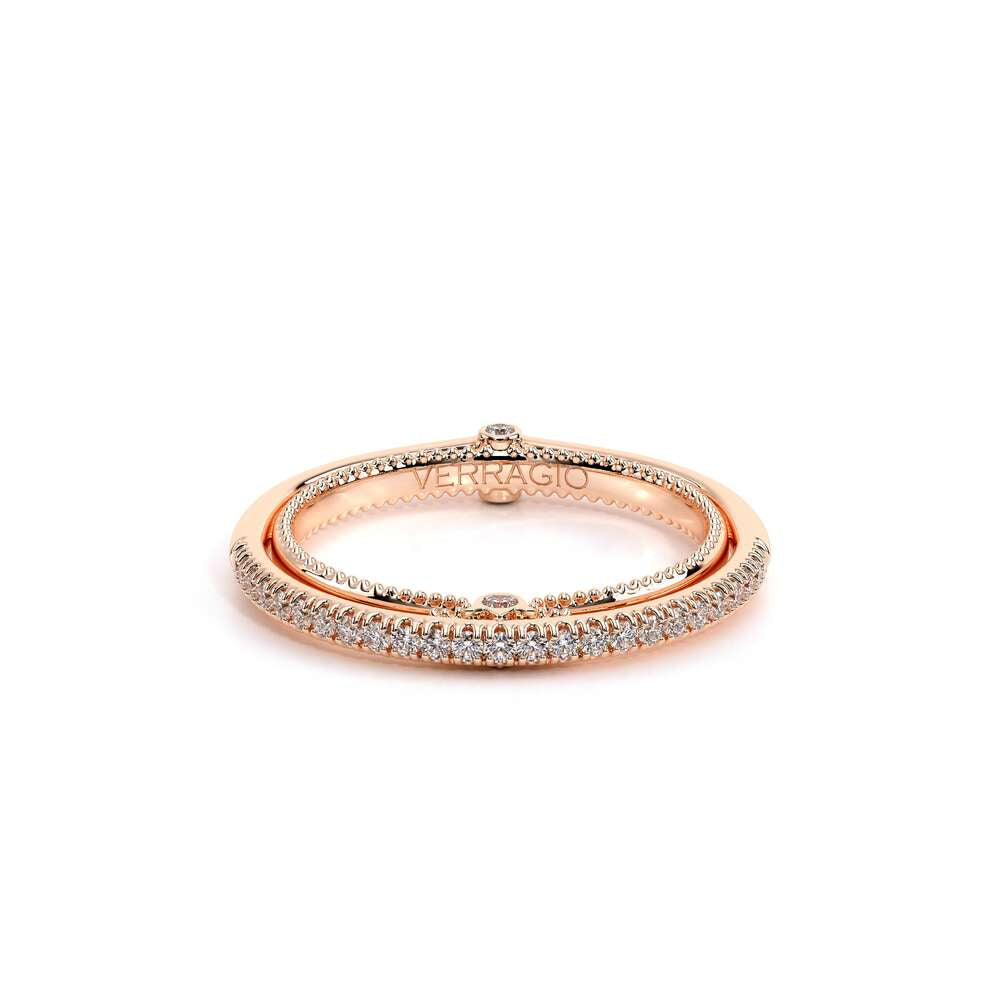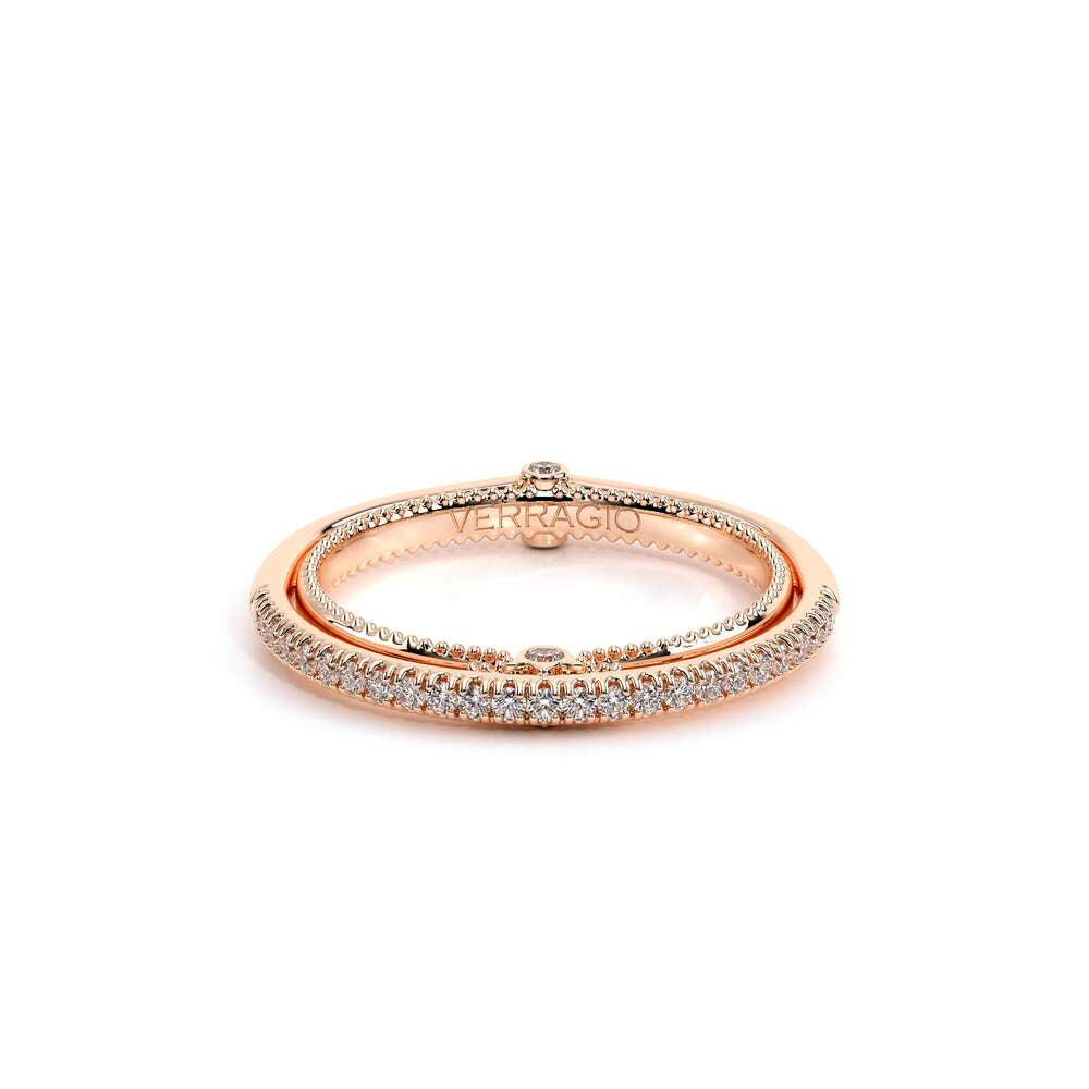 COUTURE-0421W-2T Elegant Twist Wedding band pave with round brilliant diamonds, featuring the Verragio Bezel set and upward Scrollwork Signature Beading profile, completed with the Couture pointed shank.