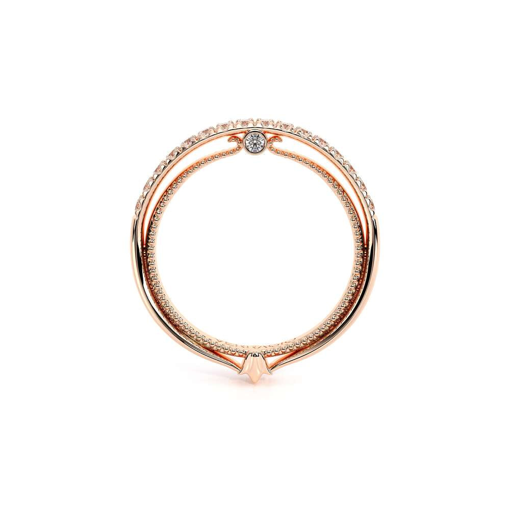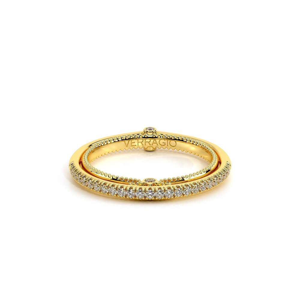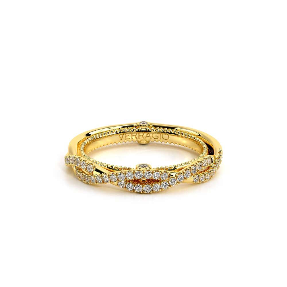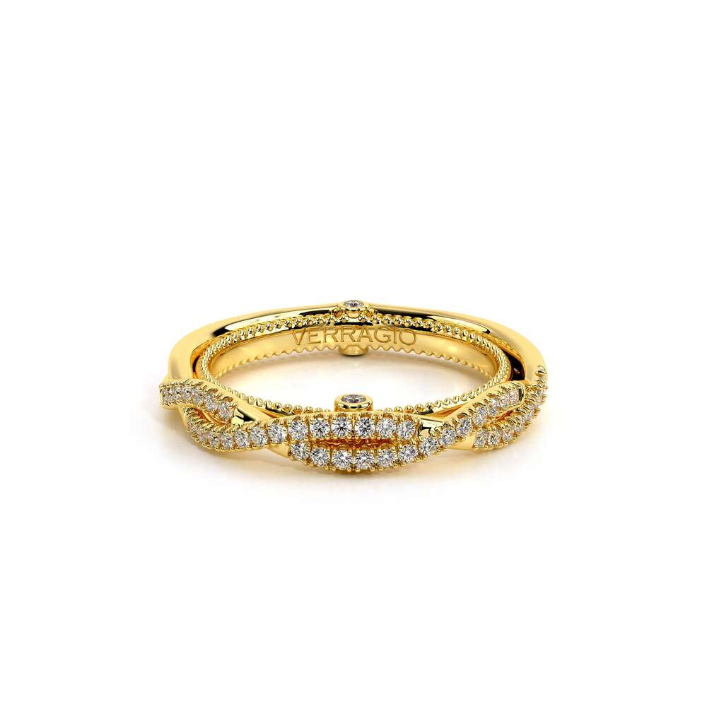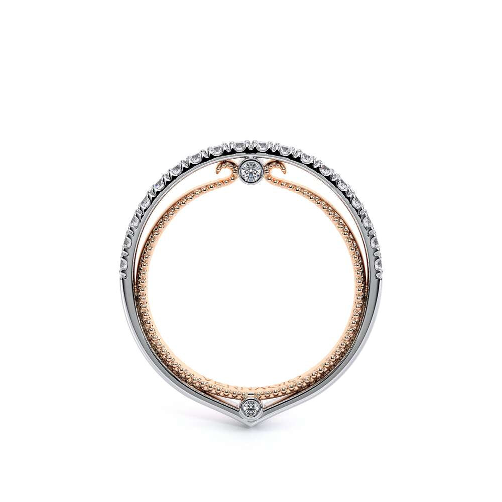 COUTURE-0421W-2T Elegant Twist Wedding band pave with round brilliant diamonds, featuring the Verragio Bezel set and upward Scrollwork Signature Beading profile, completed with the Couture pointed shank.