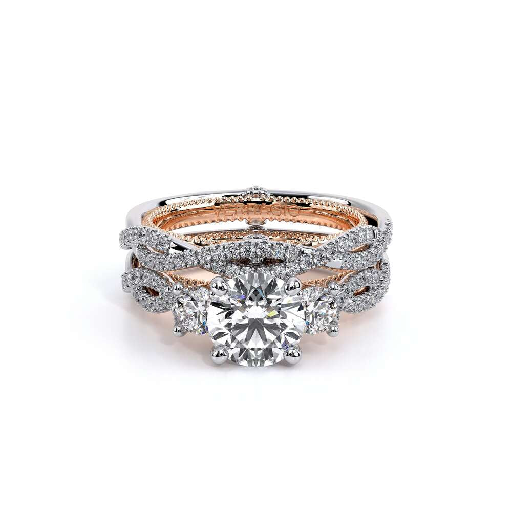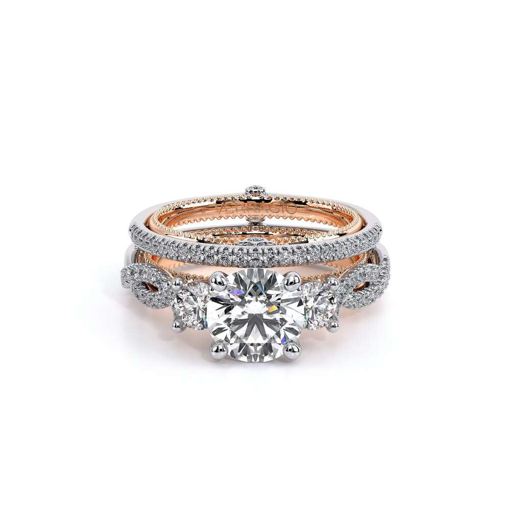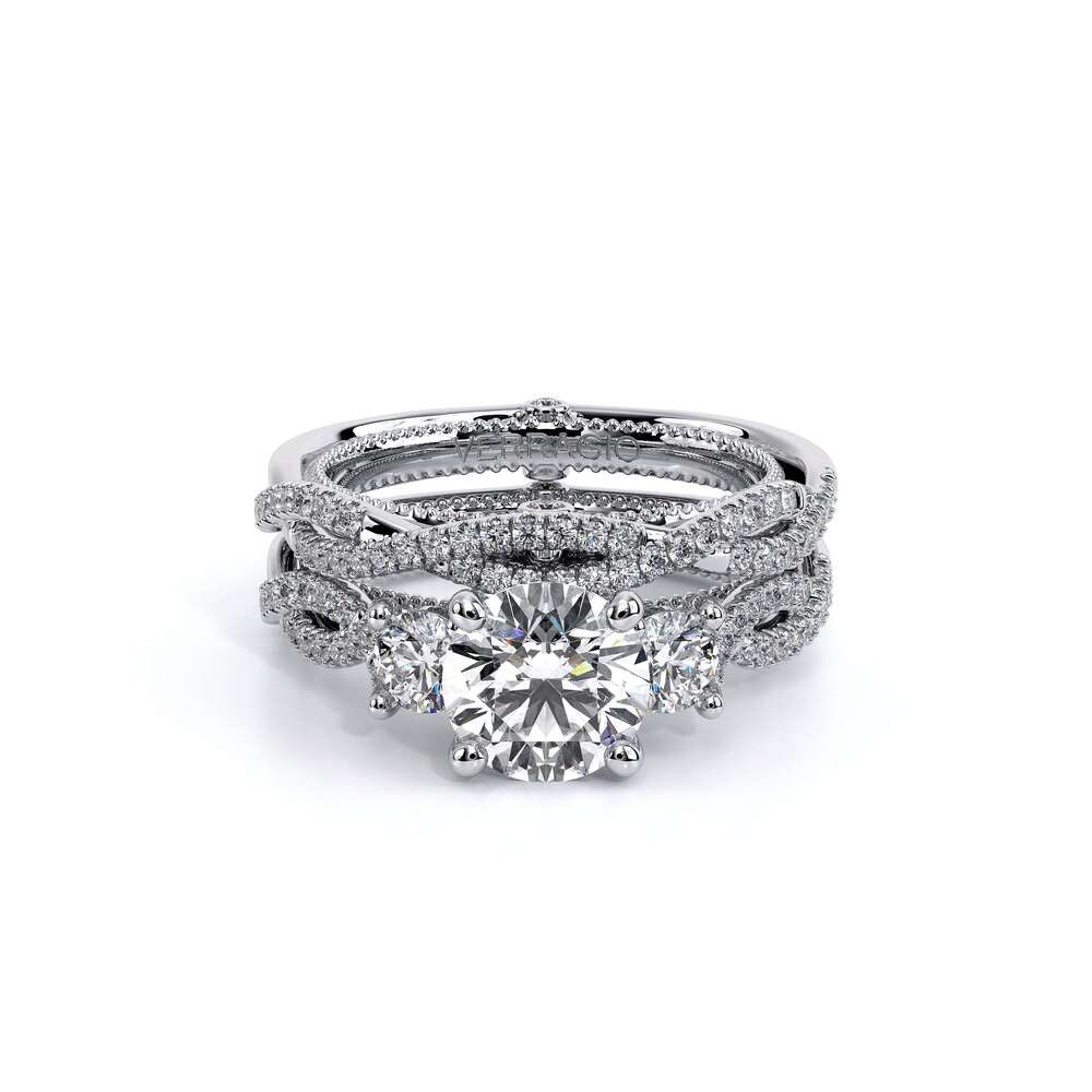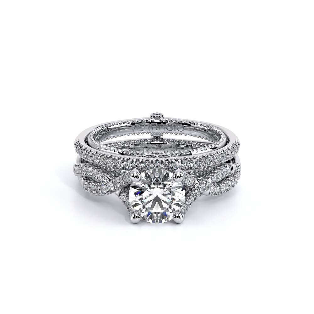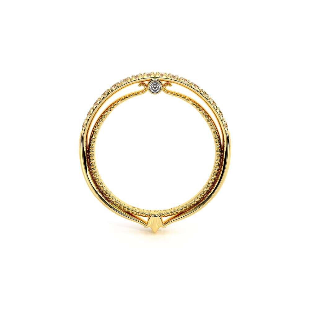 COUTURE-0421W-2T Elegant Twist Wedding band pave with round brilliant diamonds, featuring the Verragio Bezel set and upward Scrollwork Signature Beading profile, completed with the Couture pointed shank.