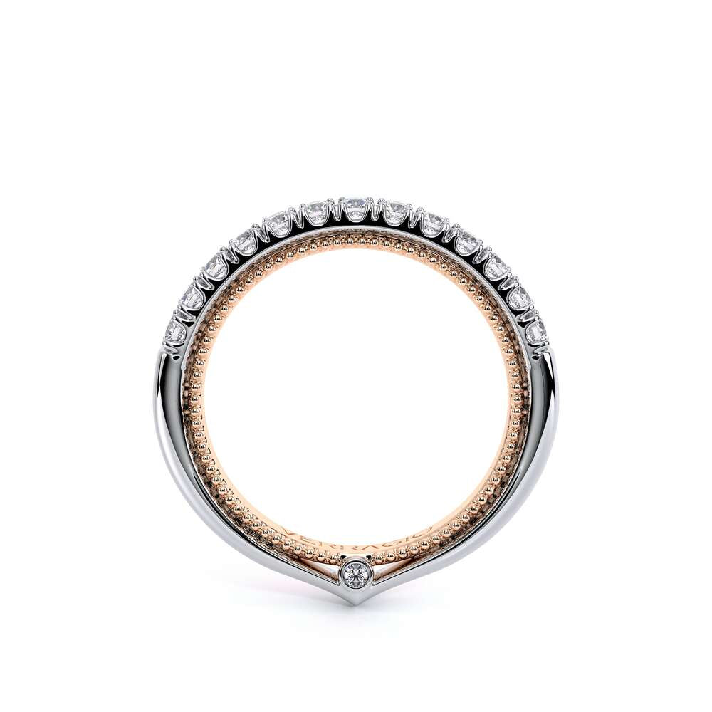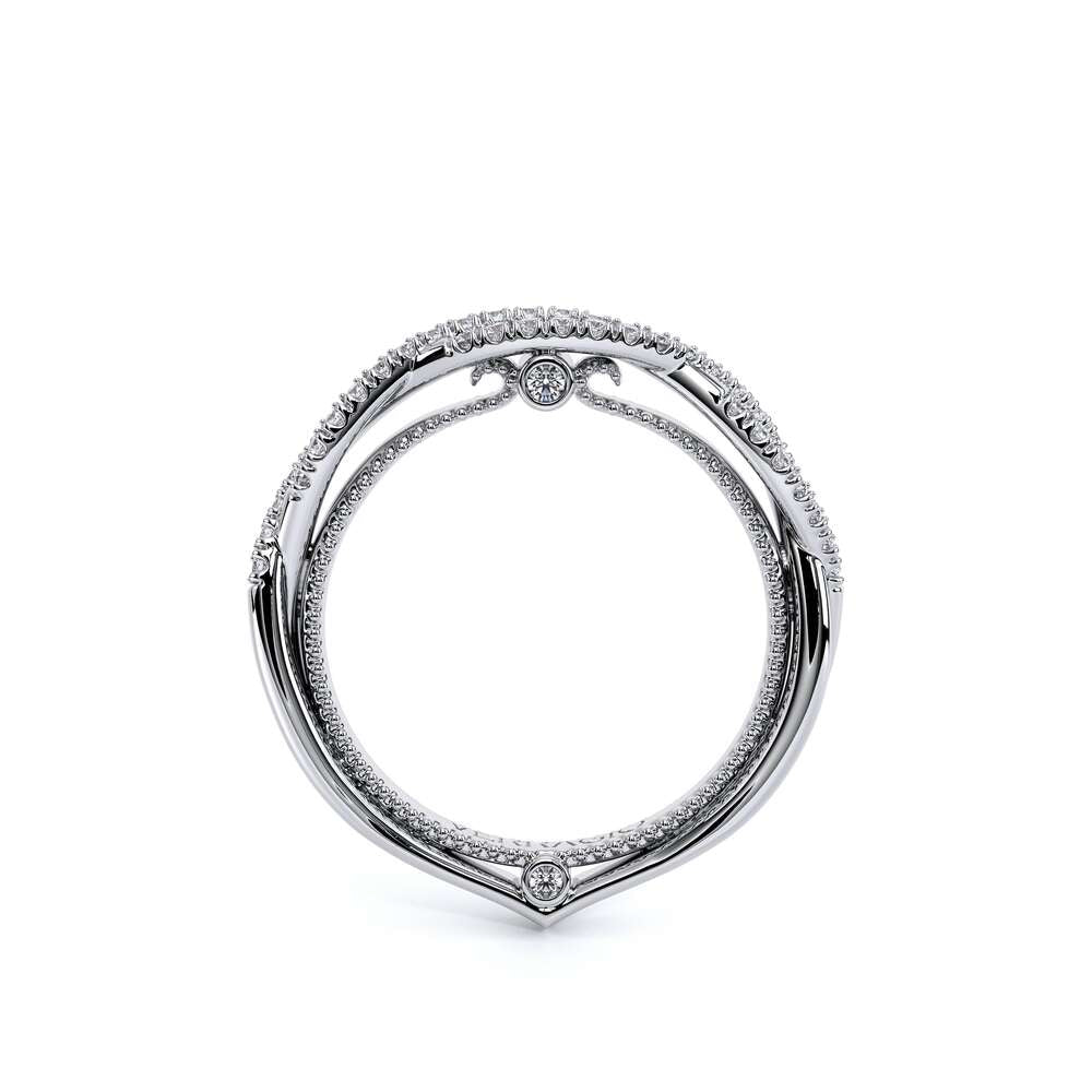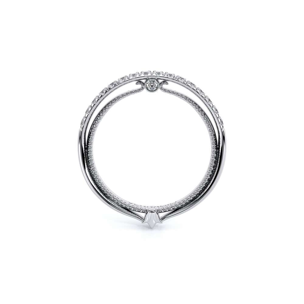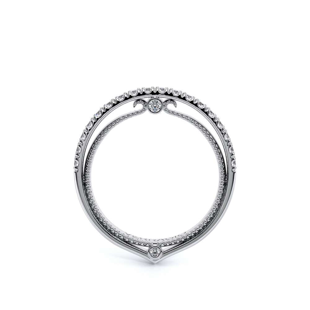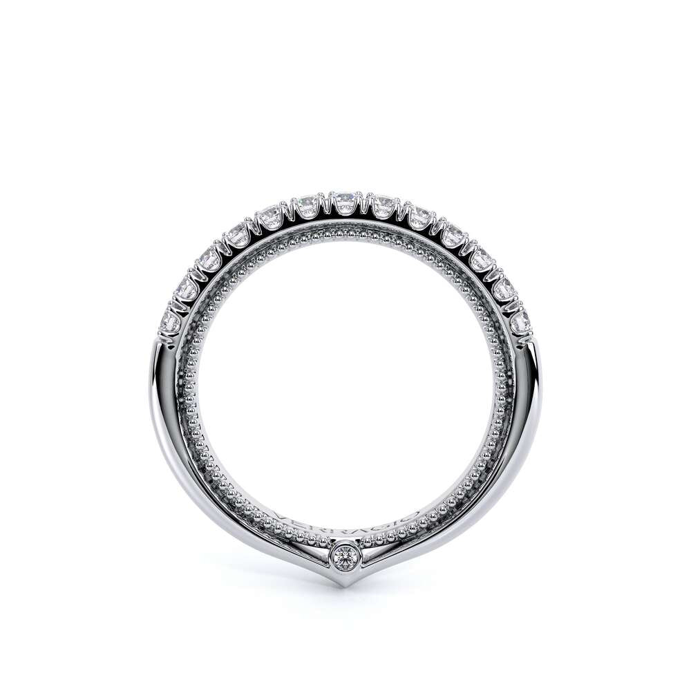 COUTURE-0420W-2T Classic Wedding band pave with round brilliant diamonds, featuring full Signature Beading profile, completed with the Couture pointed shank and Verragio Bezel immersed.