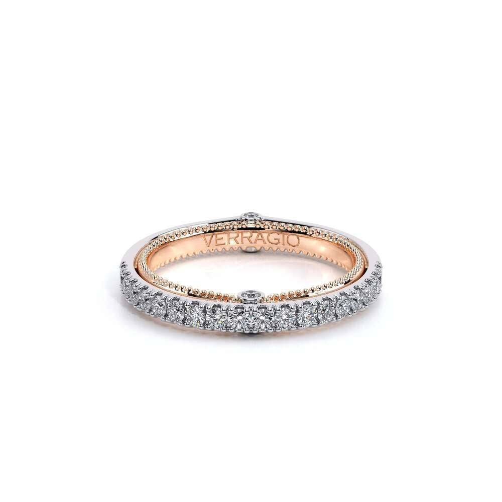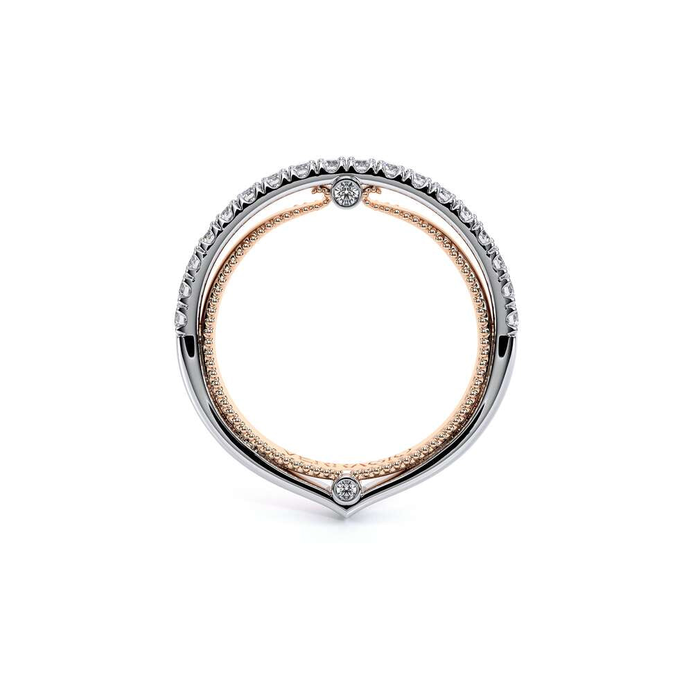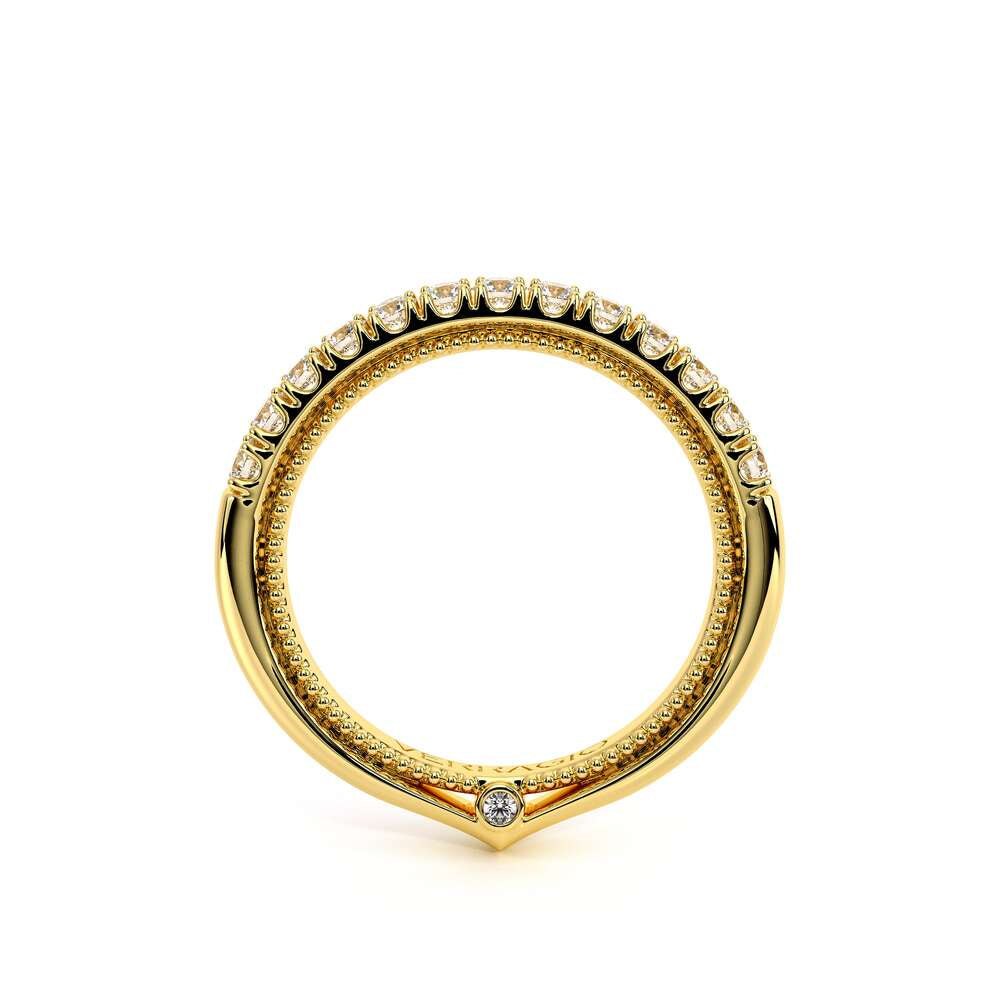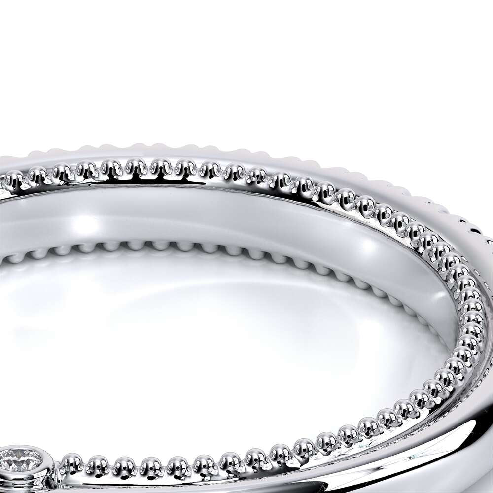 COUTURE-0420W-2T Classic Wedding band pave with round brilliant diamonds, featuring full Signature Beading profile, completed with the Couture pointed shank and Verragio Bezel immersed.