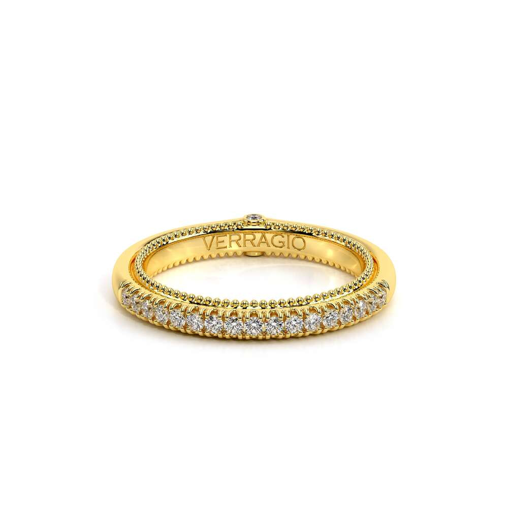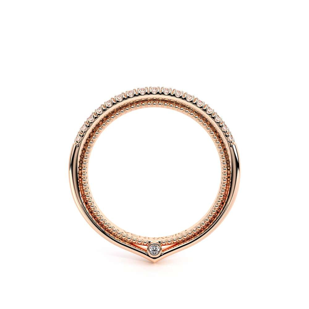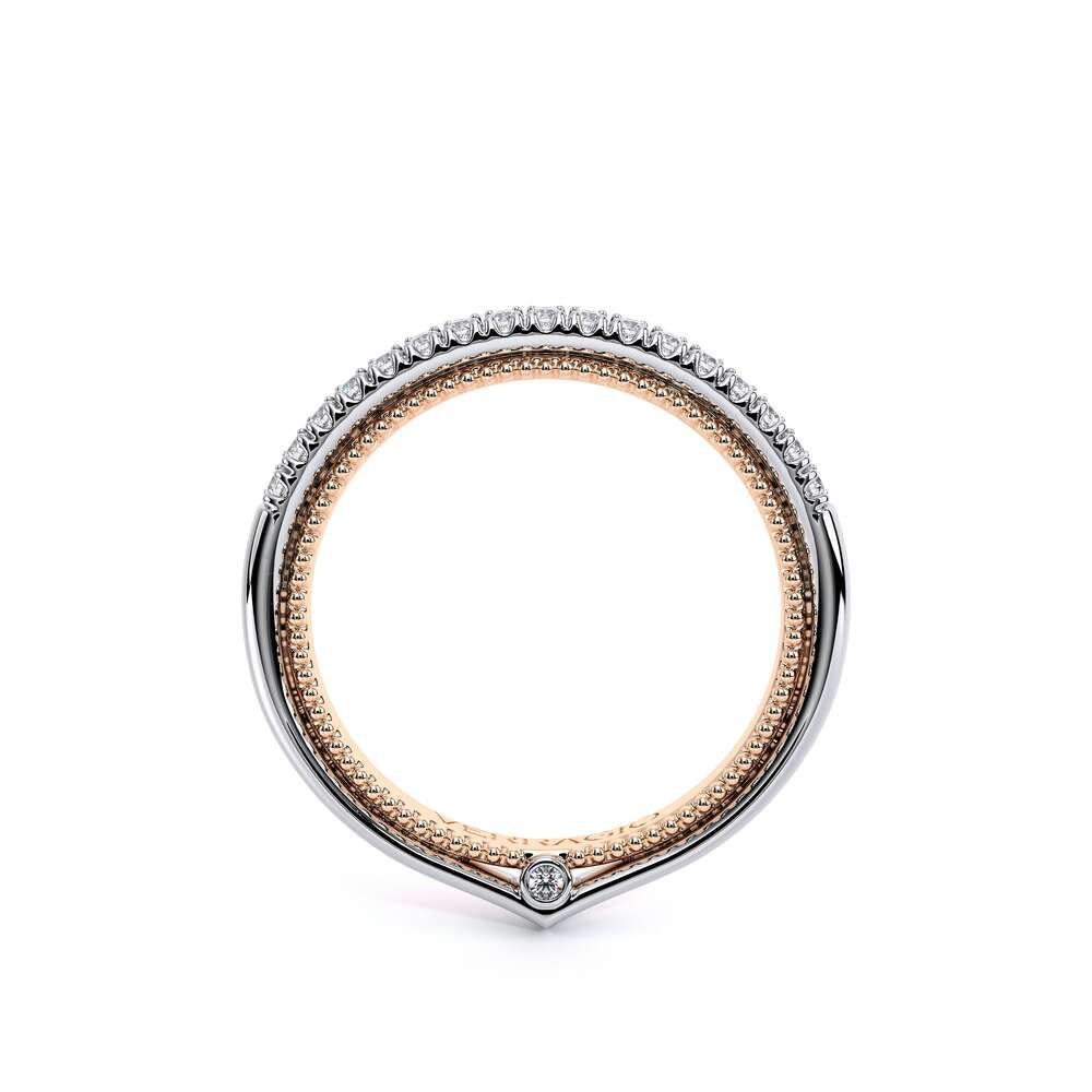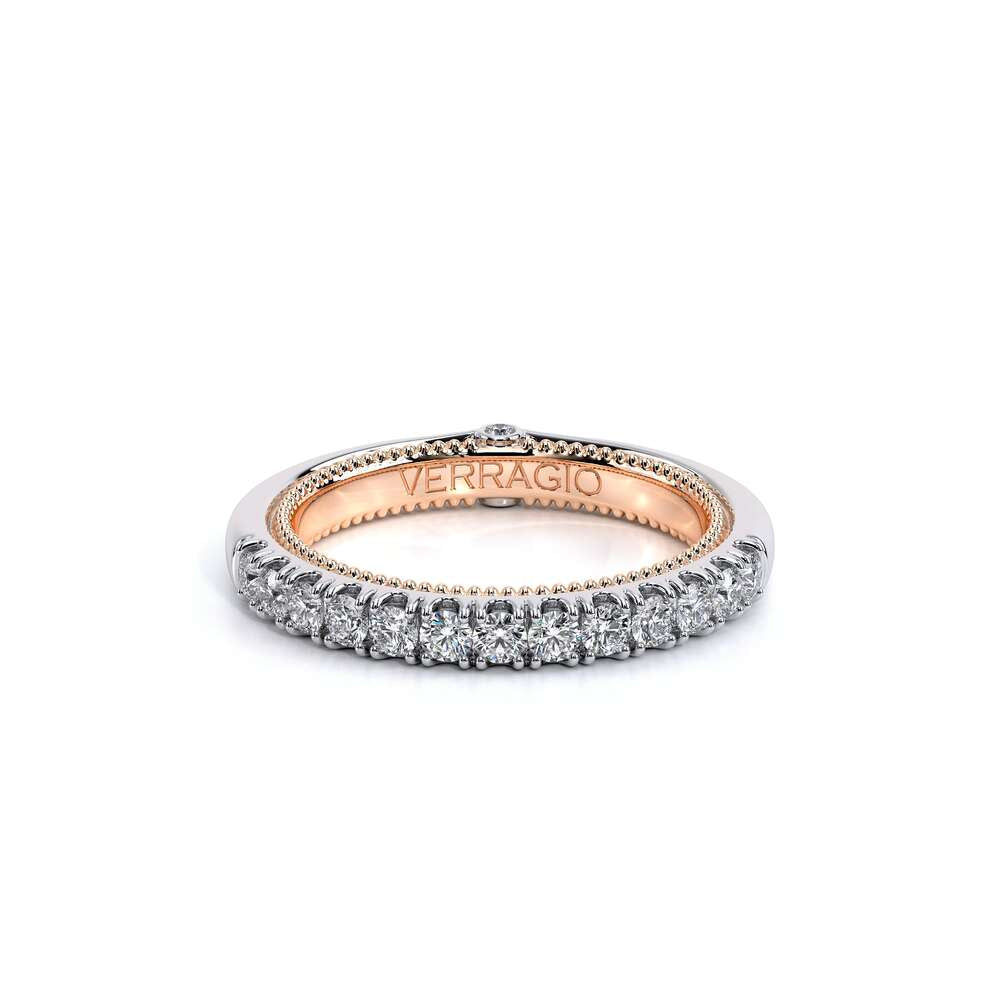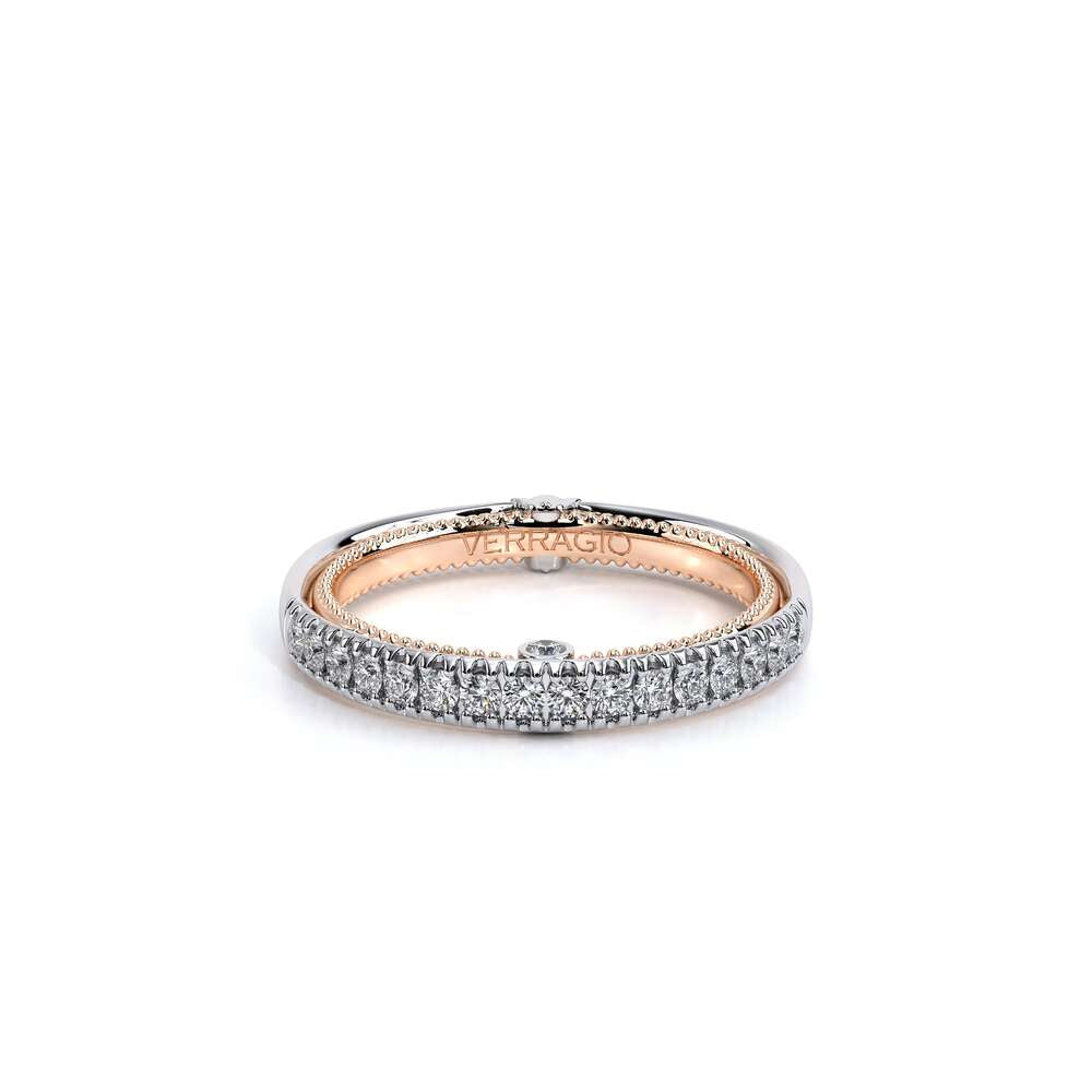 COUTURE-0420W-2T Classic Wedding band pave with round brilliant diamonds, featuring full Signature Beading profile, completed with the Couture pointed shank and Verragio Bezel immersed.