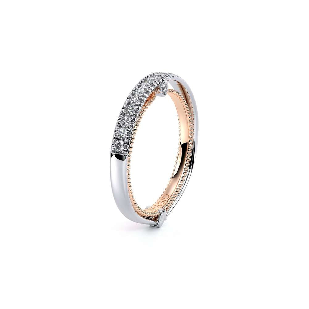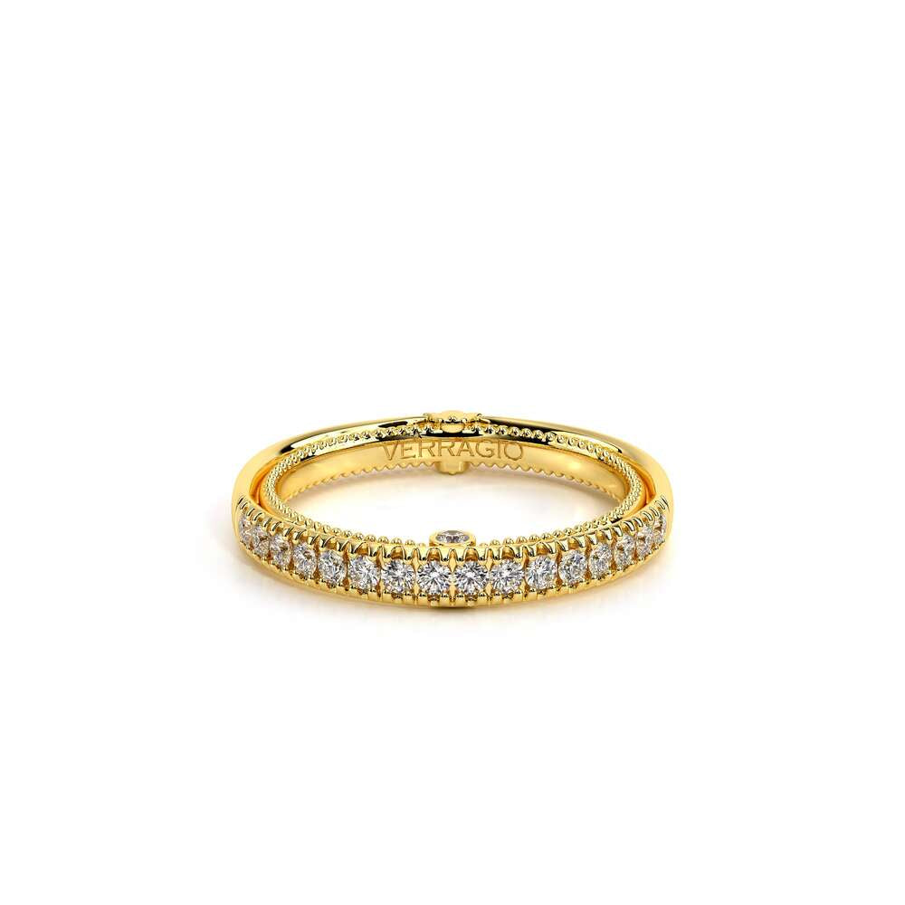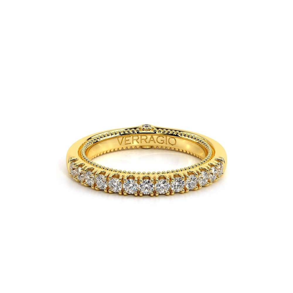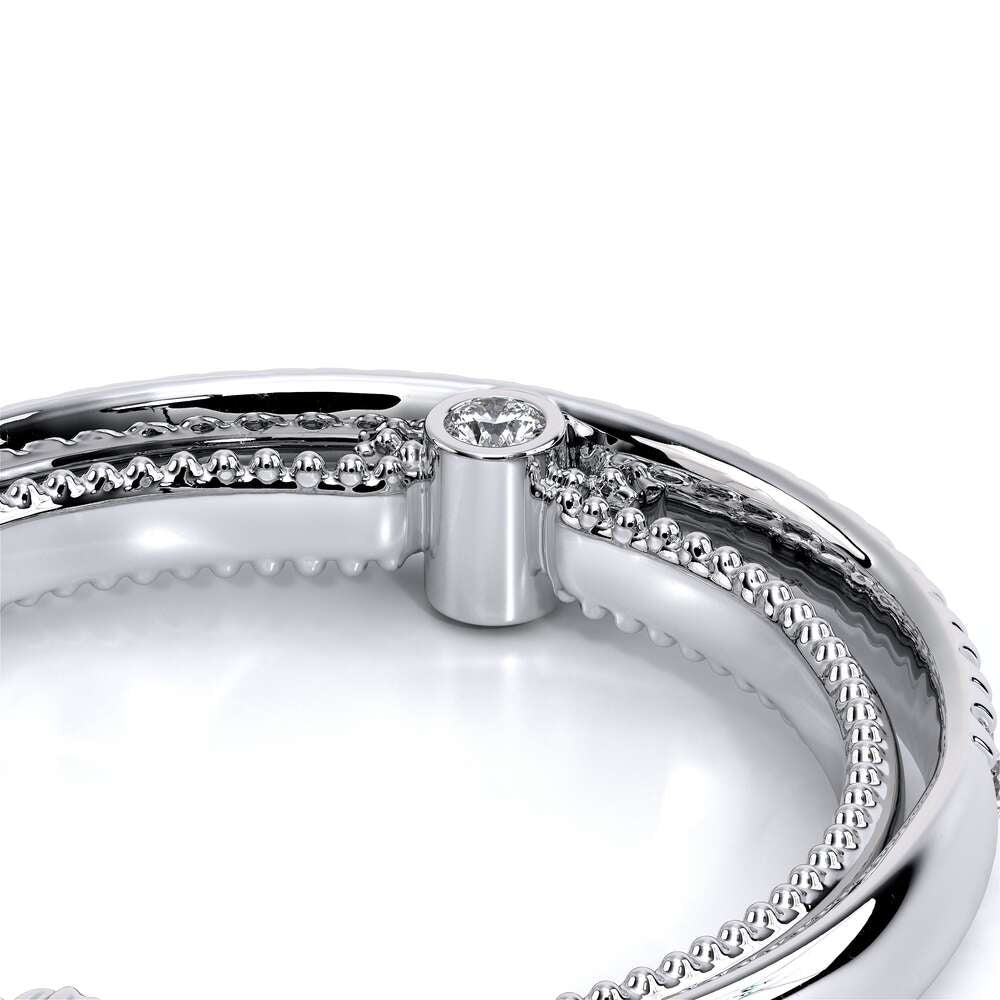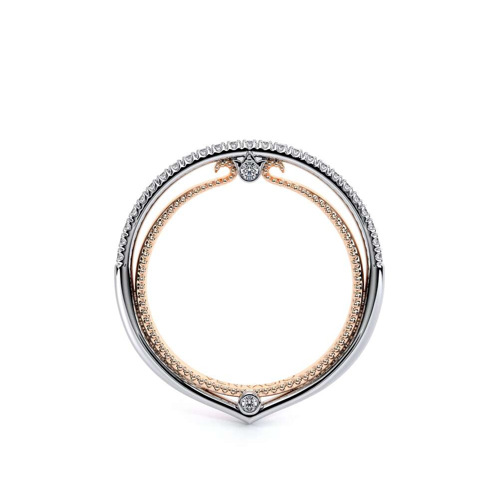 COUTURE-0420W-2T Classic Wedding band pave with round brilliant diamonds, featuring full Signature Beading profile, completed with the Couture pointed shank and Verragio Bezel immersed.