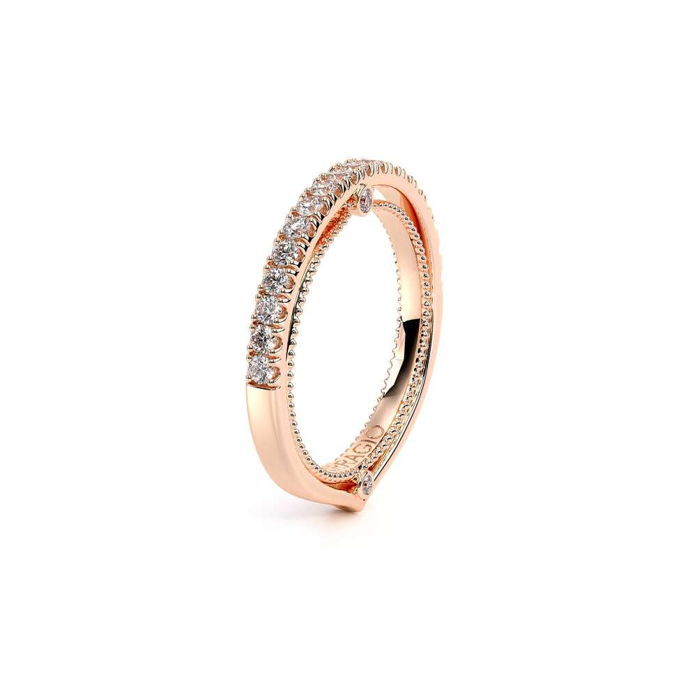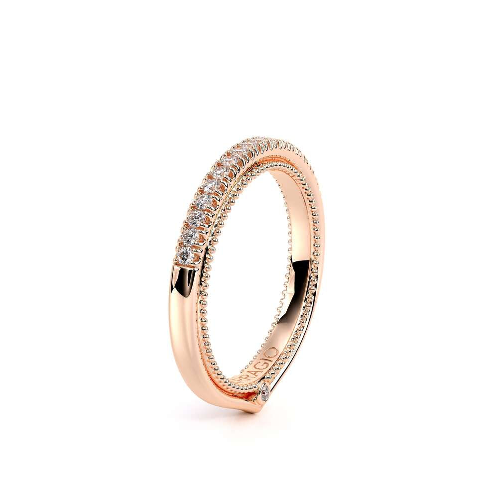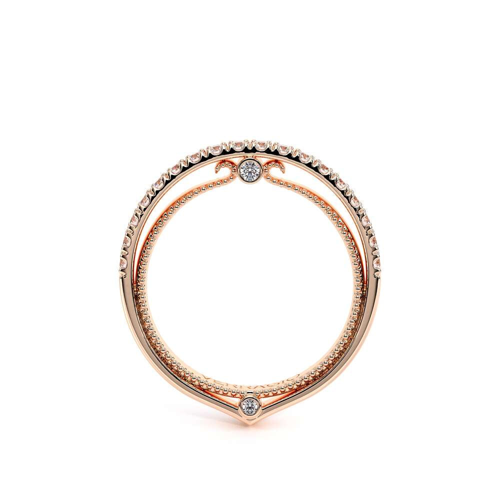 COUTURE-0429W Dazzling Wedding band pave with round brilliant diamonds, featuring the Verragio Bezel Set and upward Scrollwork Signature Beading profile, completed with the Couture pointed shank.