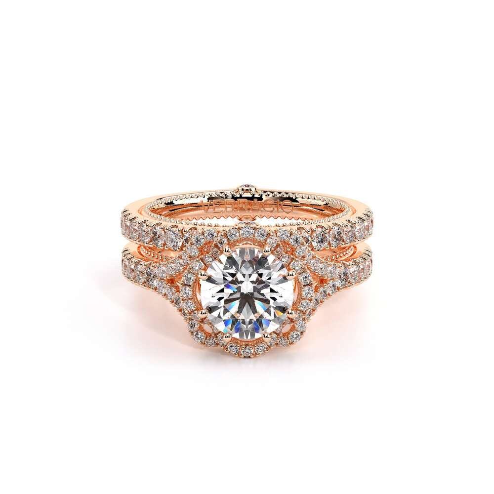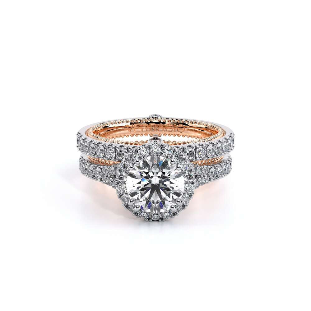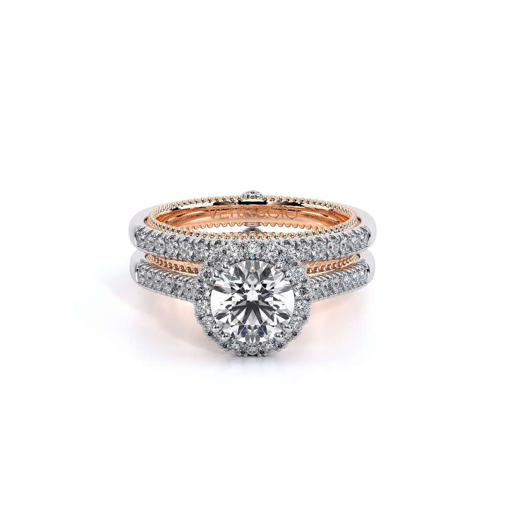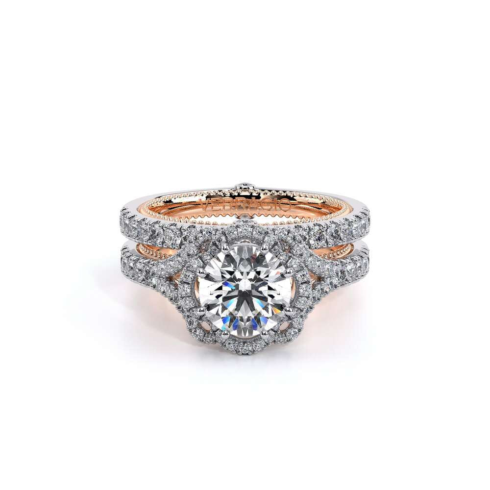 COUTURE-0424R Split shank Round Halo Engagement ring. The shank is adorned with pave set round brilliant-cut diamonds. Featured by, our timeless Verragio crest and beading complete with a Couture shank.