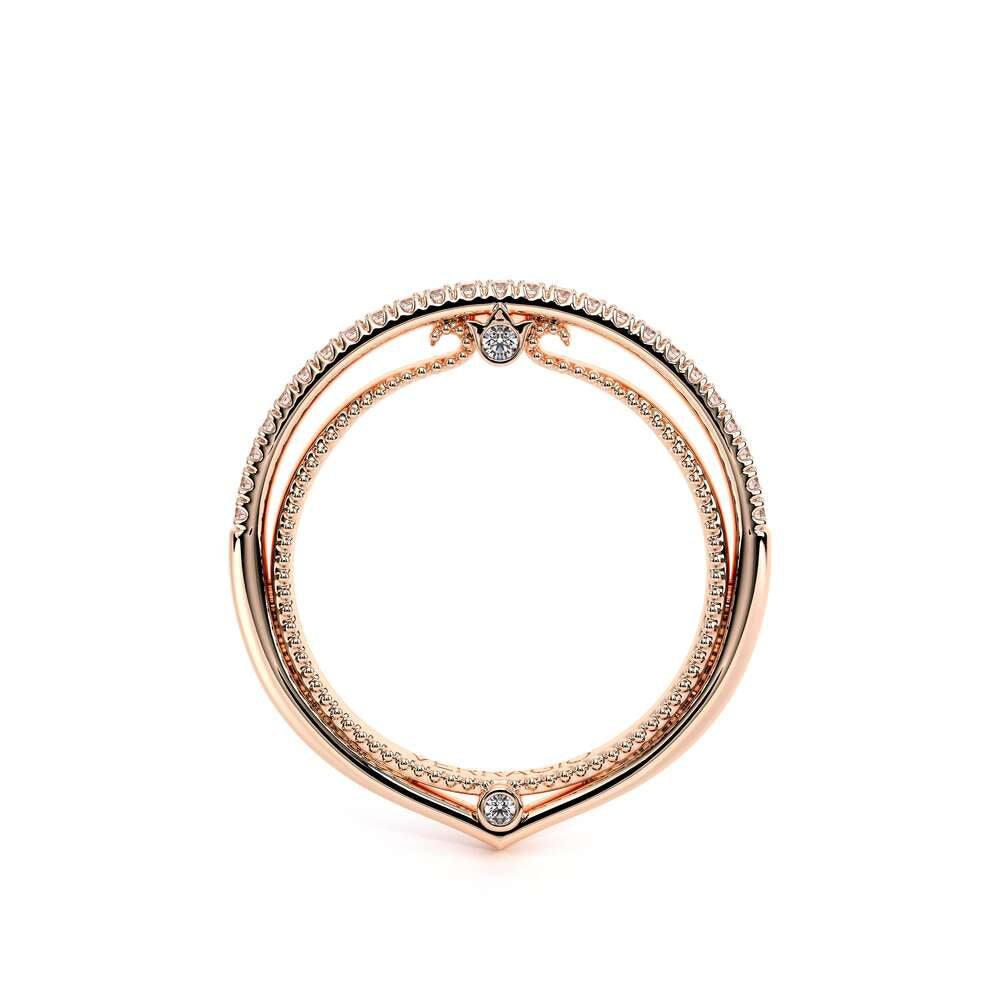 COUTURE-0426W Timeless Wedding band pave with round brilliant diamonds, featuring the Verragio Bezel set and upward Scrollwork Signature Beading profile, completed with the Couture pointed shank.