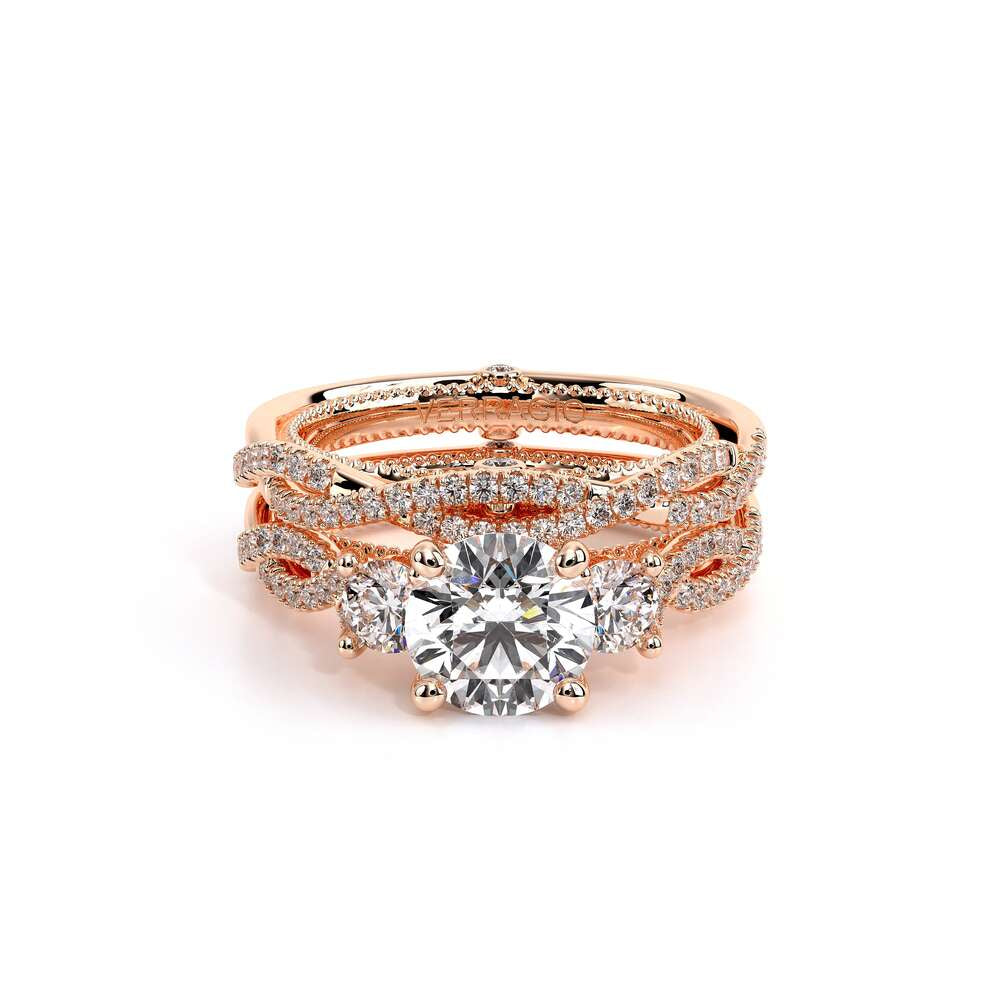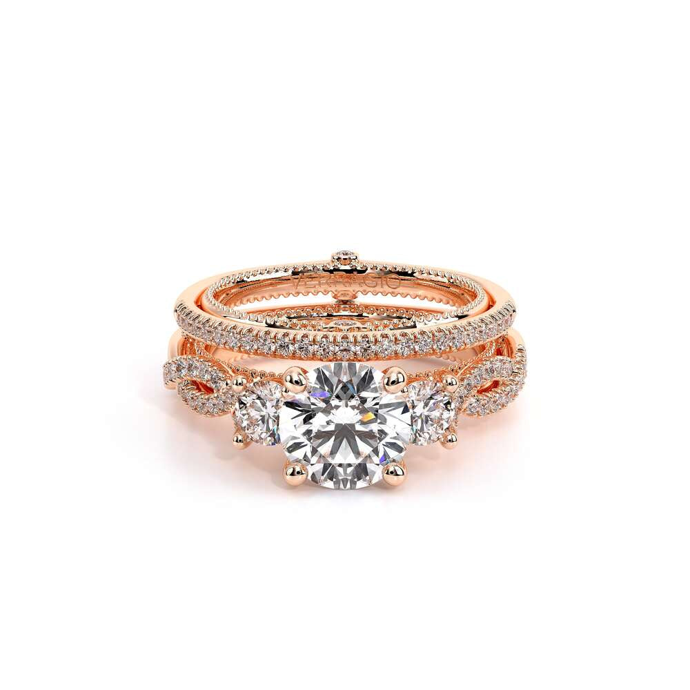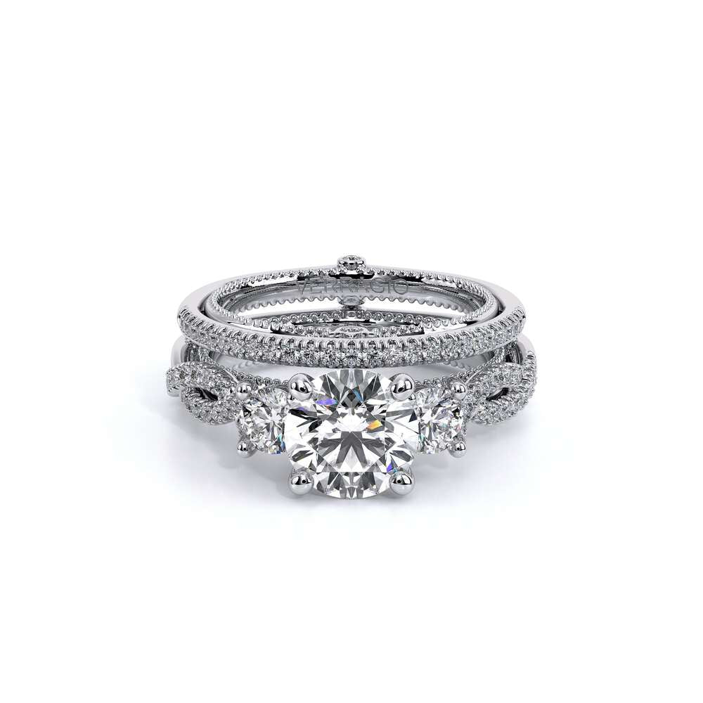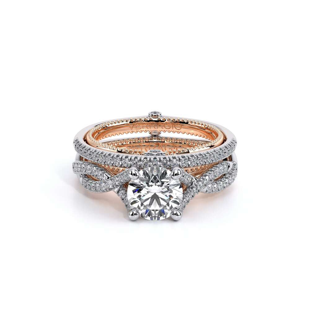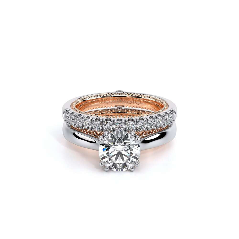COUTURE-0418R Round Classic Solitaire Engagement ring with simple Double Claw Prongs, featuring the Verragio Crest and upward Scrollwork Signature Beading profile, completed with the Couture pointed shank.
