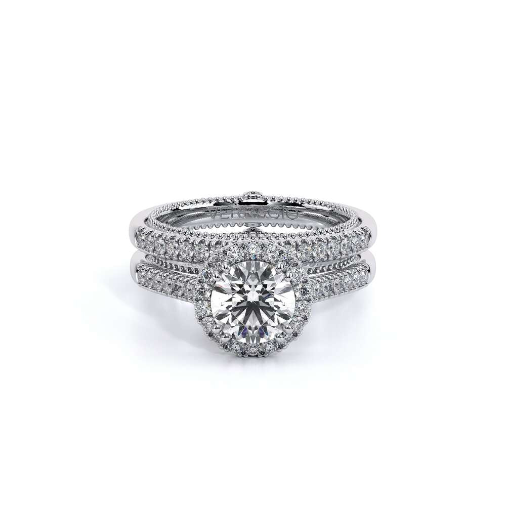COUTURE-0420R Round Halo Engagement ring pave set with round brilliant diamonds, featuring the Verragio Crest-Bezel set and upward Scrollwork Signature Beading profile, completed with the Couture pointed shank.