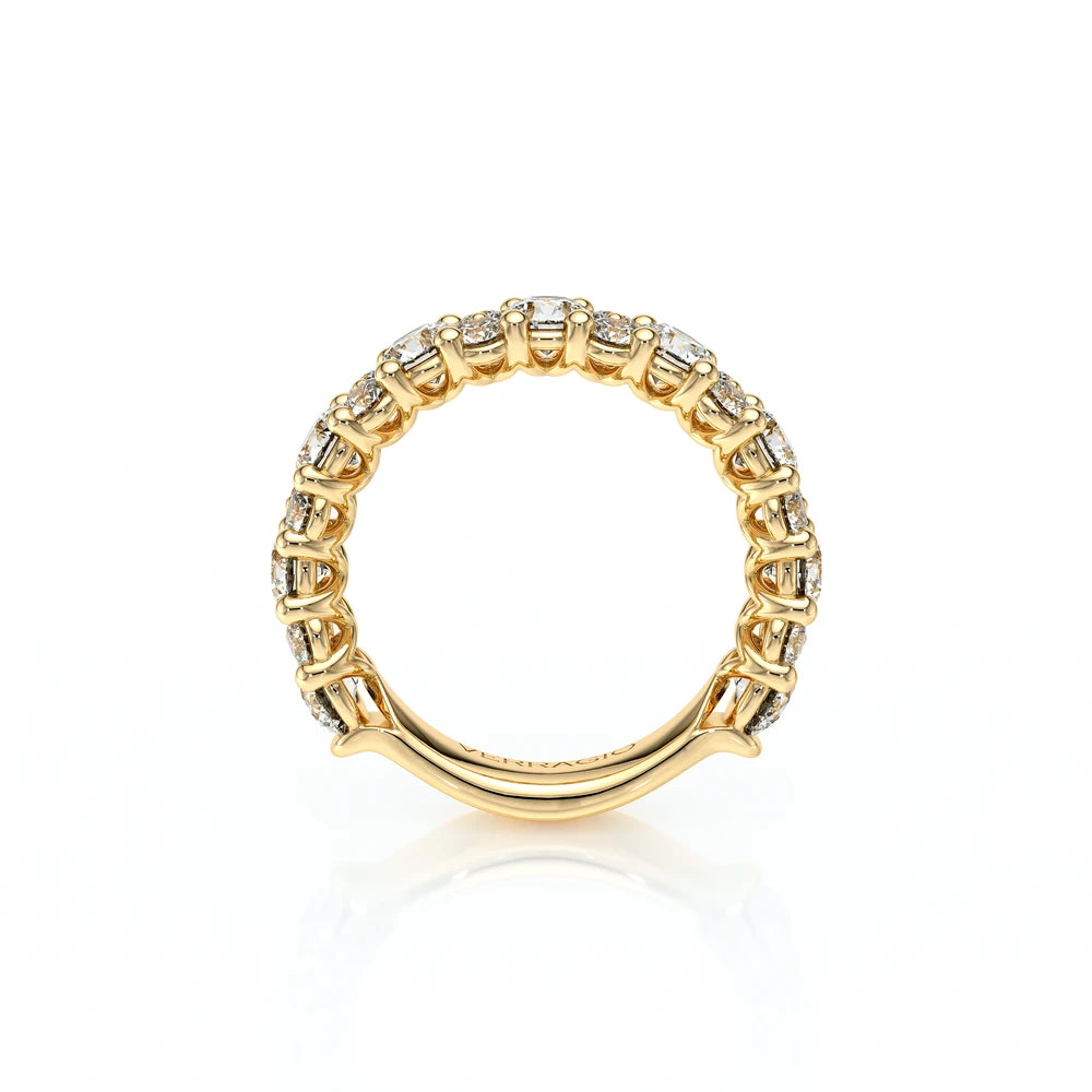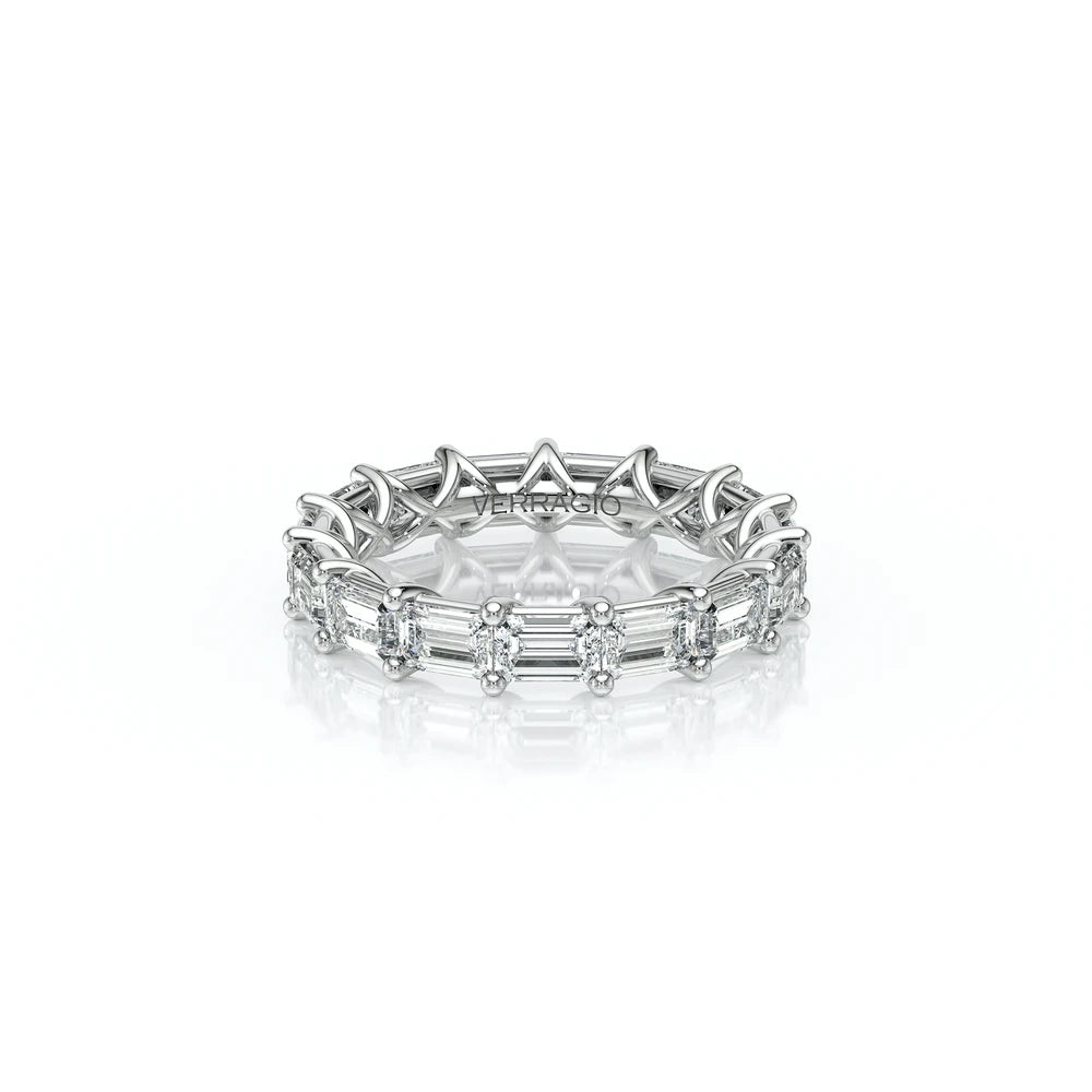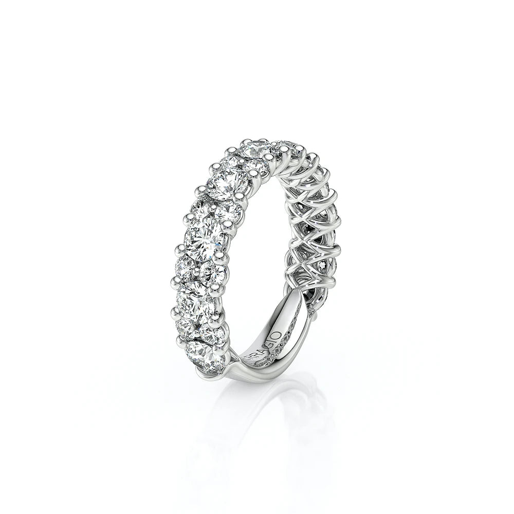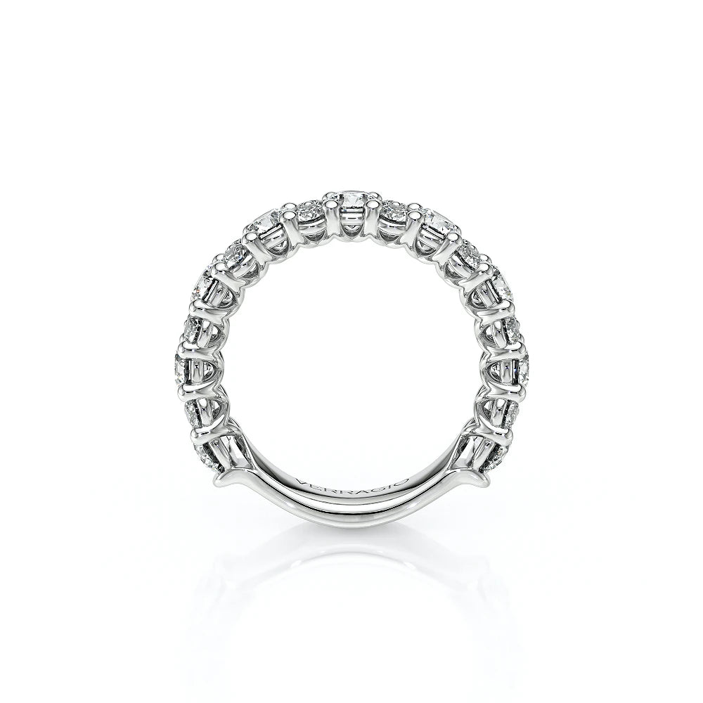 INSIGNIA-7091WSB diamond wedding ring from the Insignia Collection, featuring round brilliant-cut diamonds pave set on a straight band. Unique with bezel set diamonds with distinguishing Insignia Scrollwork accompanied by Verragio's signature crest and beading.