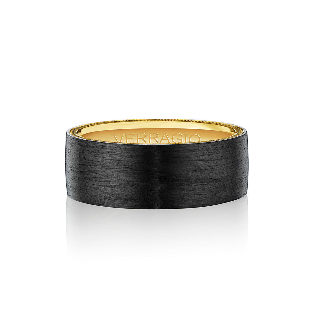 A bold, wide accent of carbon fiber fills the entire width of this band. Beneath it lies the metal, accented by beautiful French beading, enhancing the band's profile and creating an astonishing finish. This band is 8mm wide and is durable and comfortable for everyday wear.