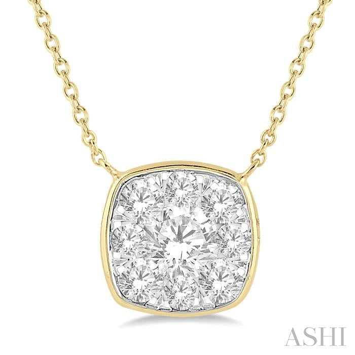 A beautifully set, unblemished Lovebright diamond necklace, this catches the eye instantly. The cushion shape necklace is decorated with 9 invisible set round cut diamonds. A 1/5 ctw invisible set round cut diamond nestles in the center, while 4 invisible set round cut diamonds each of 1/50 ct and 1/20 encircle the center stone. An 18-inch CAT30 cat chain with lobster clasp closure comes included with the necklace. The link chain and necklace are both styled in 14-karat yellow and white gold. The total diamond weight is 1/2 ctw. Other metal types & colors may be available.