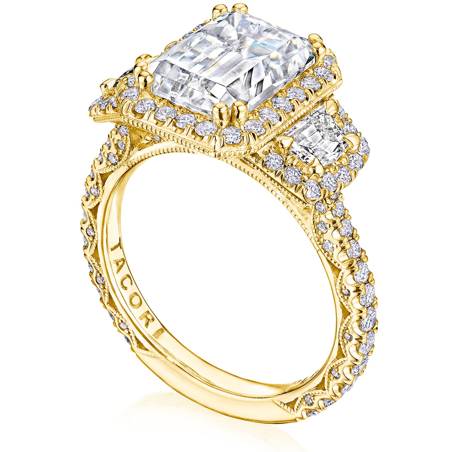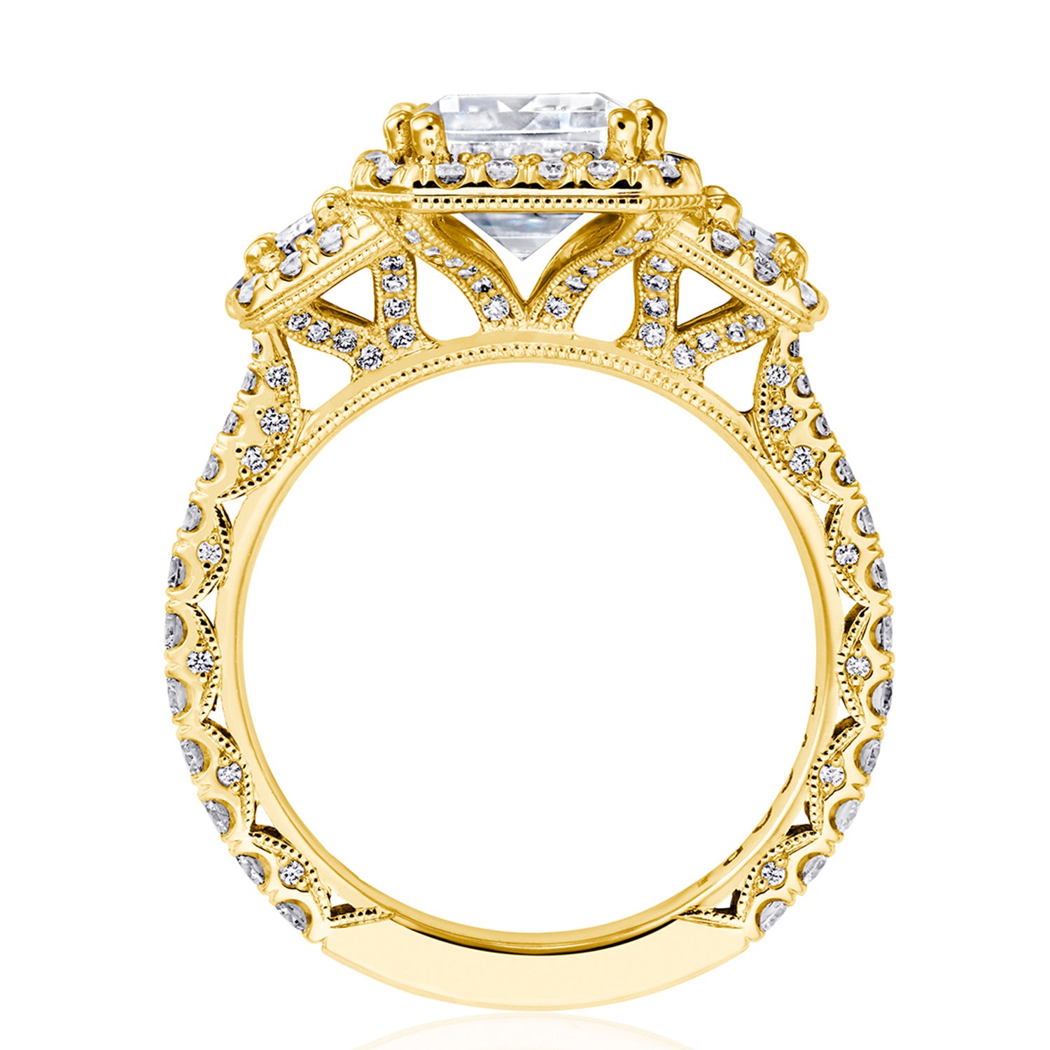 Two cadillac-cut side diamonds embrace the center stone, while a bloom encircles all crowning diamonds. Just below, diamond-studded prongs meet a Petite Crescent fabric and a ceiling of small pavé-set diamonds.