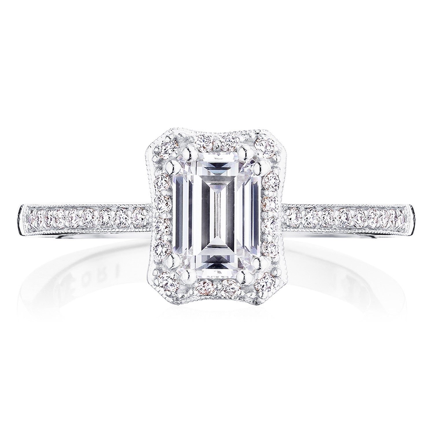 Round-brilliant diamonds decorate the ceiling and bloom around the center stone, for an even and ethereal sparkle. Coastal Crescent fabric with pinpoint diamond detailing adds a clean texture to the innerface.