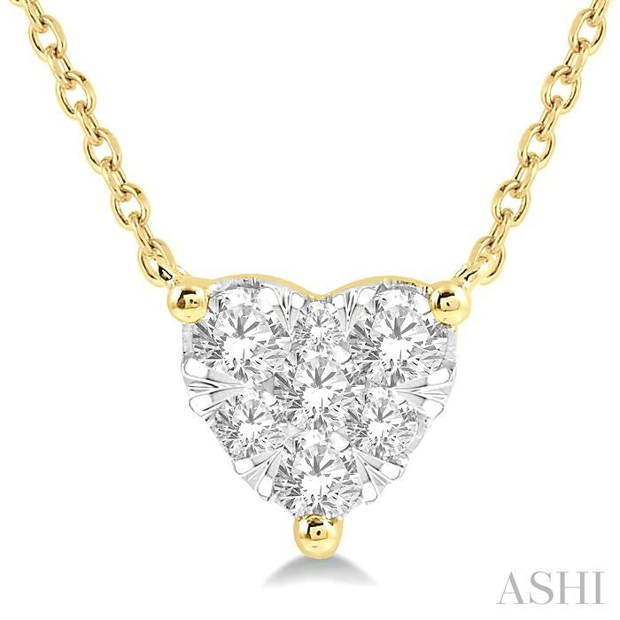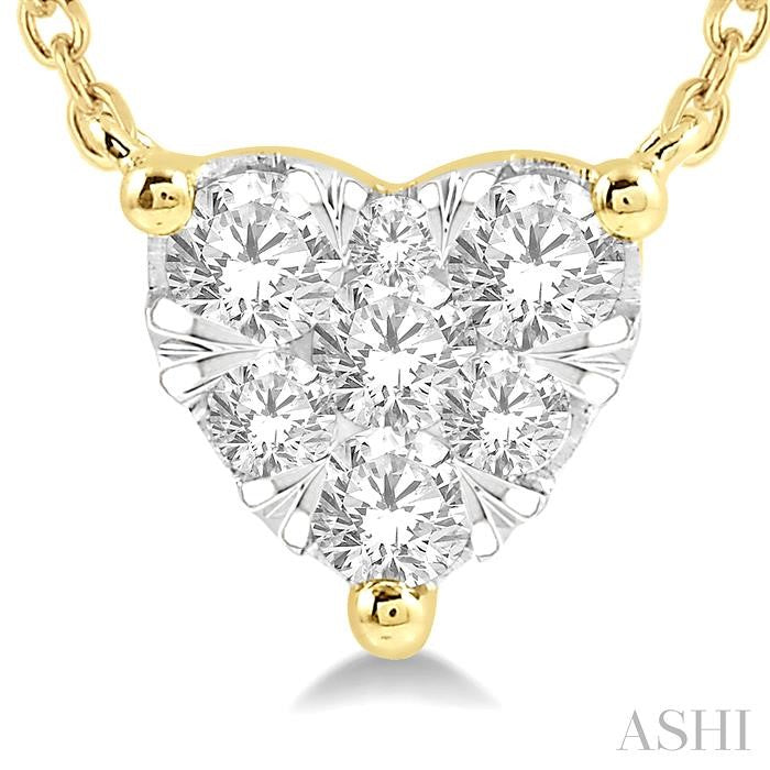 Luxury with delicacy has taken the shape of this 'Lovebright' heart necklace This pleasing necklace of high excellence exhibits 7 invisibly set round diamonds in enduring 14 Karat Yellow and white gold. With a cat chain and a lobster lock for secure wearing, this necklace is a wonderful gift to celebrate any event. Total diamond weight is 1/4 ctw. Other metal types & colors may be available.