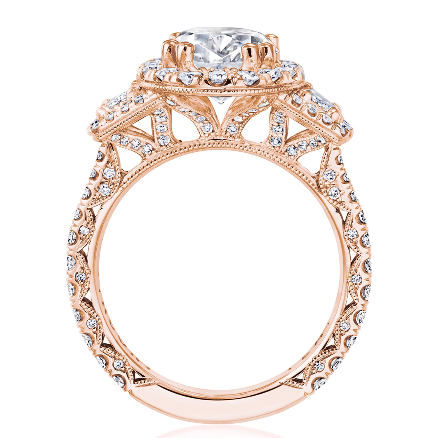 Two cadillac-cut side diamonds embrace the center stone, while a bloom encircles all crowning diamonds. Just below, diamond-studded prongs meet a Petite Crescent fabric and a ceiling of small pavé-set diamonds.