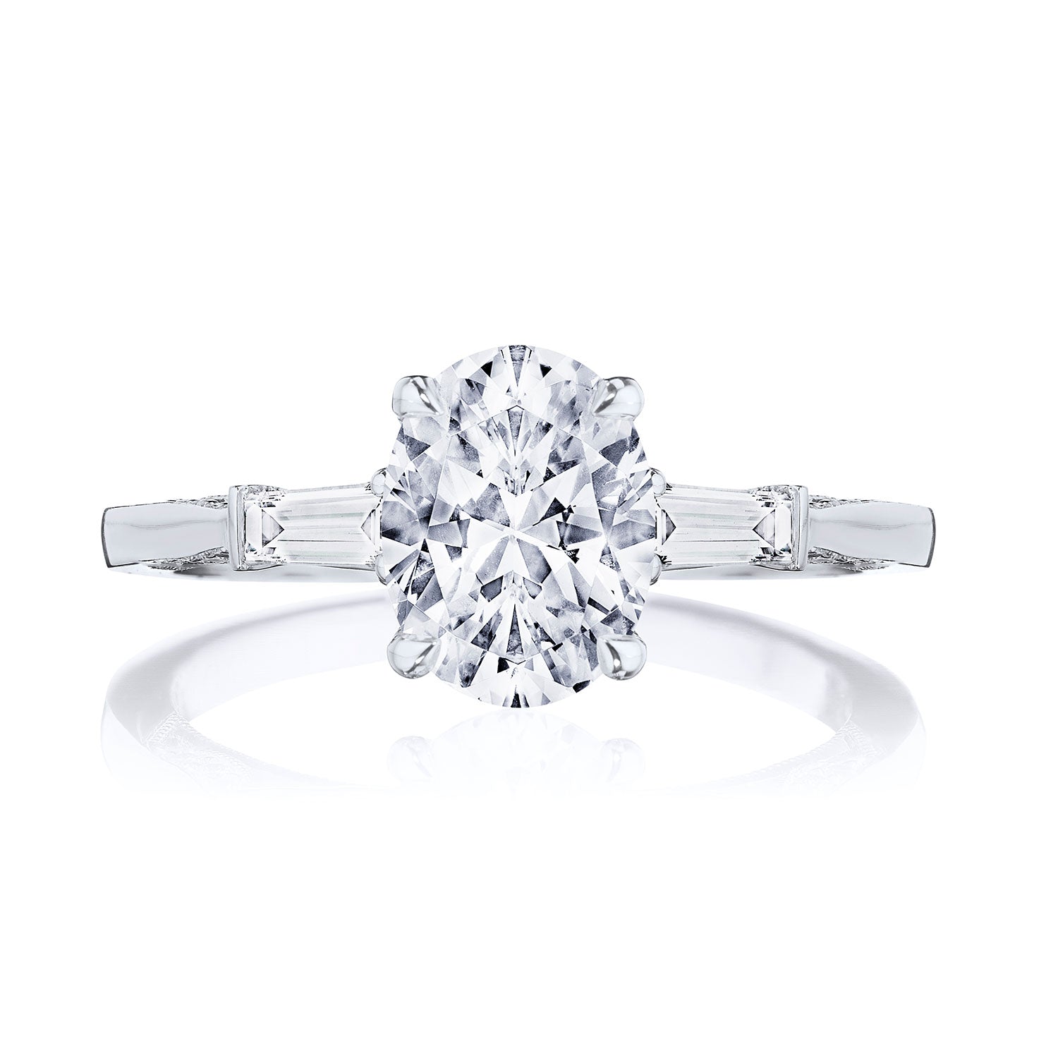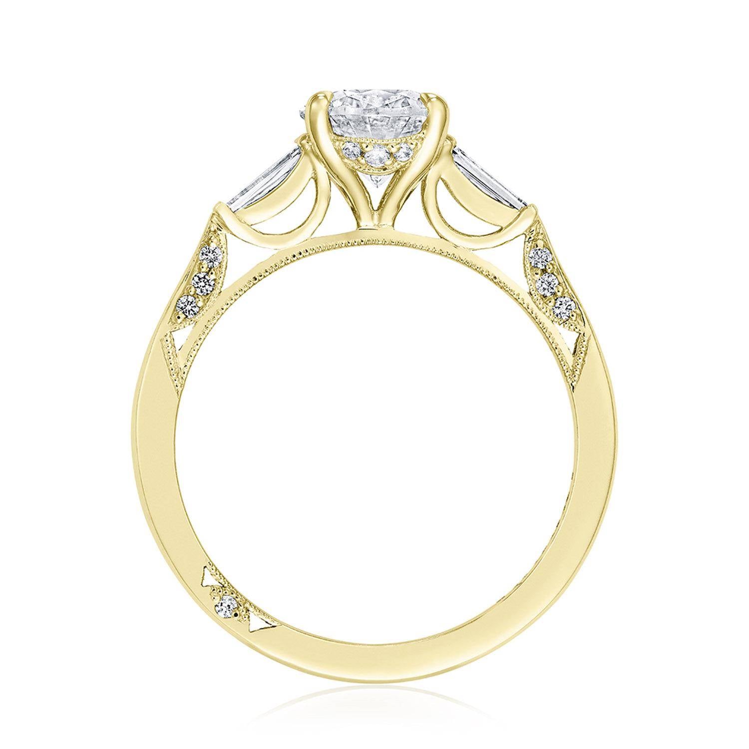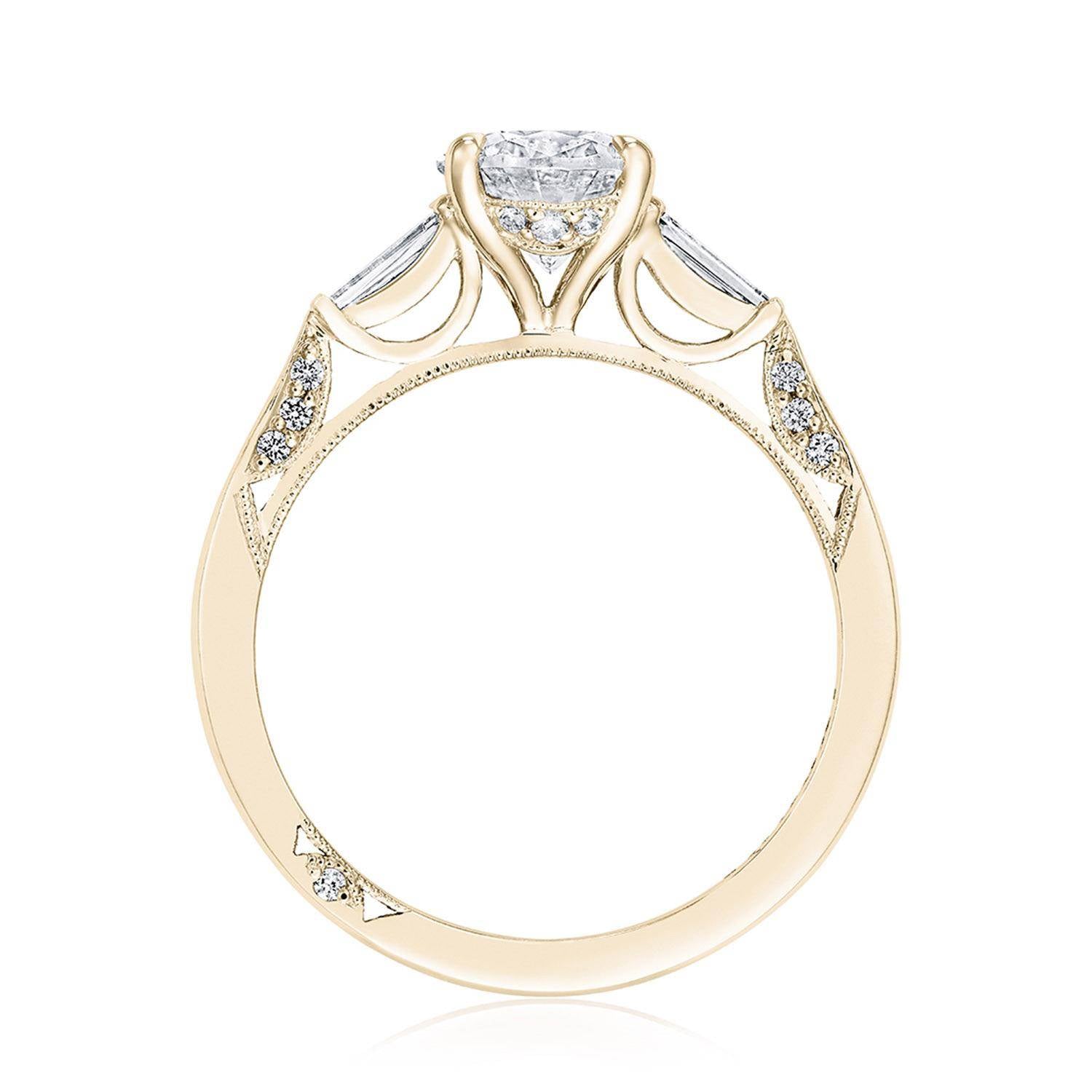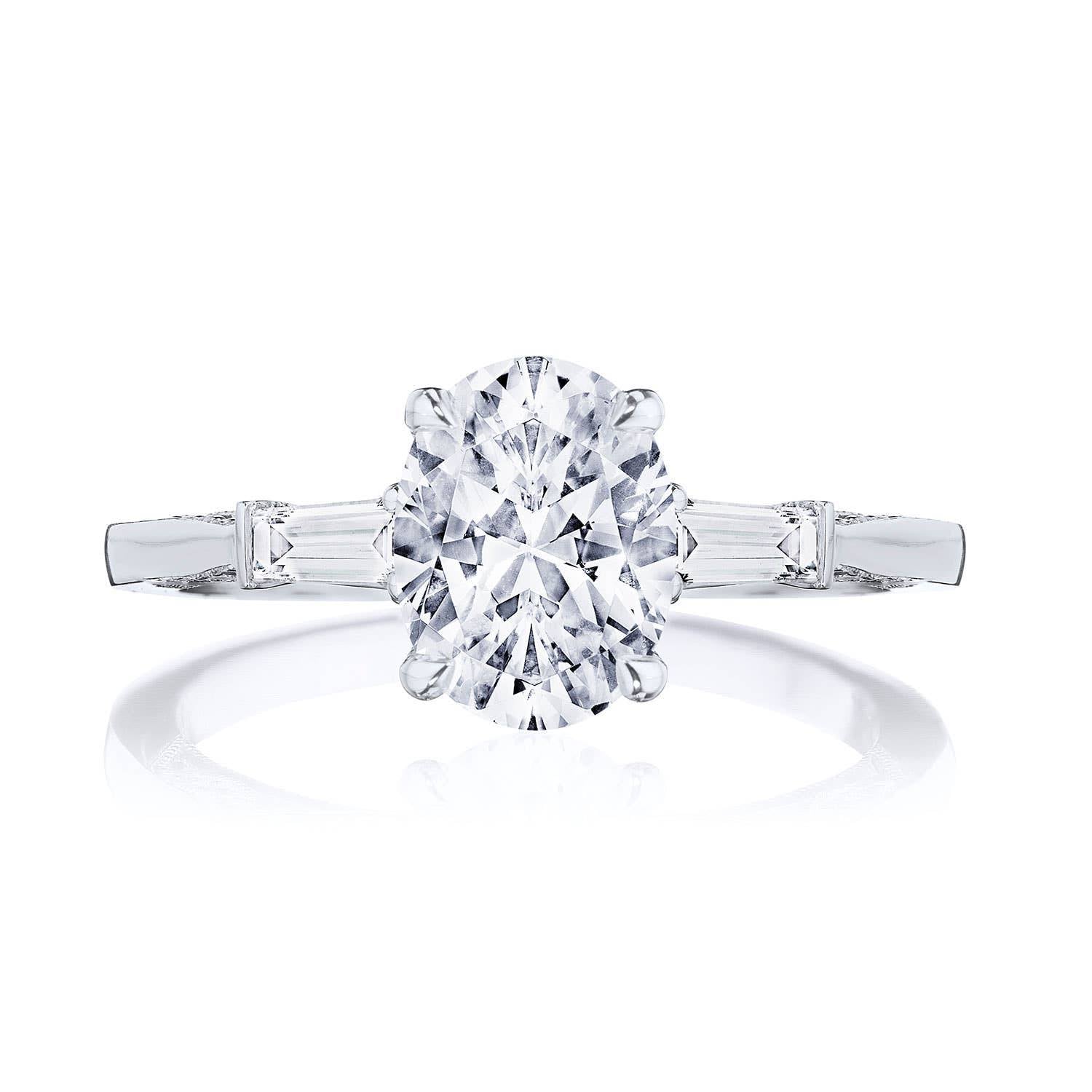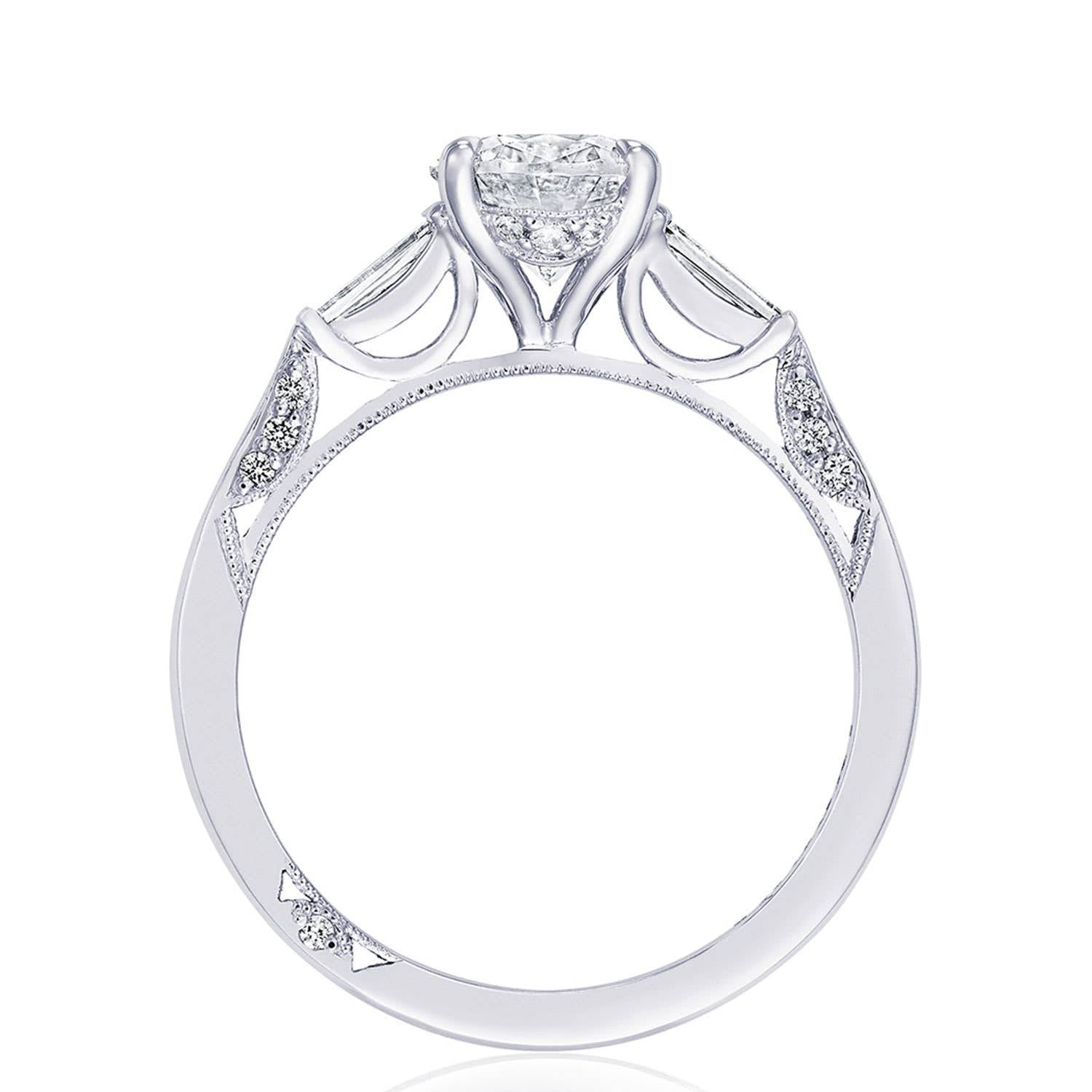 Baguette side stones accentuate the center stone, which sits on a Cathedral foundation with a hidden bloom. Simply Tacori crescent fabric adds diamond detailing to the innerface of the ring and complements the high-polish ceiling. Center Stone is not included.