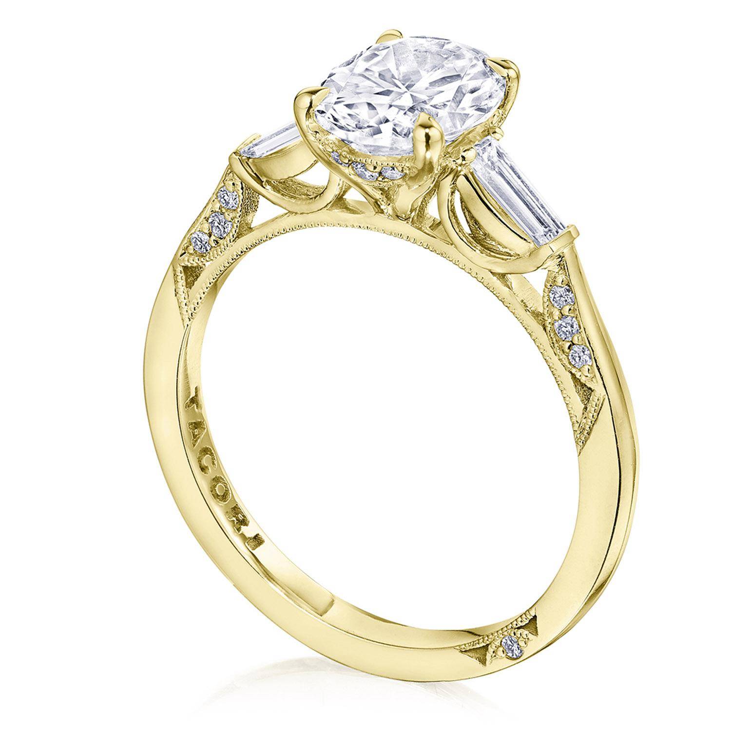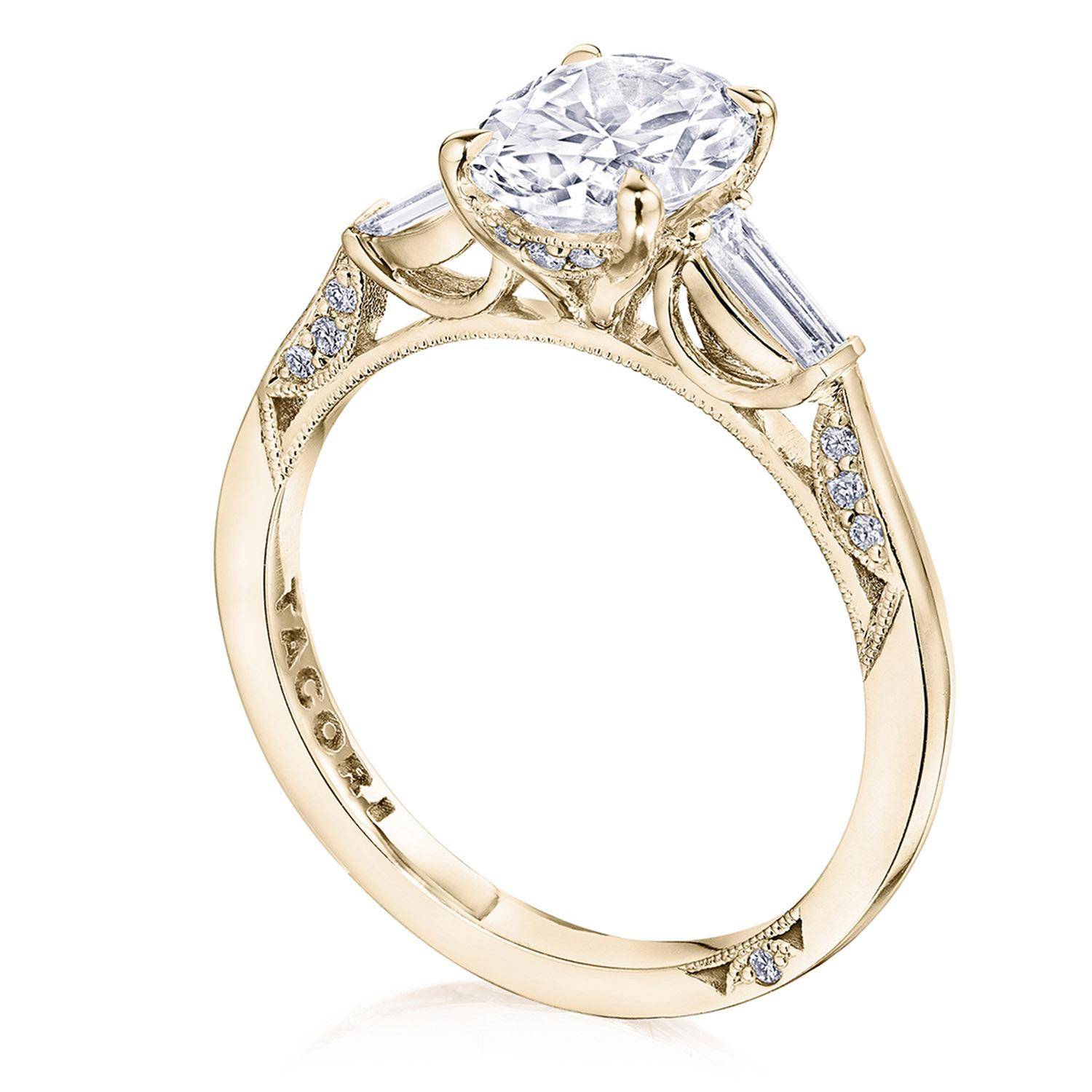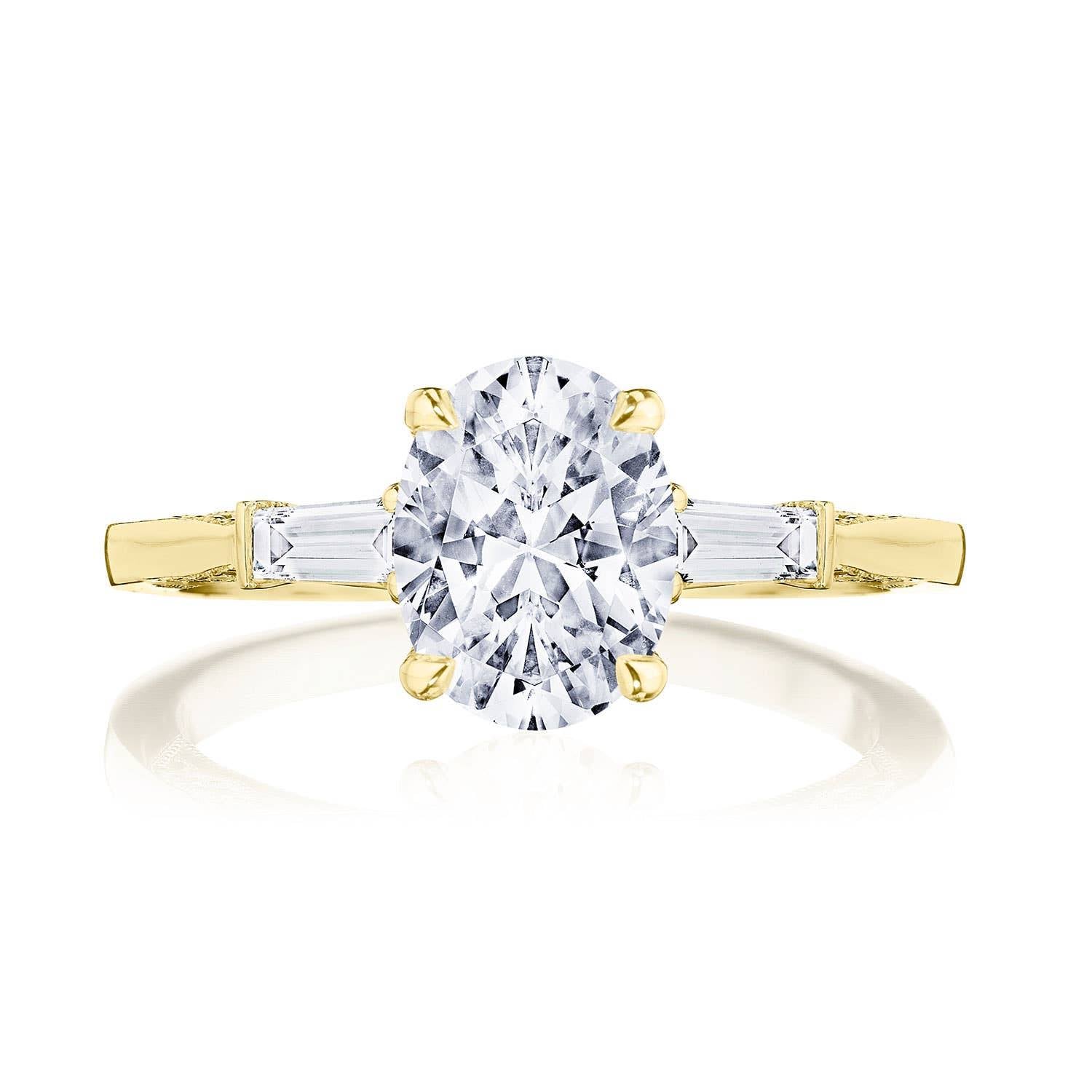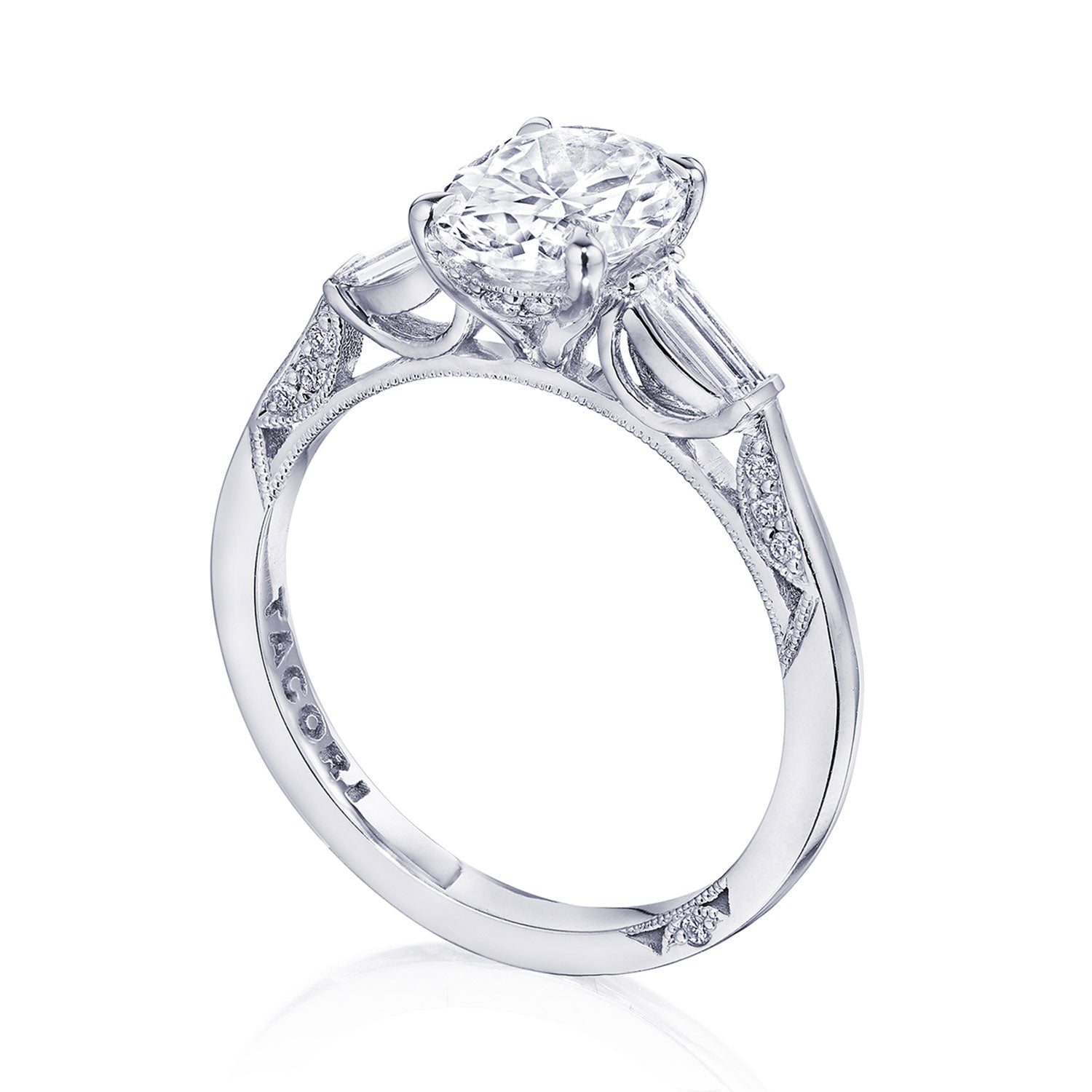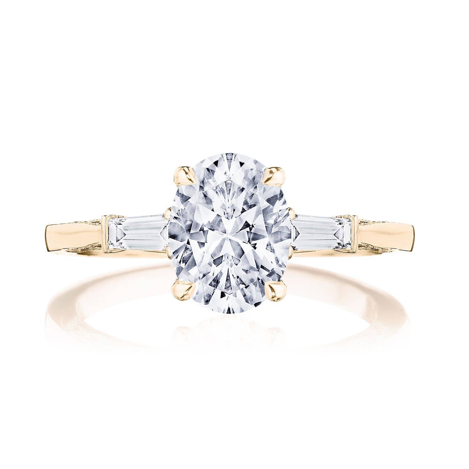 Baguette side stones accentuate the center stone, which sits on a Cathedral foundation with a hidden bloom. Simply Tacori crescent fabric adds diamond detailing to the innerface of the ring and complements the high-polish ceiling. Center Stone is not included.