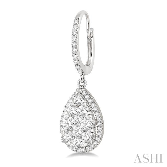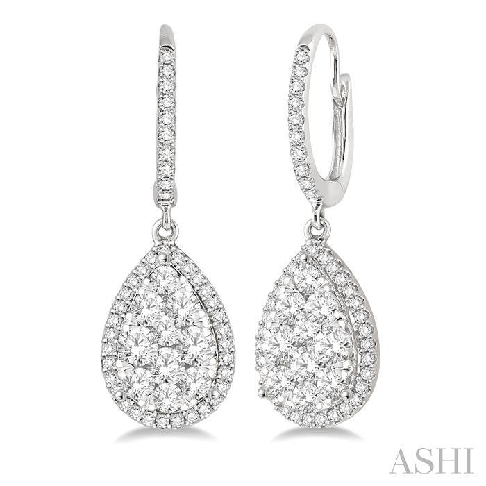 Elegant and simple, these diamond lovebright earrings ensembles with her style. Fashioned in 14 karat white gold, these earrings feature a center array of sparkling round cut diamonds in pear shaped design that are embellished by a frame of smaller round accent diamonds surrounds the center arrays, completing this sparkling design. 82 diamonds are set in invisible and prong setting. Total diamond weight is 1 1/2 ctw. Other metal types & colors may be available.