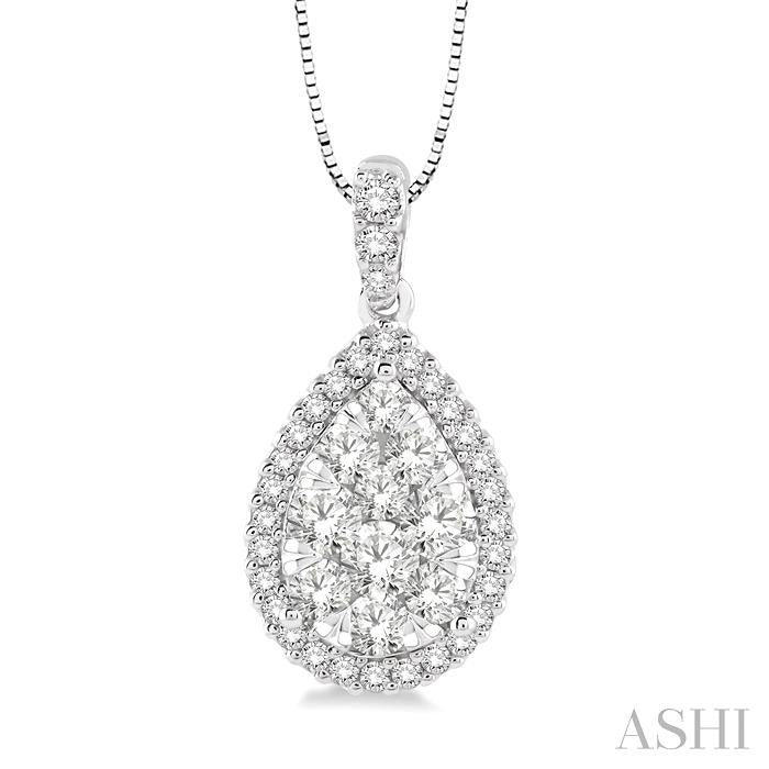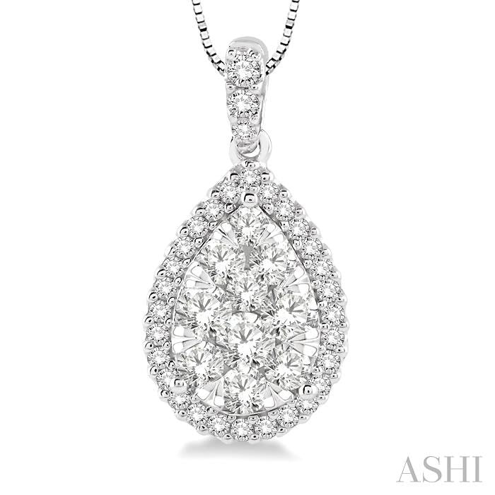 She will be elated at the look of this beautiful lovebright diamond pendant. Fashioned in 14 karat white gold, this pendant features a center array of sparkling round cut diamonds in pear shape design and embellished by a frame of smaller round accent diamonds surrounds the center arrays, completing this sparkling design. 42 diamonds are set in prong and invisible setting. This pendant hangs from a beautiful box chain. Total diamond weight is 1/2 ctw. Other metal types & colors may be available.