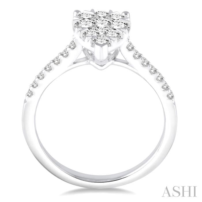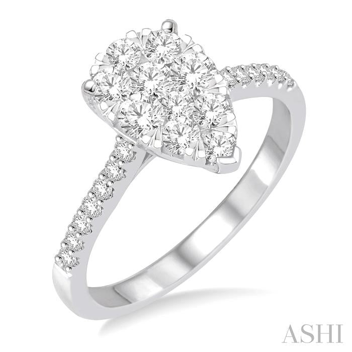 She will cherish the simple beauty of this scintillating diamond Lovebright ring. Styled in 14 karat shining white gold this pear shape ring showcases an array of 10 invisible set round cut diamonds at the center accented by 14 sparkling round cut bezel set diamonds that flow down the shank in a brilliant row. Total diamond weight is 3/4 ctw. Other metal types & colors may be available.