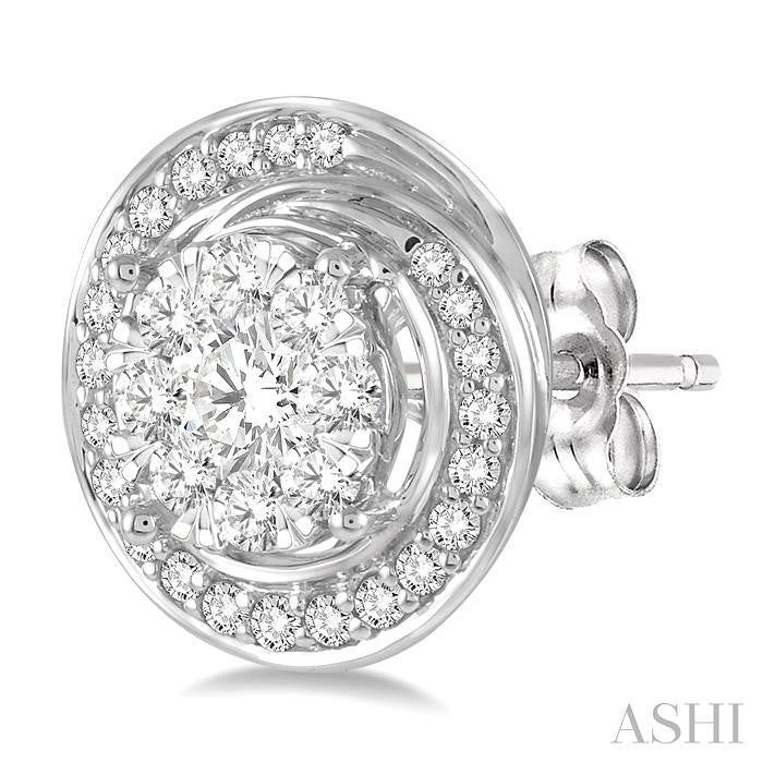 Show off your style with these diamond lovebright earrings. Fashioned in lustrous 14 karat white gold, these earrings are centered with a set of 18 invisible set shimmering round cut diamonds. A border of smaller 46 prong set round cut accent diamonds surrounds the center set in spiral design. These treats closes with a secure clasp. Total diamond weight is 5/8 ctw. Other metal types & colors may be available.