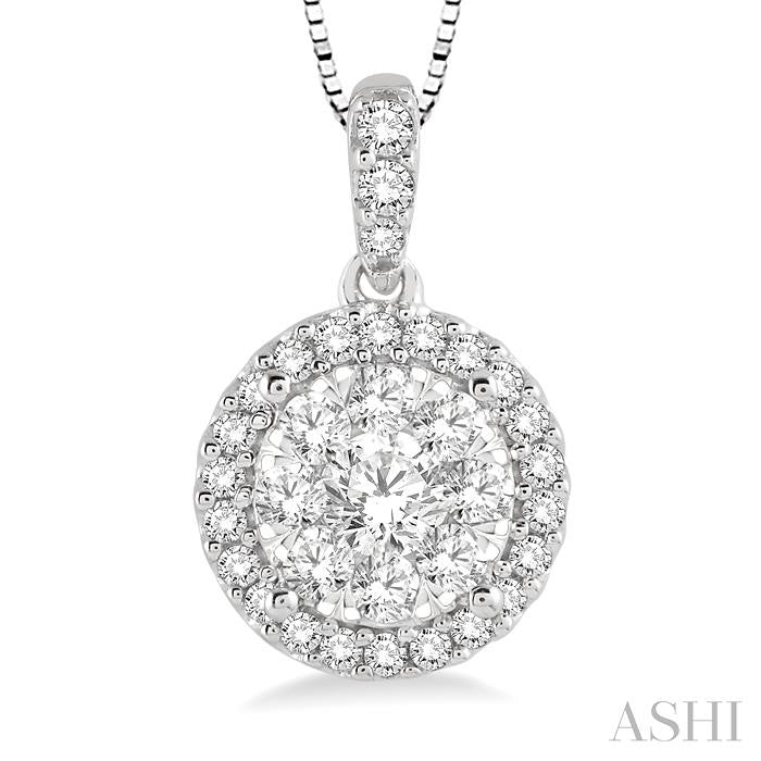 Add a little shimmer to her finger this diamond lovebright pendant. Fashioned in 14 karat white gold, this pendant features a center array of shimmering round diamonds set in a circular-shaped frame. A halo frame of smaller round accent diamonds surrounds this center array along with the front edge in sparkling design. 35 diamonds are set in invisible and prong settings. It suspends from a box chain. Total diamond weight is 1/3 ctw. Other metal types & colors may be available.