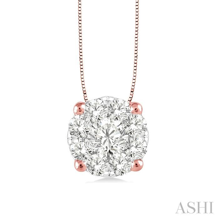 A captivating design, this lovebright diamond pendant is an exceptional gift for your sweetheart. Beautifully crafted in luminous 14 karat rose and white gold this gorgeous diamond pendant features 9 round cut diamonds, perfectly invisible set. This pendant hangs with a fashionable box chain. Total diamond weight is 1/2 ctw. Other metal types & colors may be available.