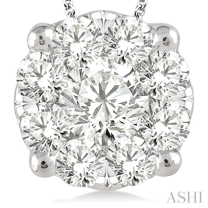 A captivating design, this lovebright diamond pendant is an exceptional gift for your sweetheart. Beautifully crafted in luminous 14 karat white gold this gorgeous diamond pendant features 9 round cut diamonds, perfectly invisible set. This pendant hangs with a fashionable cat chain. Total diamond weight is 2 ctw. Other metal types & colors may be available.