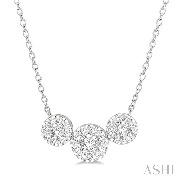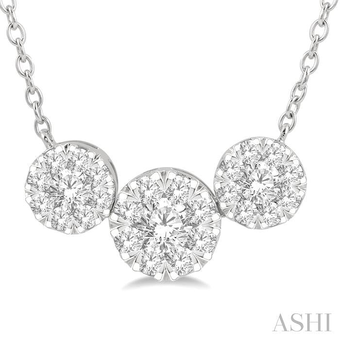 Even the simplest of Lovebright diamond necklaces offer elegance, and this one is no exception to it. A triple circular mount necklace, with a large mount in the center flanked by a smaller circular mount on either side, is seen featured here. A 1/3 ct round cut diamond sits in the center on the large mount, while 8 round diamonds surround it. Similarly, a 1/6 ct round diamond each decorates the center of the two smaller mounts, and is each haloed by 8 diamonds. All diamonds are invisible sets. A lobster lock and an 18-inch cat chain are attached to the necklace. The necklace is styled in 14-karat white gold. The total diamond weight is 1 1/2 ctw. Other metal types & colors may be available.
